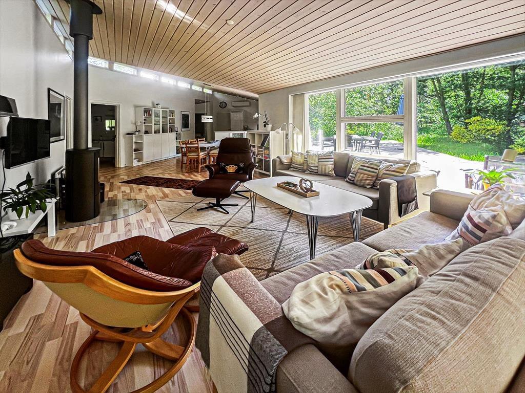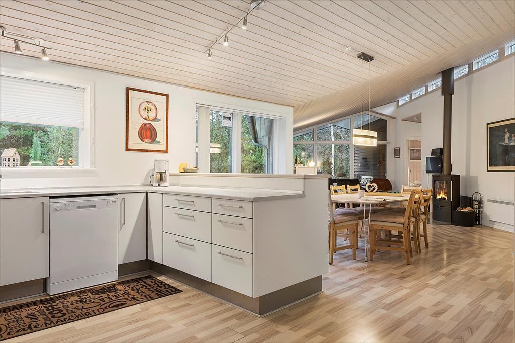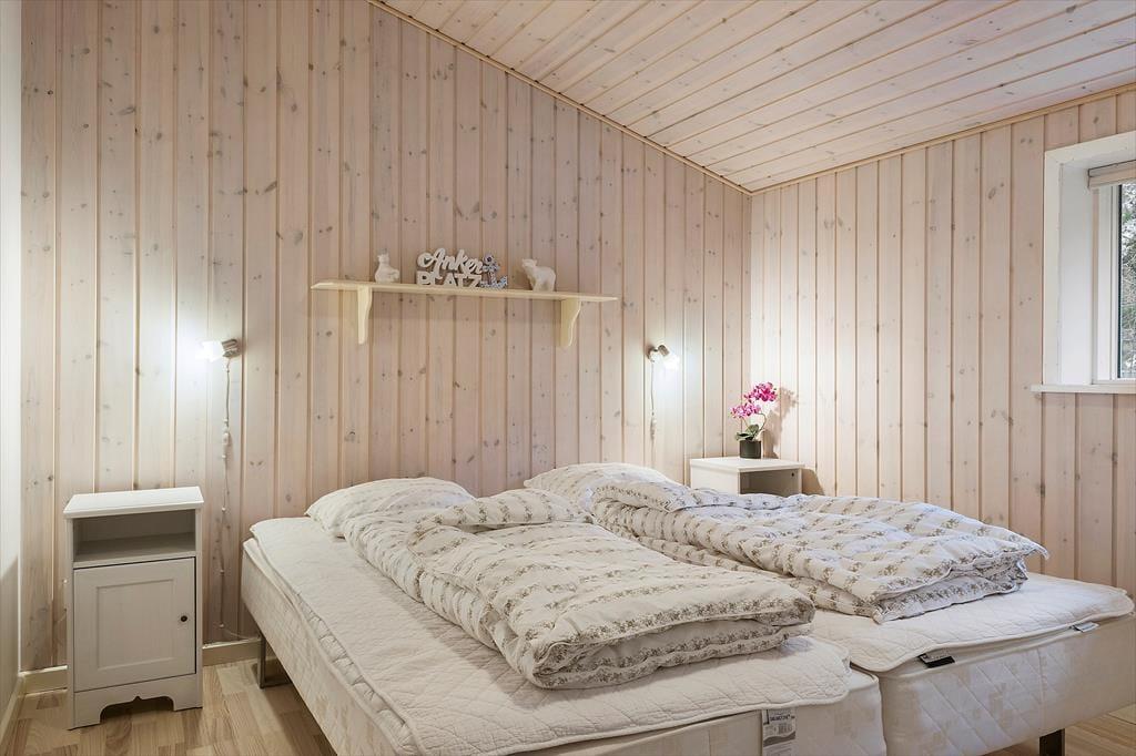 I sommerhuset, der er opført i 2009, kan du brede dig på hele 130 m², og indretningen er lys og indbydende. Planløsningen byder på to badeværelser og fire soveværelser, som alle er udstyret med komfortable dobbeltsenge og garderobeskabe, så selv sidstevælgerne kan se frem til at sove godt. På det ene badeværelse er der skruet ekstra op for luksusfornemmelsen, for her er der nemlig badekar og sauna, mens de praktiske hensyn er taget i entréen, som har vaskemaskine og tørretumbler samt god plads til sko og overtøj. Køkken og stue ligger i åben forbindelse, og det er et dejligt stort opholdsrum, så I alle kan samles – uanset om det er tid til at lave mad, spille brætspil ved spisebordet eller slappe af i sofaen med yndlingsserien i tv og ild i brændeovnen.