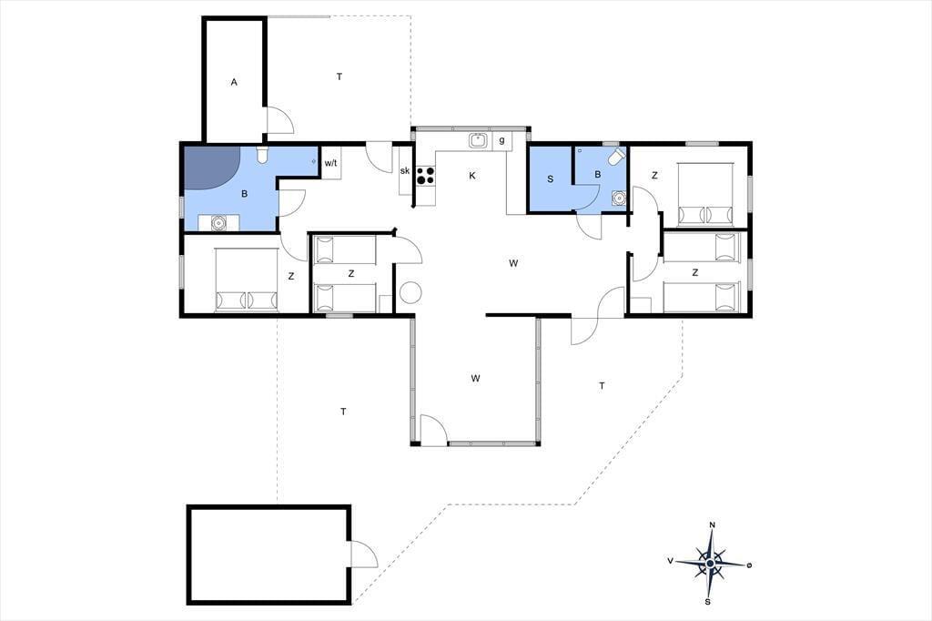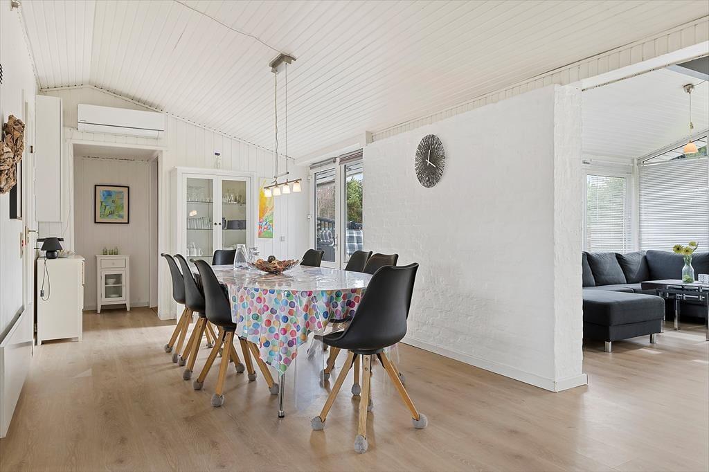 Centralt i sommerhuset ligger opholdsafdelingen, og med åbent køkken, langt spisebord og en rummelig sofakrog er det et helt oplagt sted at samles for at hygge igennem. Fladskærms-tv’et sørger for underholdning, når det er det, du trænger til, og hvis det er køligt udenfor, har du mulighed for at tænde op i brændeovnen og lade varmen sprede sig. Husets spabad og sauna, der er fordelt på de to badeværelser, inviterer også til wellness og selvforkælelse på kølige dage eller aftner, og når det er sengetid, har I fire gode soveværelser at gå til ro på. Soverum og badeværelser er for øvrigt fordelt i hver sin ende af huset, og sådan en planløsning gør det til en oplagt delebolig for to familier, der gerne vil holde ferie sammen.