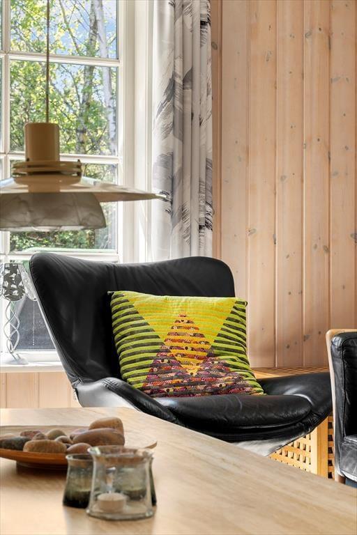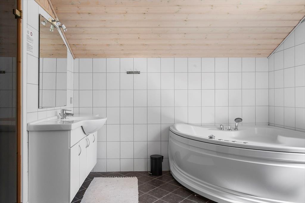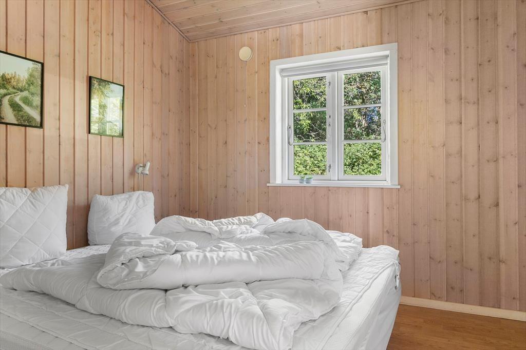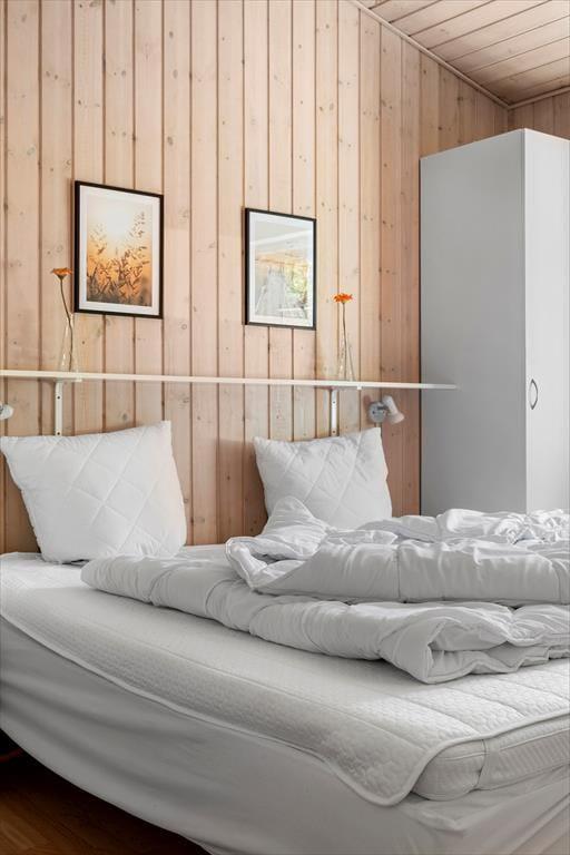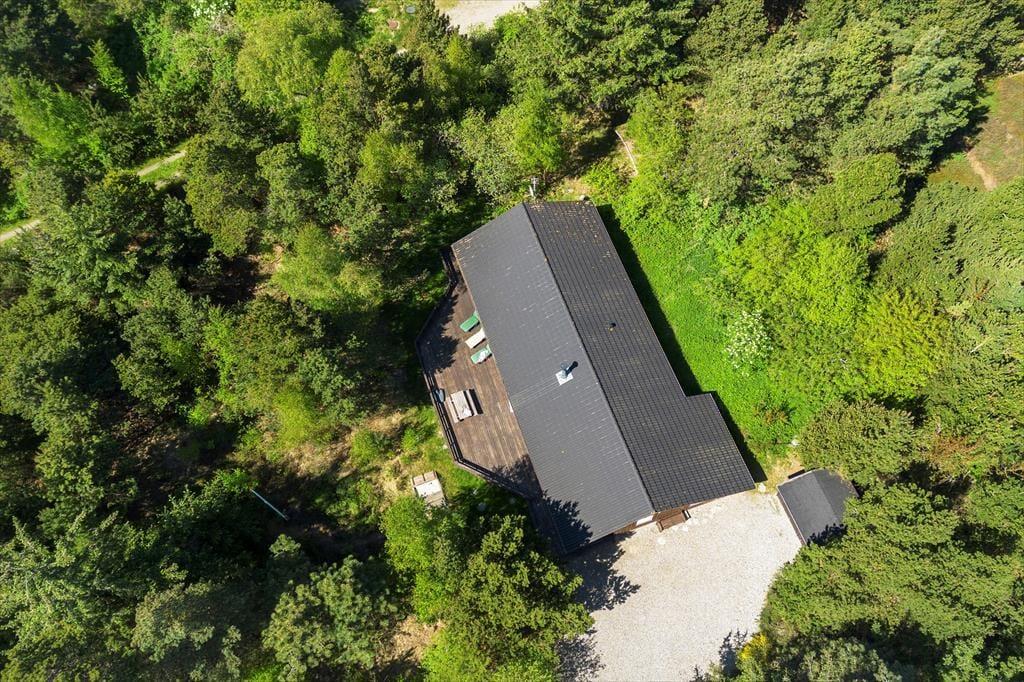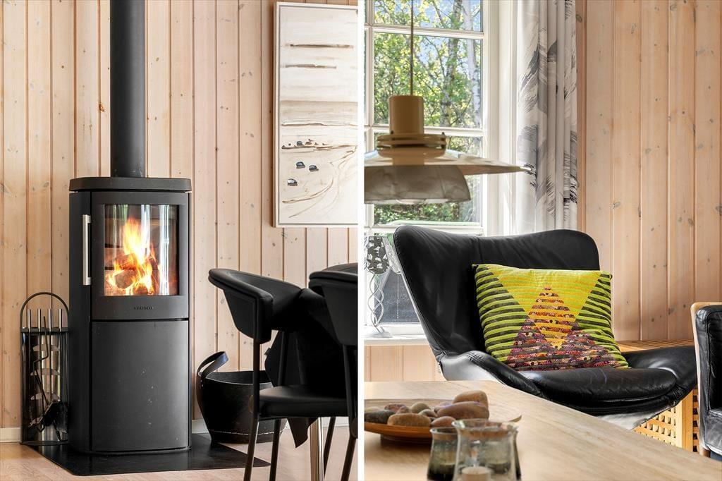 Dette hyggelige sommerhus folder sig ud med en dejlig grund, omkranset af høje træer, der skaber en naturlig afskærmning og giver en privat og fredelig atmosfære. Indenfor byder huset på en varm og indbydende atmosfære, hvor lyse trævægge og store vinduespartier inviterer naturen ind. Forestil dig at sidde foran pejsen med en kop varm kakao, eller ligge på sofaen om sommeren mens lydene fra naturen trænger ind gennem de åbne vinduer. Den velindrettede stue er kombineret med et moderne køkken og fra de komfortable soveværelser kan du vågne op med udsigten til den grønne have. Et af de to badeværelserne er udstyret med spa og sauna, perfekt til afslappende wellnessaftener, hvor du kan lade hverdagens problemer forsvinde i boblerne eller i den dejlige saunavarme.