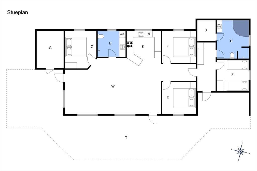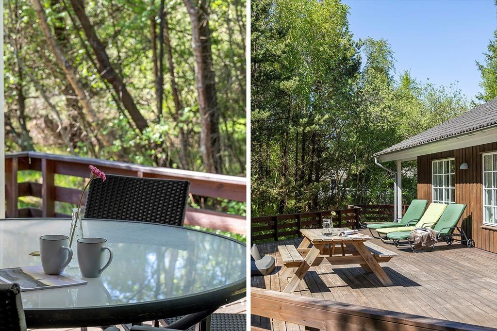 Det private udeareal på denne store, velholdte grund giver talrige muligheder for udendørs hygge. Her er der høje træer, der skaber dejlig læ og skygge, og en shelter, hvor du kan sove under stjernerne, når vejret tillader det. De mange terrasseområder er perfekte til solbadning, afslapning med en god bog eller for at nyde din morgenkaffe foran den grønne baghave. Den store have indbyder til børneleg, med gyngestativ, sandkasse og plads til boldspil eller blot at ligge i liggestolene og lade tankerne flyde. Omgivelserne skaber en fredfyldt ramme for den perfekte ferie, hvor du virkelig kan mærke roen og nyde den friske havluft.