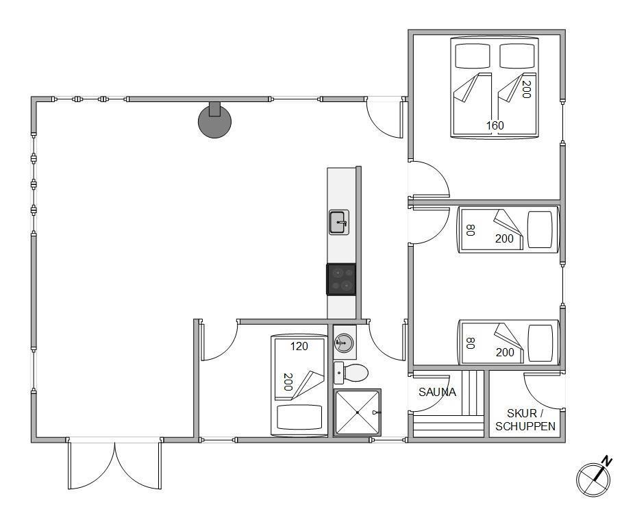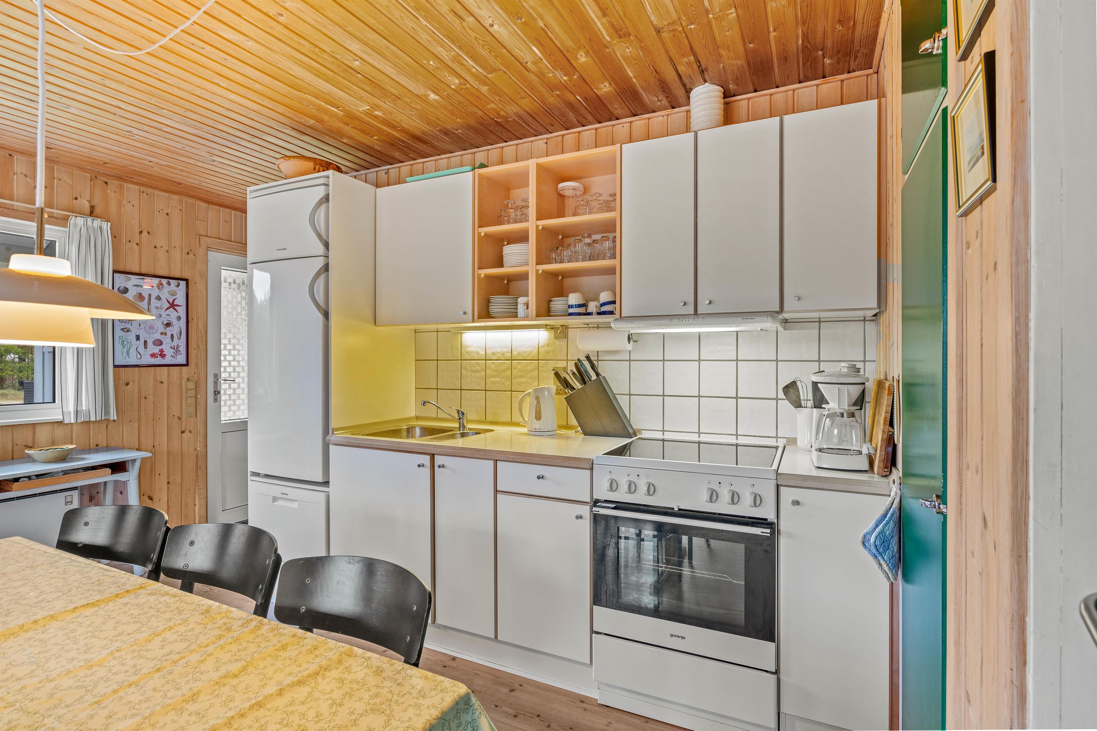 Sommerhusets hjerterum består af køkken, spiseplads og stue i ét, hvor I alle kan samles til hyggelige stunder. Her er der en brændeovn, som på en kølig dag spreder dejlig varme samt en ekstra hyggelig feriestemning. Derudover er der også en varmepumpe i feriehuset, som I med fordel kan benytte jer af til at holde en behagelig temperatur.