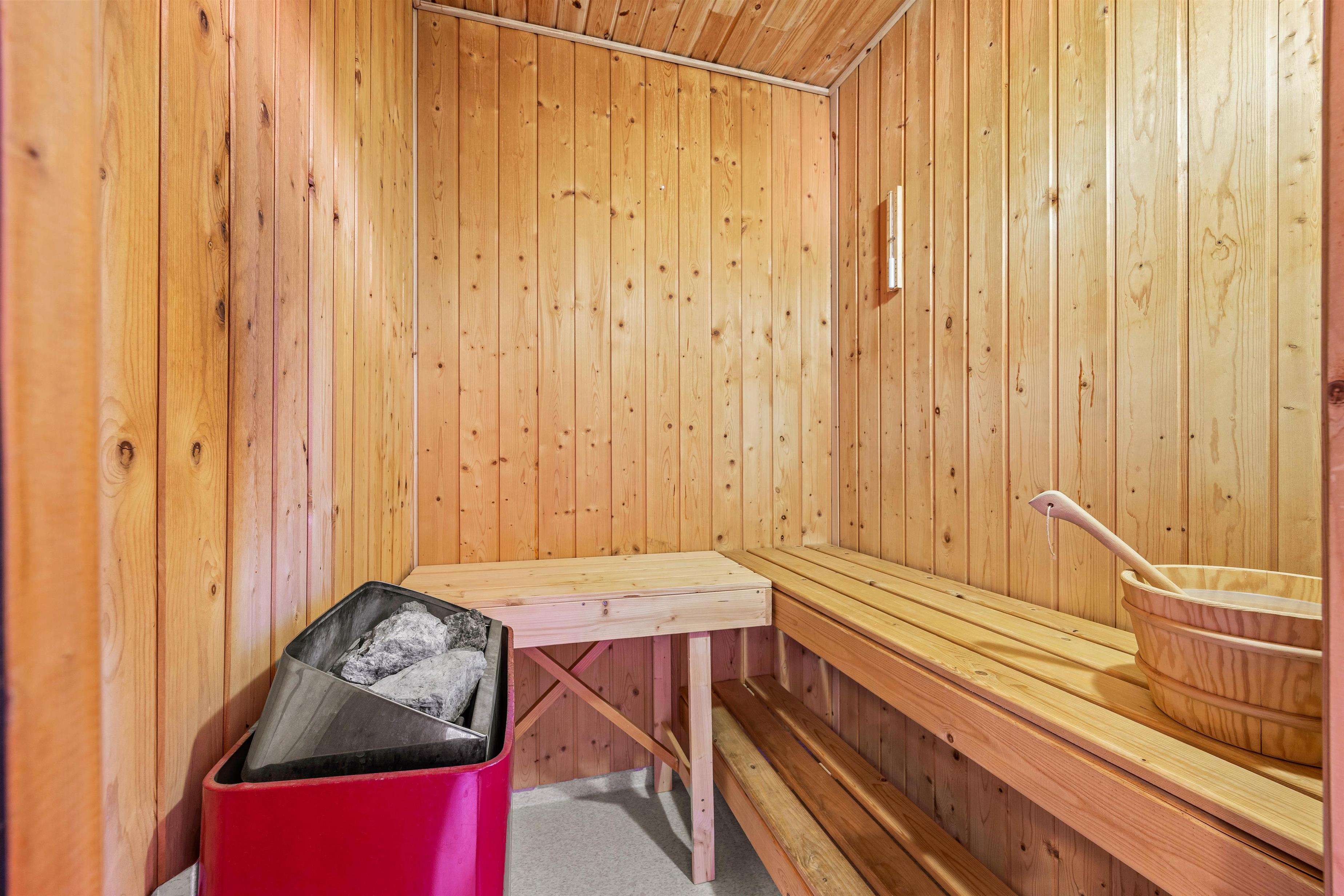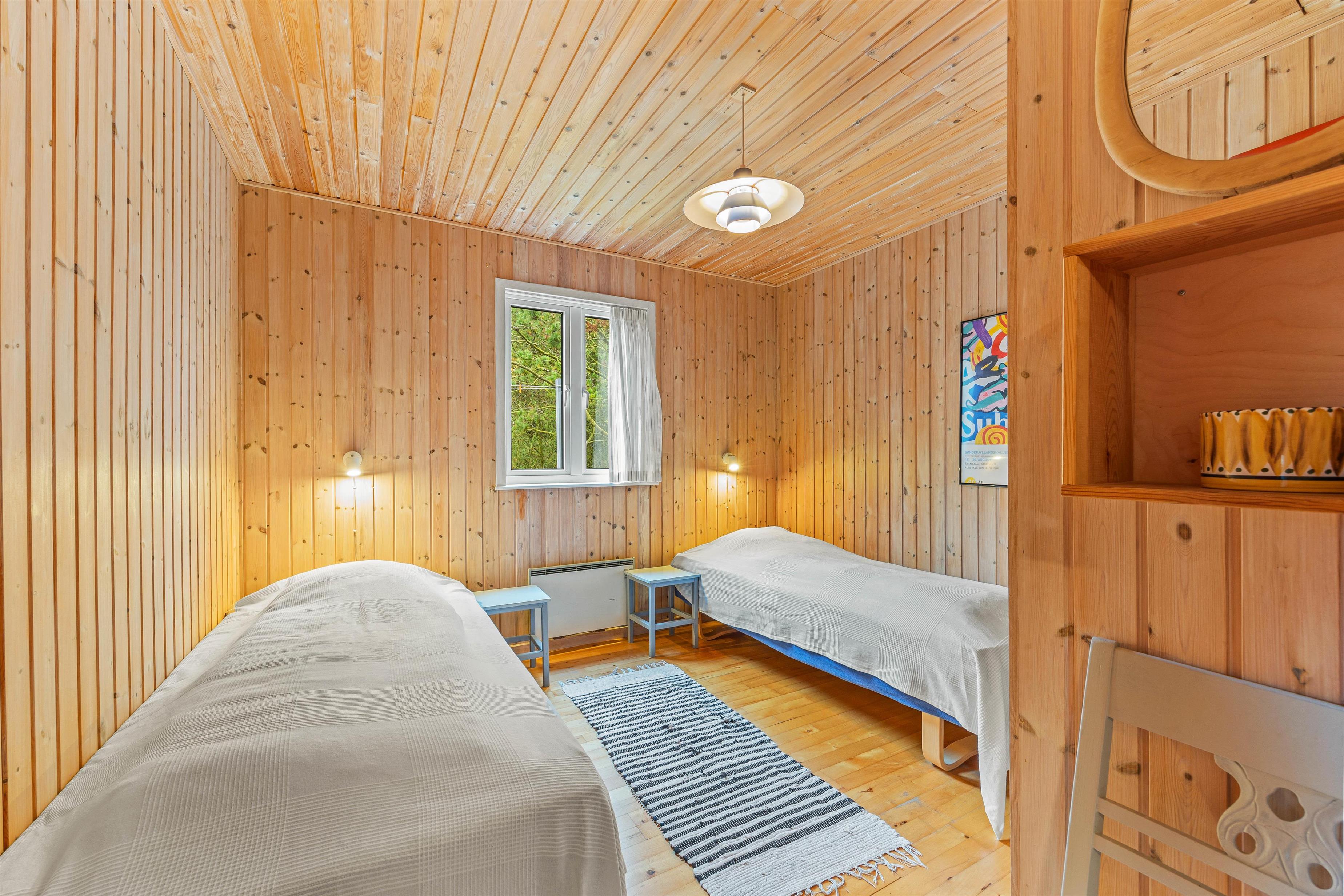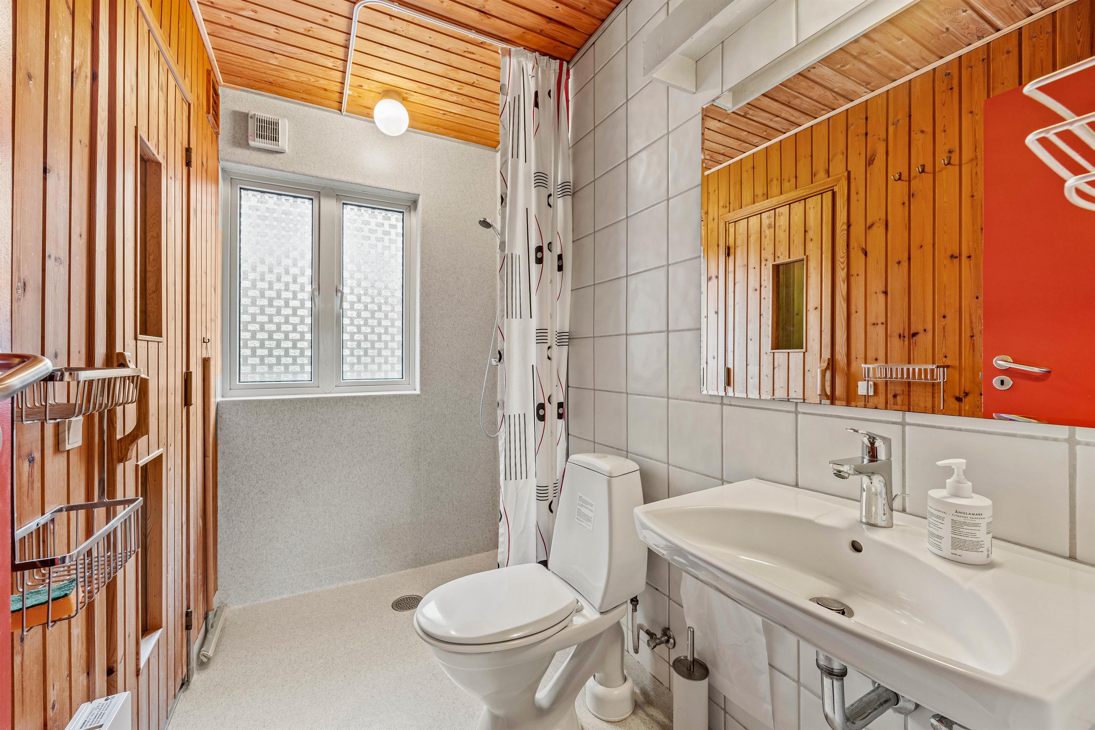 Sommerhusets badeværelse har gulvvarme, og herfra har I også adgang til saunaen, som er et af sommerhusets highlights. Efter en god feriedag i naturen og den friske luft, findes der intet bedre end at sætte sig ind i varmen og nyde en afslappende stund.
