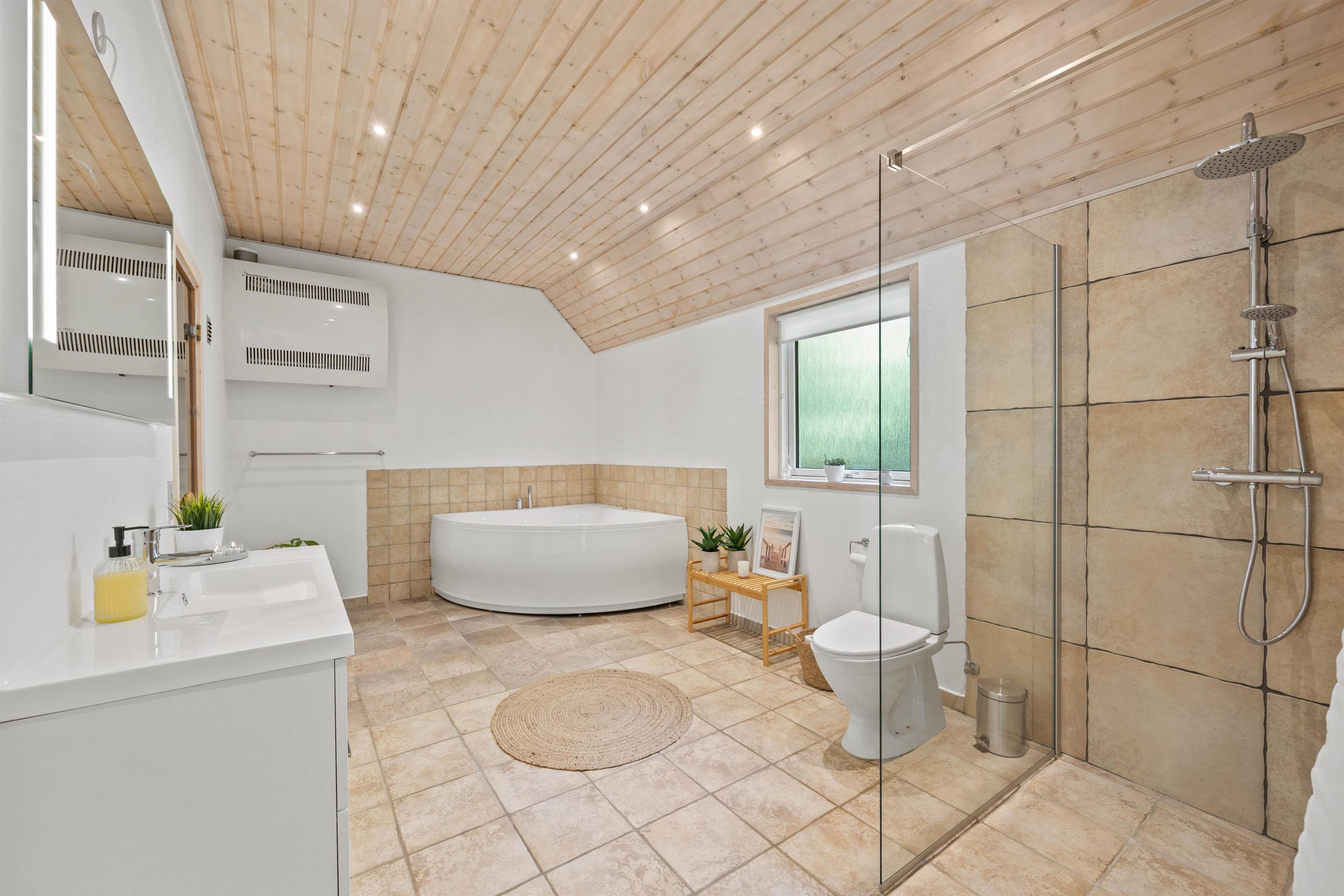 Du finder I dette rummelige sommerhus 5 soverum med henholdsvis 3 dobbeltsenge og 4 enkeltsenge. Derudover er der 2 badeværelser med gulvvarme. De praktiske gøremål kan også nemt løses i dette sommerhus, da der både er opvaskemaskine, vaskemaskine og tørretumbler.