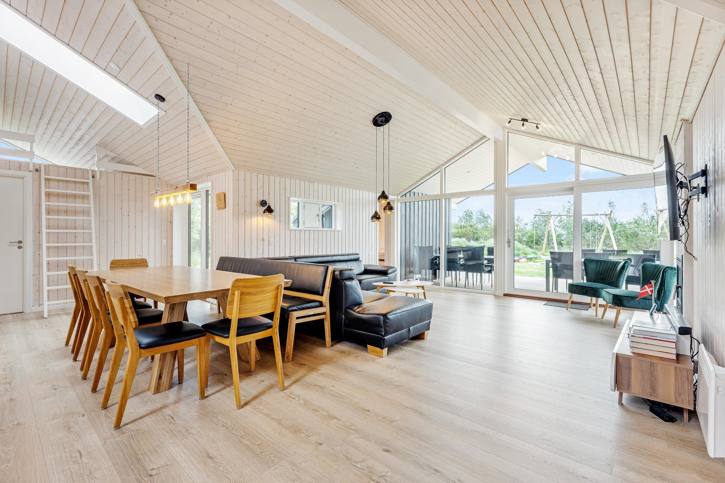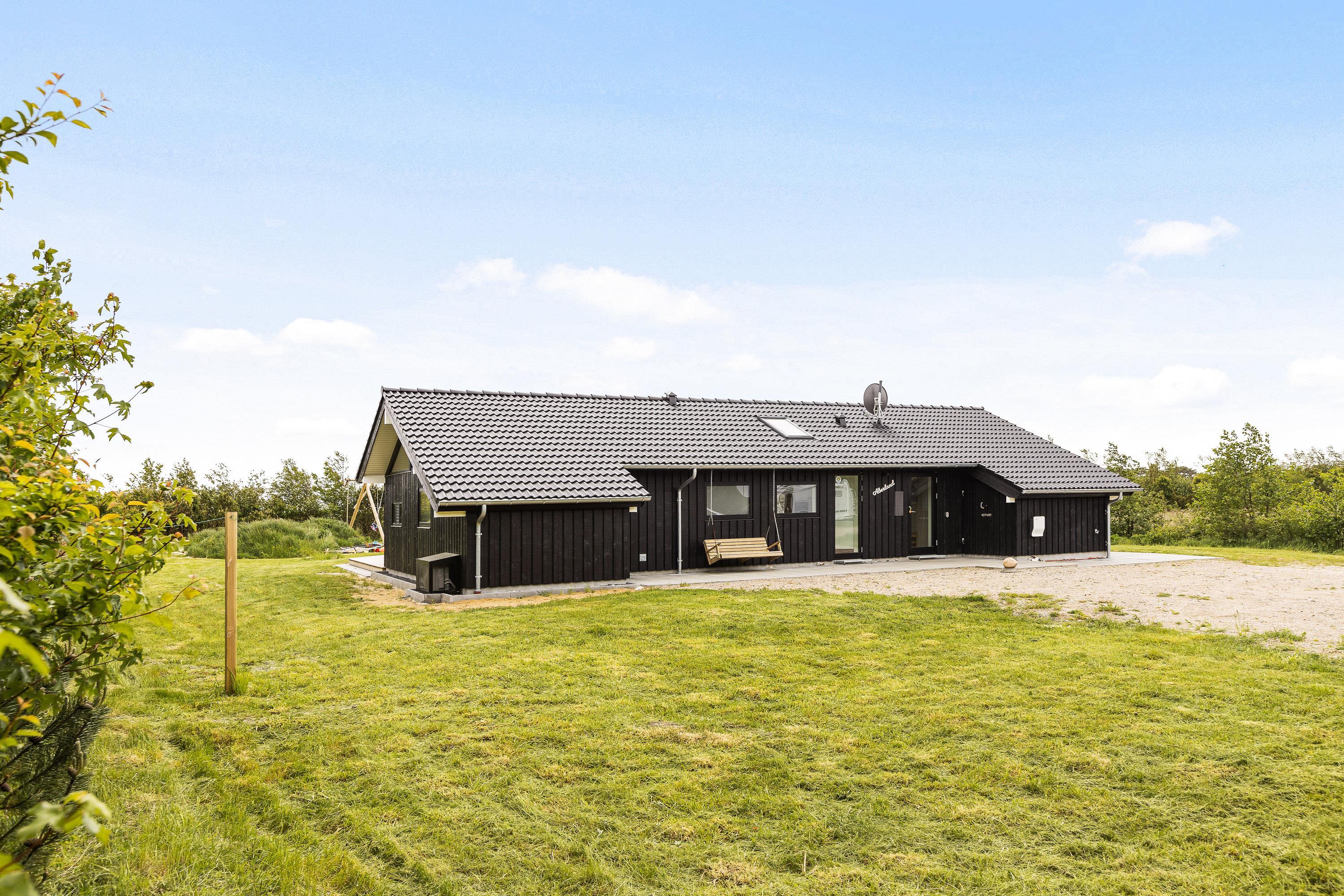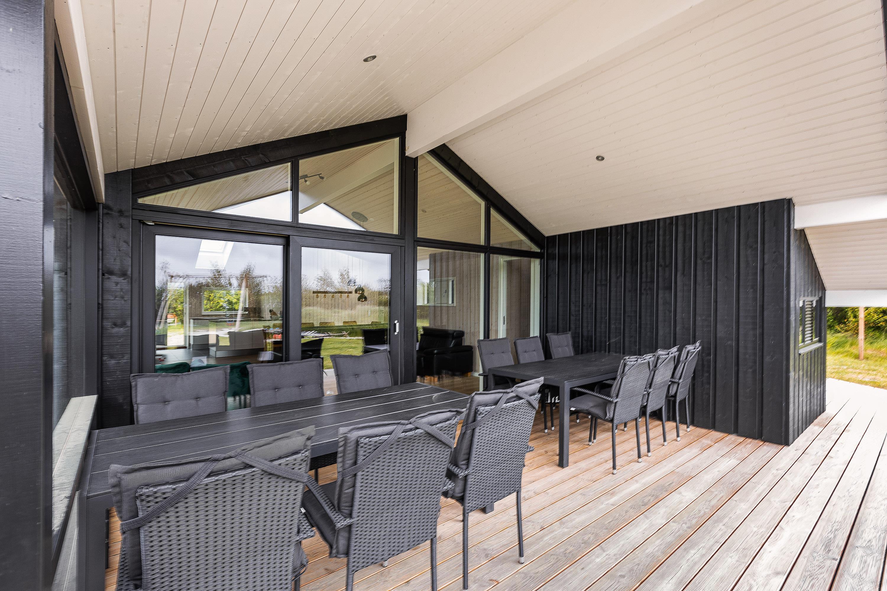 Det moderne feriehus er næsten komplet omgivet af terrasser. Den delvise overdækning betyder, at du altid kan finde en beskyttet plads på terrassemøblerne af høj kvalitet. Her kan du blandt andet læse en god bog på Hollywood-gyngen eller slappe af, mens børnene leger. Der er spændende legemuligheder for de små og masser af plads til at boltre sig på.