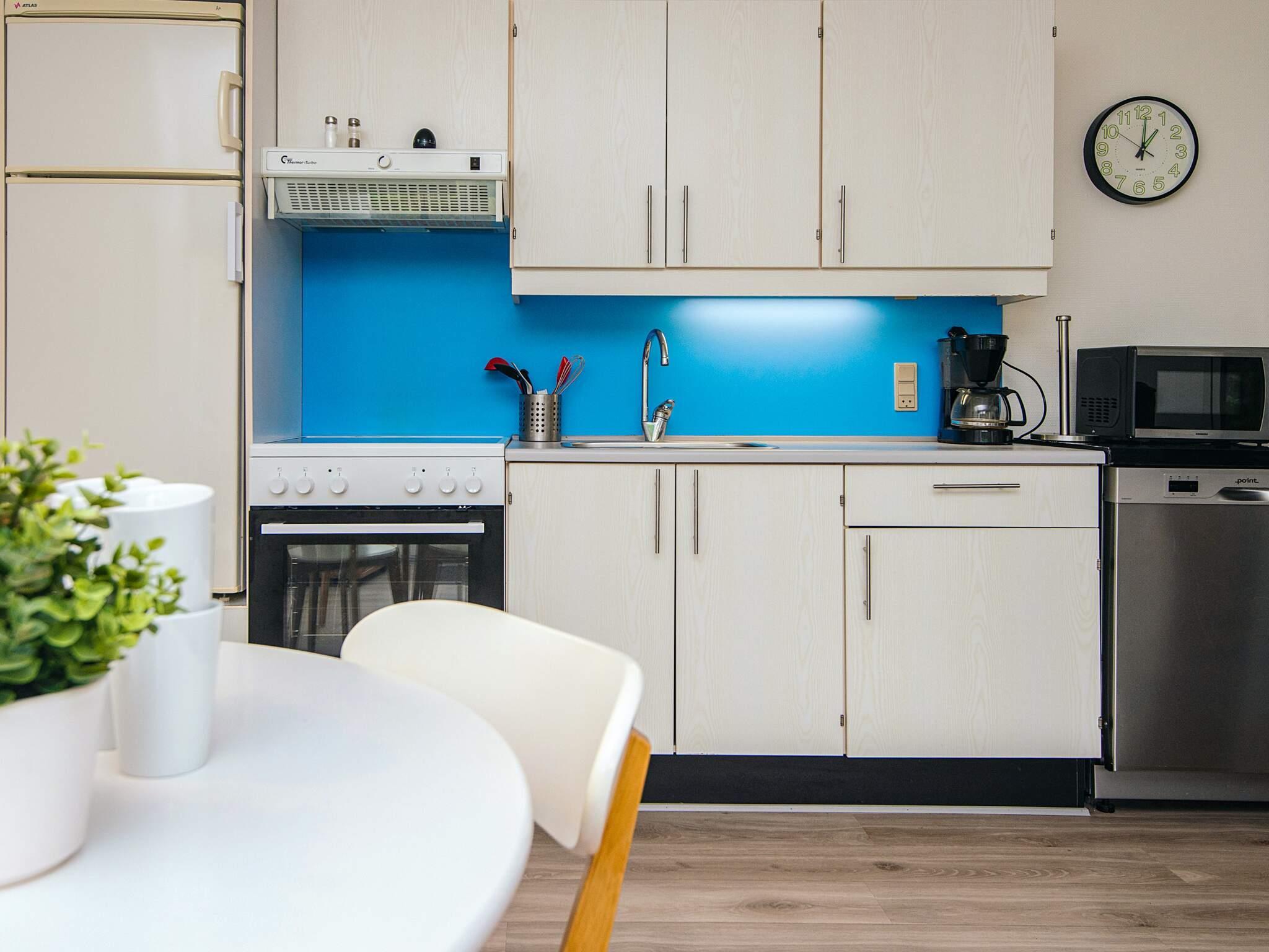 Køkken: El-komfur, køleskab m/frostboks, mikroovn, kaffemaskine, opvaskemask.