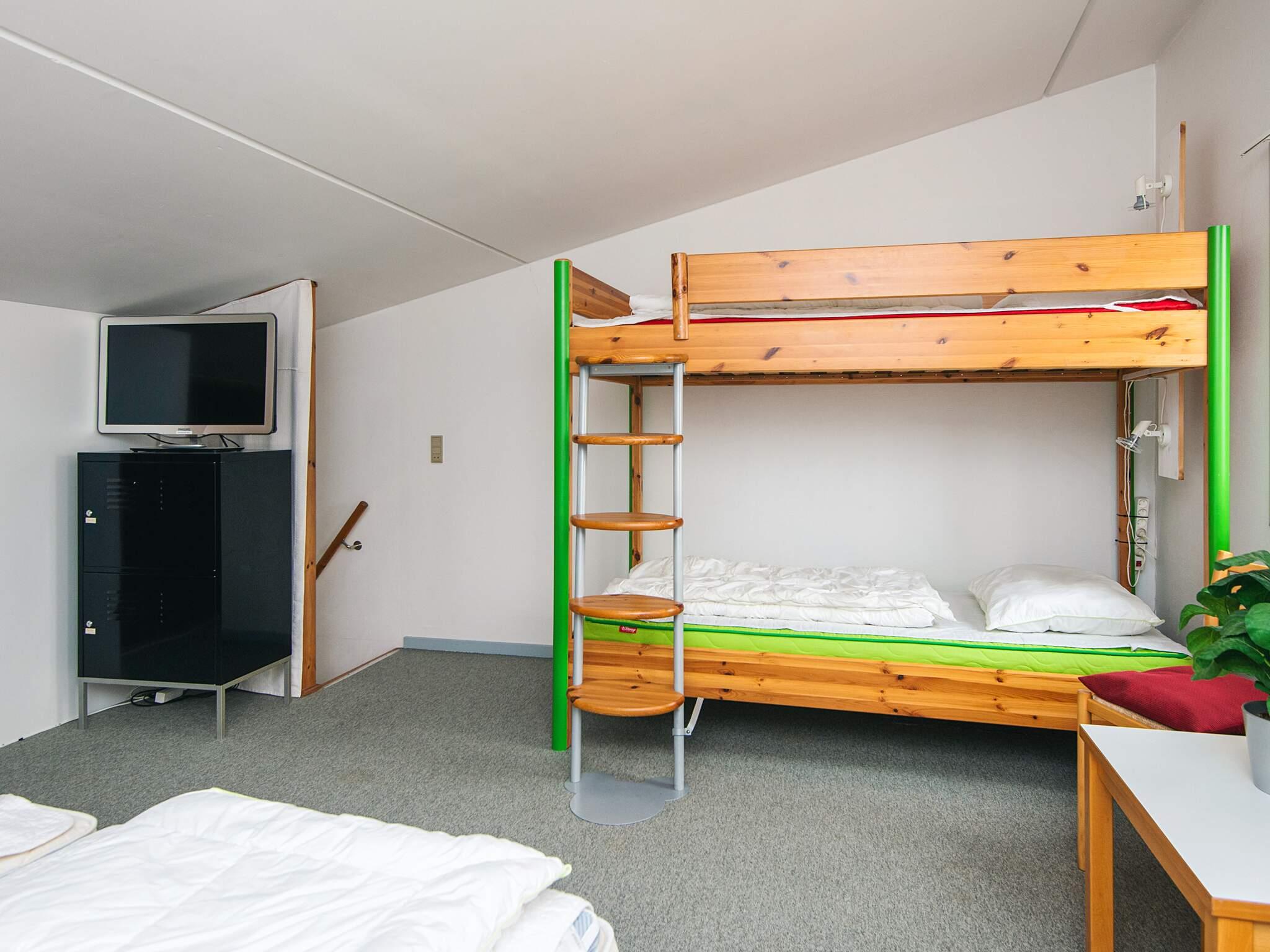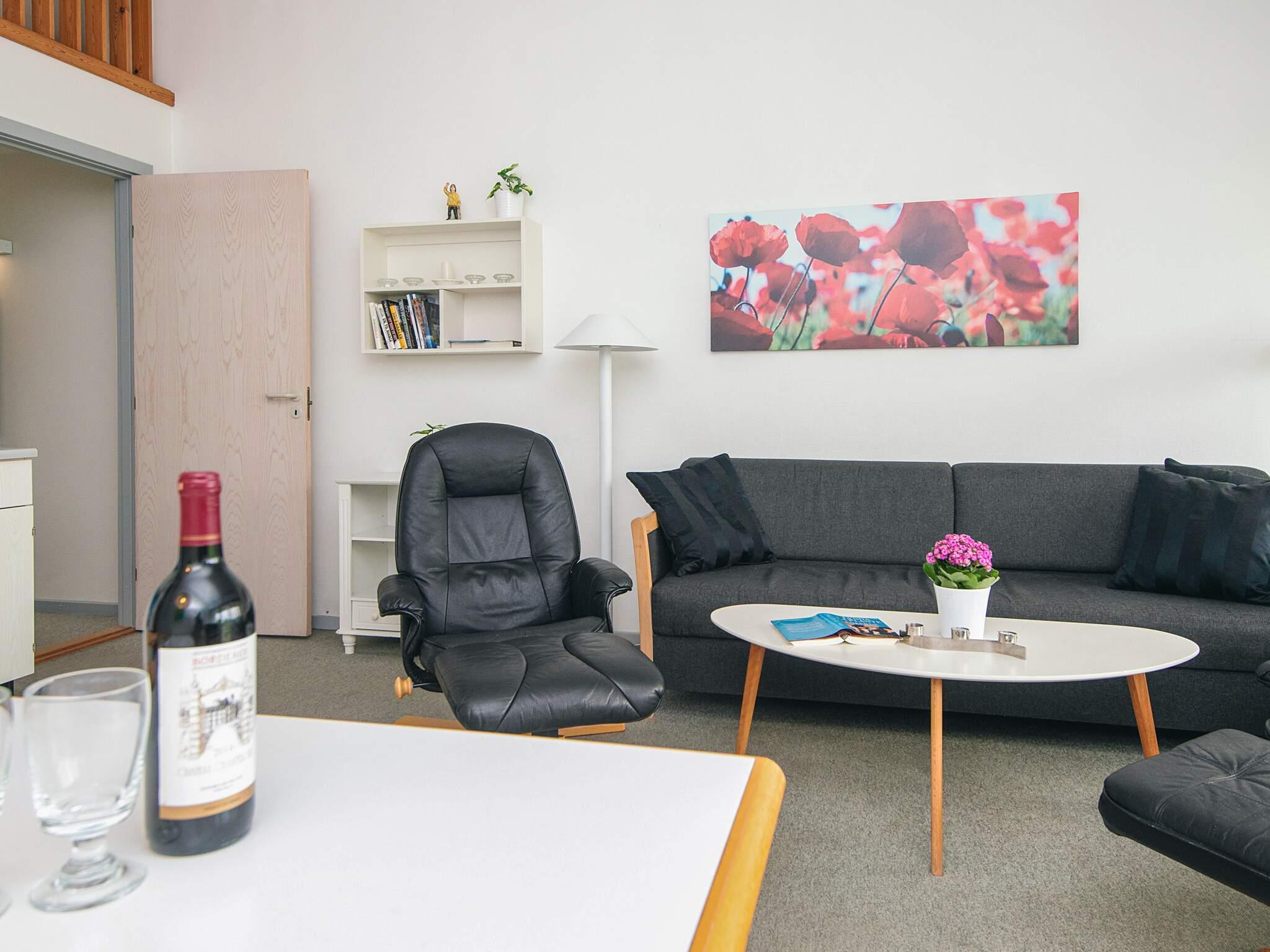 Lejligheden ligger på 1. sal og tilbyder fleksible sovemuligheder. Der er et soveværelse med to enkeltsenge, der kan slås sammen til en dobbeltseng, og en hems under taghældningen med en dobbeltseng og en køjeseng, ideel til børn. Stuen er indrettet med en sovesofa og to ekstra senge, hvilket gør det nemt at imødekomme forskellige behov. Det åbne køkken og opholdsstue skaber et hyggeligt rum til fælles måltider og afslappende aftener. Herfra har du direkte udgang til en overdækket terrasse, hvor du kan nyde den friske havbrise og stemningen i kystbyen.