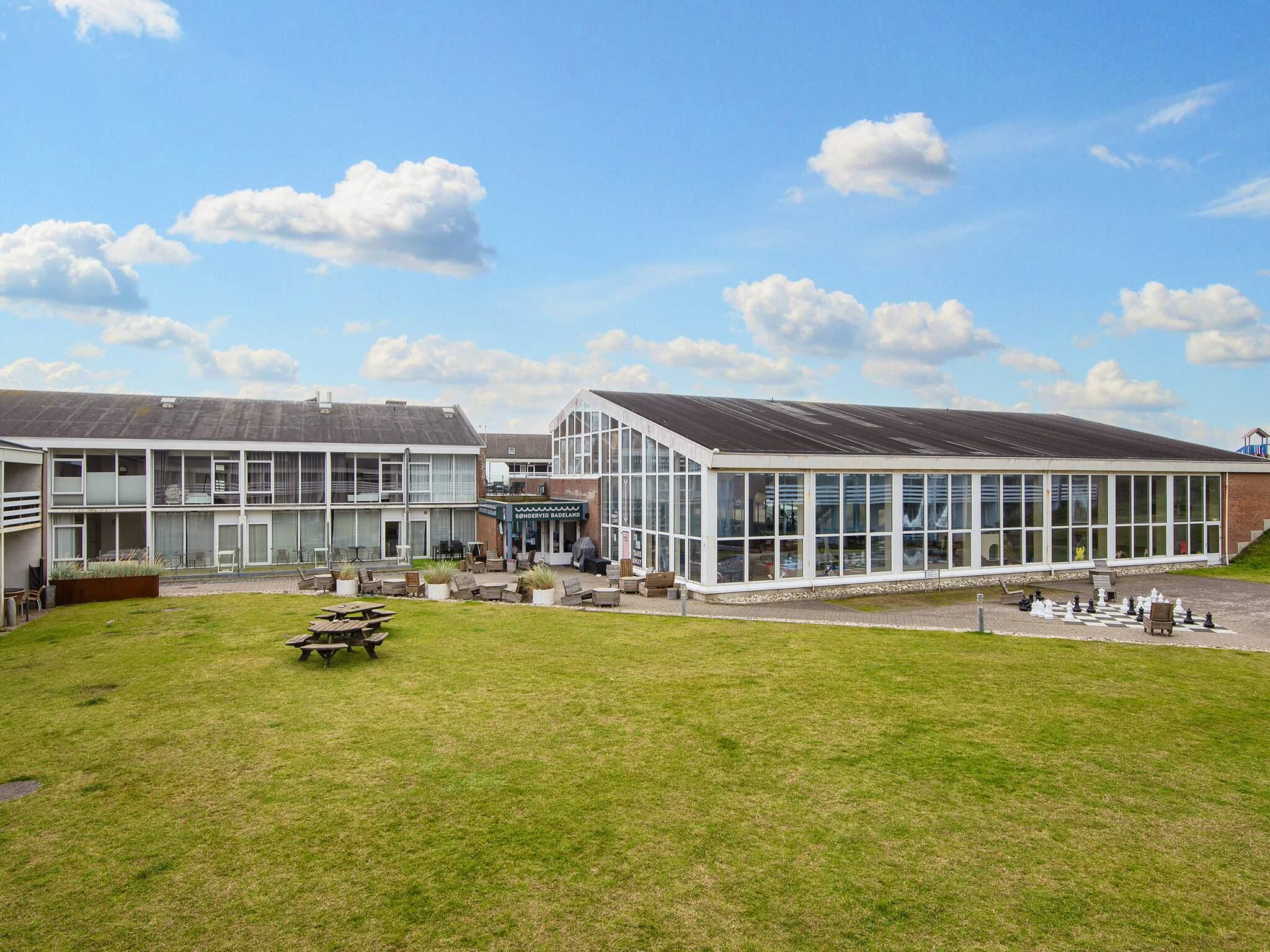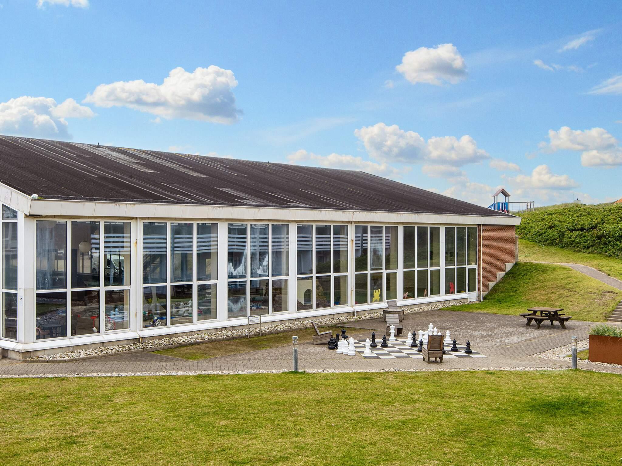 Fra den private terrasse har du udsigt over de livlige omgivelser, herunder en café og et stort udendørs skakbræt, der bidrager til feriecharmen. Selve terrassen er et behageligt sted for morgenkaffe, afslappede måltider eller blot at nyde den friske kystluft.