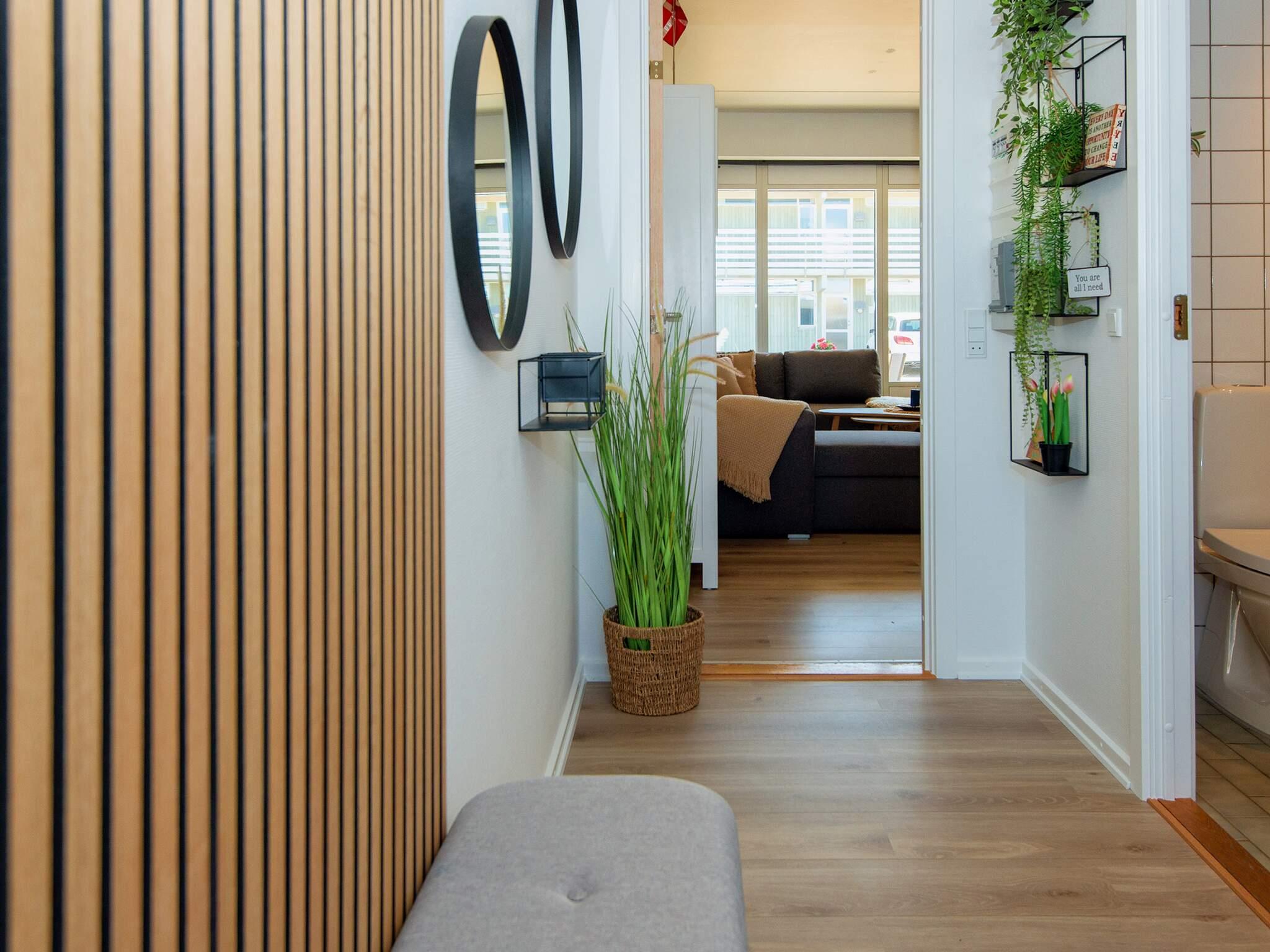 Lejligheden ligger i stueetagen og har et åbent køkken og opholdsstue med store vinduer og en havedør, der fører til en lille overdækket terrasse. Herfra kan du nyde Nordsøens beroligende lyde, mens du slapper af udendørs. Opholdsområdet omfatter en sovesofa til to ekstra gæster. Soveværelset indeholder en dobbeltseng og en køjeseng med to 160 cm lange senge, velegnet til to børn.