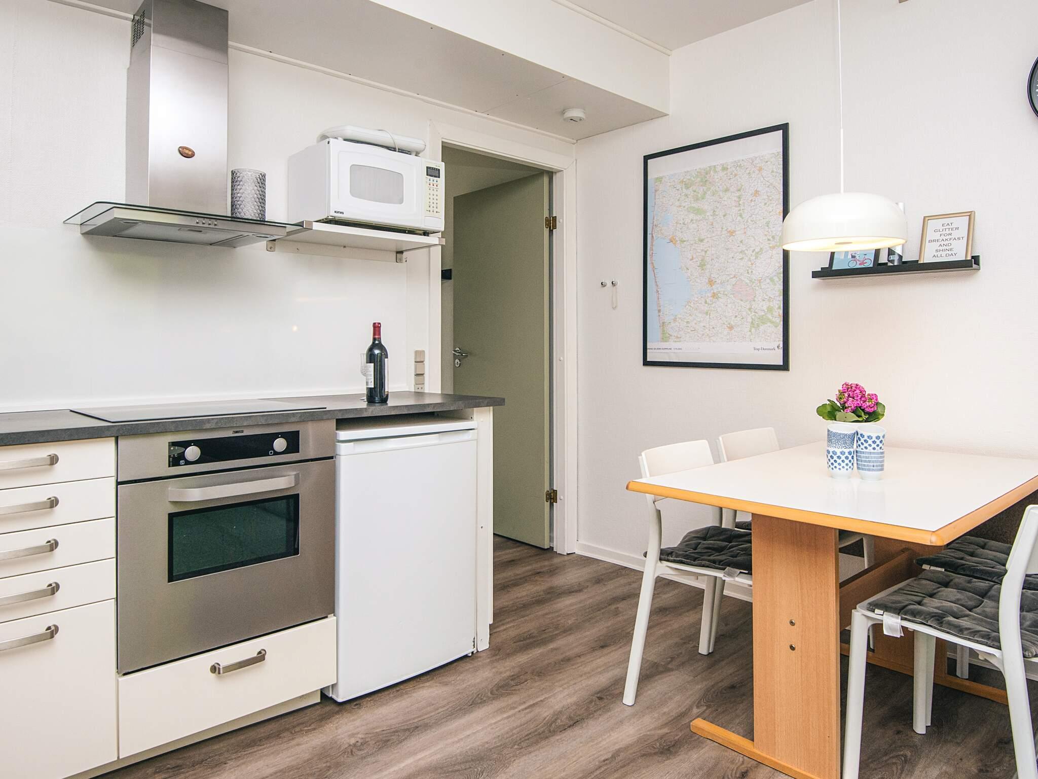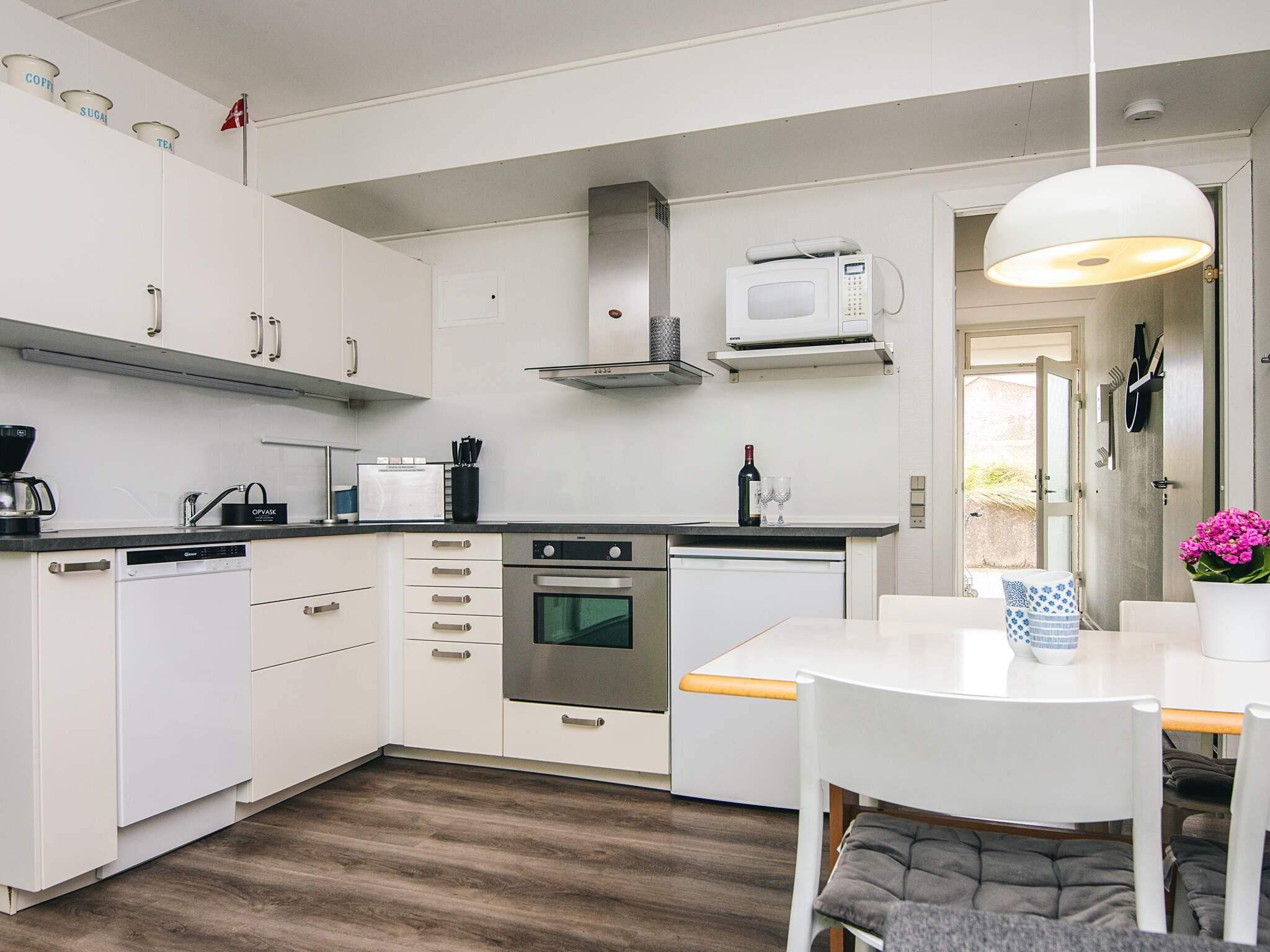 Køkken: El-komfur, køleskab m/frostboks, mikroovn, kaffemaskine, opvaskemask.