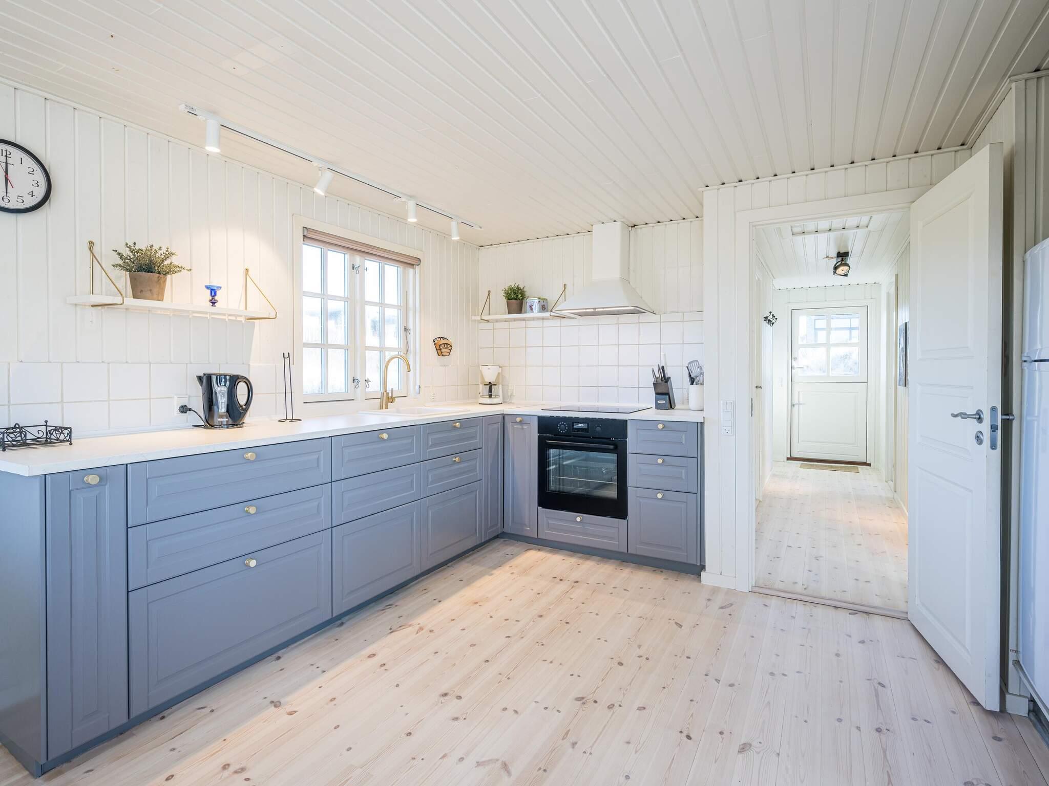 Indendørs byder huset på en lys og venlig atmosfære med gennemgående lyse trægulve og hvide træpaneler, som skaber en klassisk og indbydende sommerhusstemning. Køkkenet ligger i åben forbindelse med stuen, hvor den originale murede pejs sørger for både varme og hygge – perfekt til hyggelige aftener efter en lang dag i naturen.