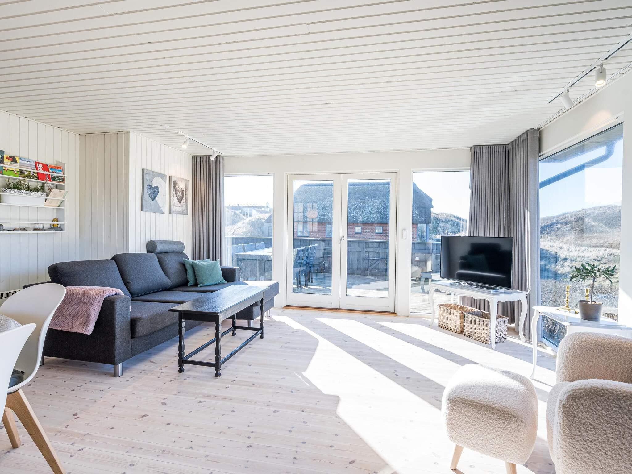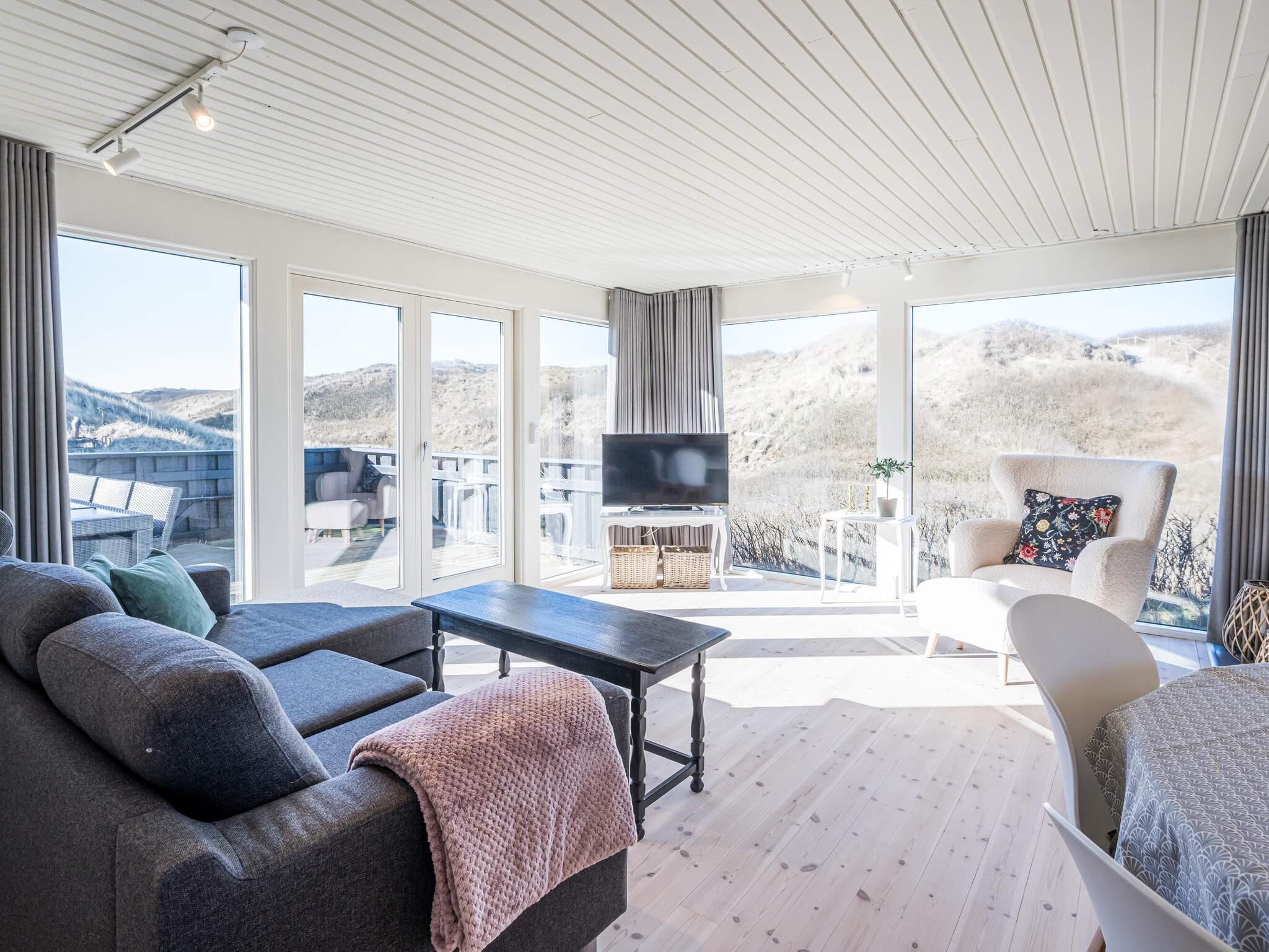 Fra stuen er der direkte udsigt og udgang til klitlandskabet – her fornemmer du naturens nærvær, uanset årstid. Udenfor venter en læfyldt træterrasse, hvor du kan nyde solen, stilheden og ikke mindst lyden af havet, der aldrig er langt væk. Terrassen indbyder til både afslapning, grillhygge og lange sommeraftener under åben himmel.