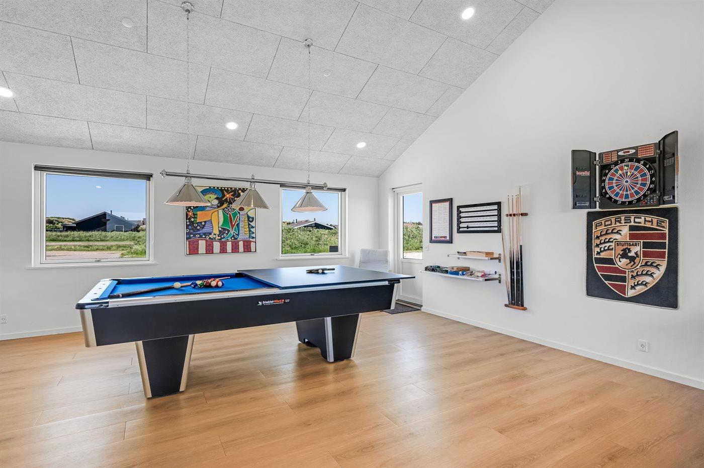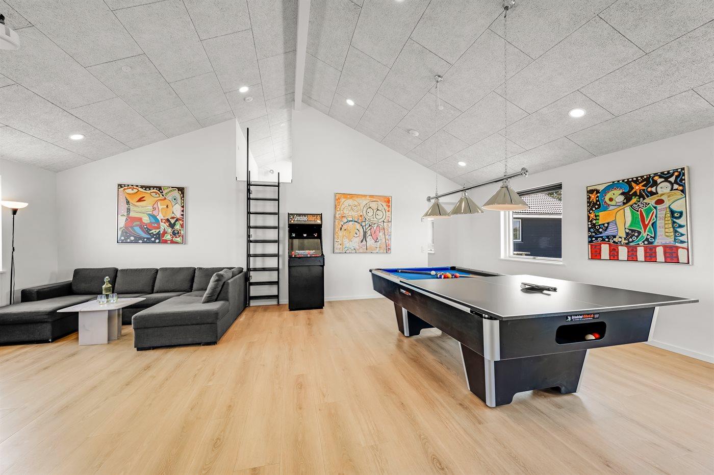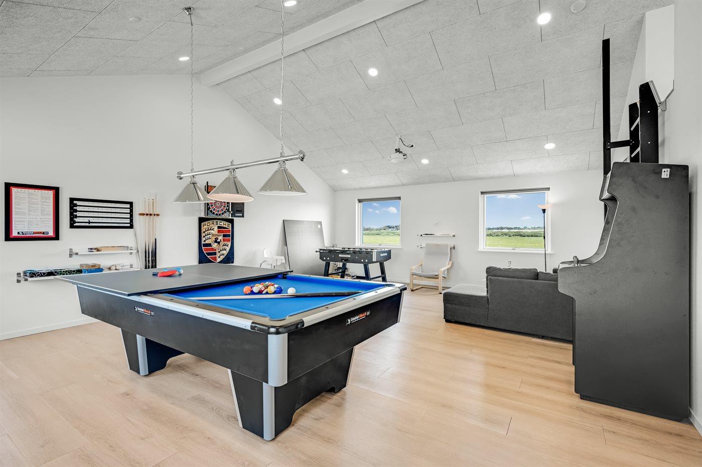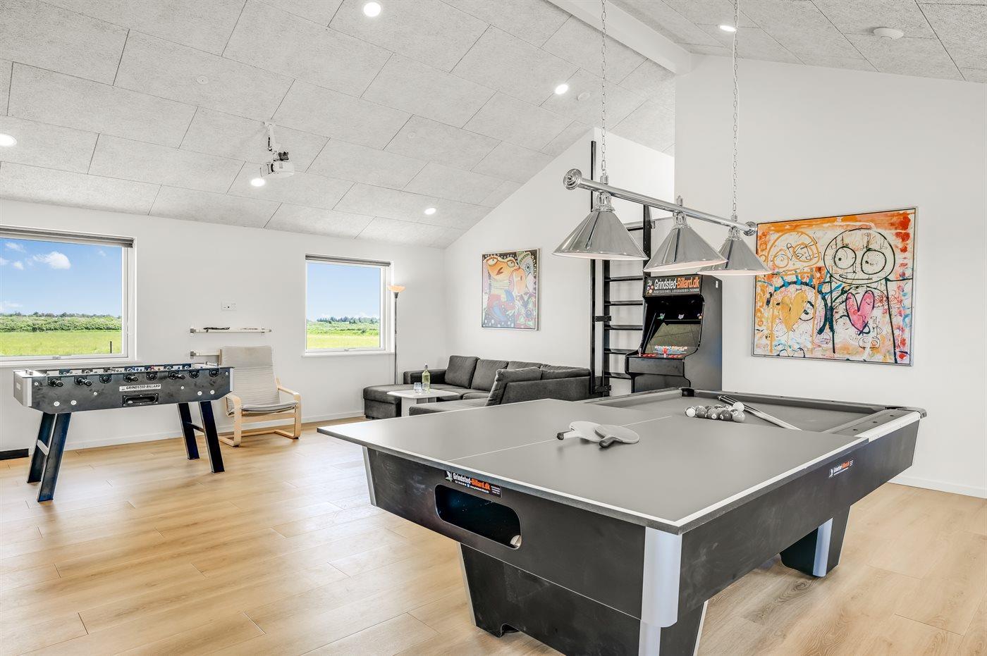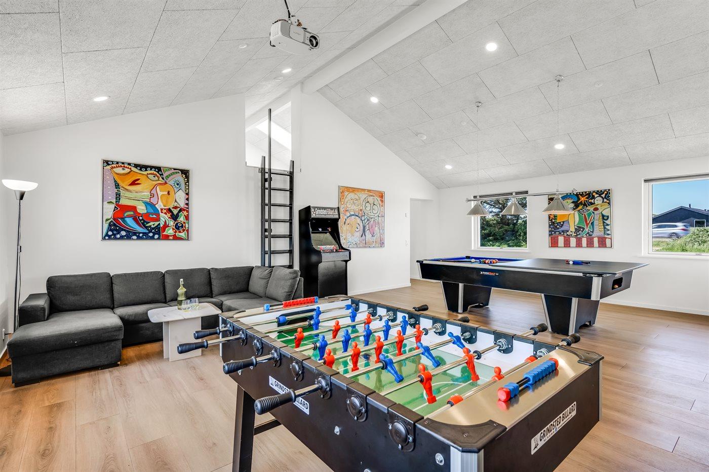 Men det er ikke alt - dette sommerhus har også et indendørs aktivitetsrum, hvor sjov og konkurrence mødes. Tag plads foran den store projektorskærm og nyd filmoplevelser i biografkvalitet. Udfordr dine venner og familie til en venskabelig kamp i billard, bordfodbold eller dart, eller tjek dine evner på Arcademaskinen med 500 spil. Der er sjov for alle aldre!