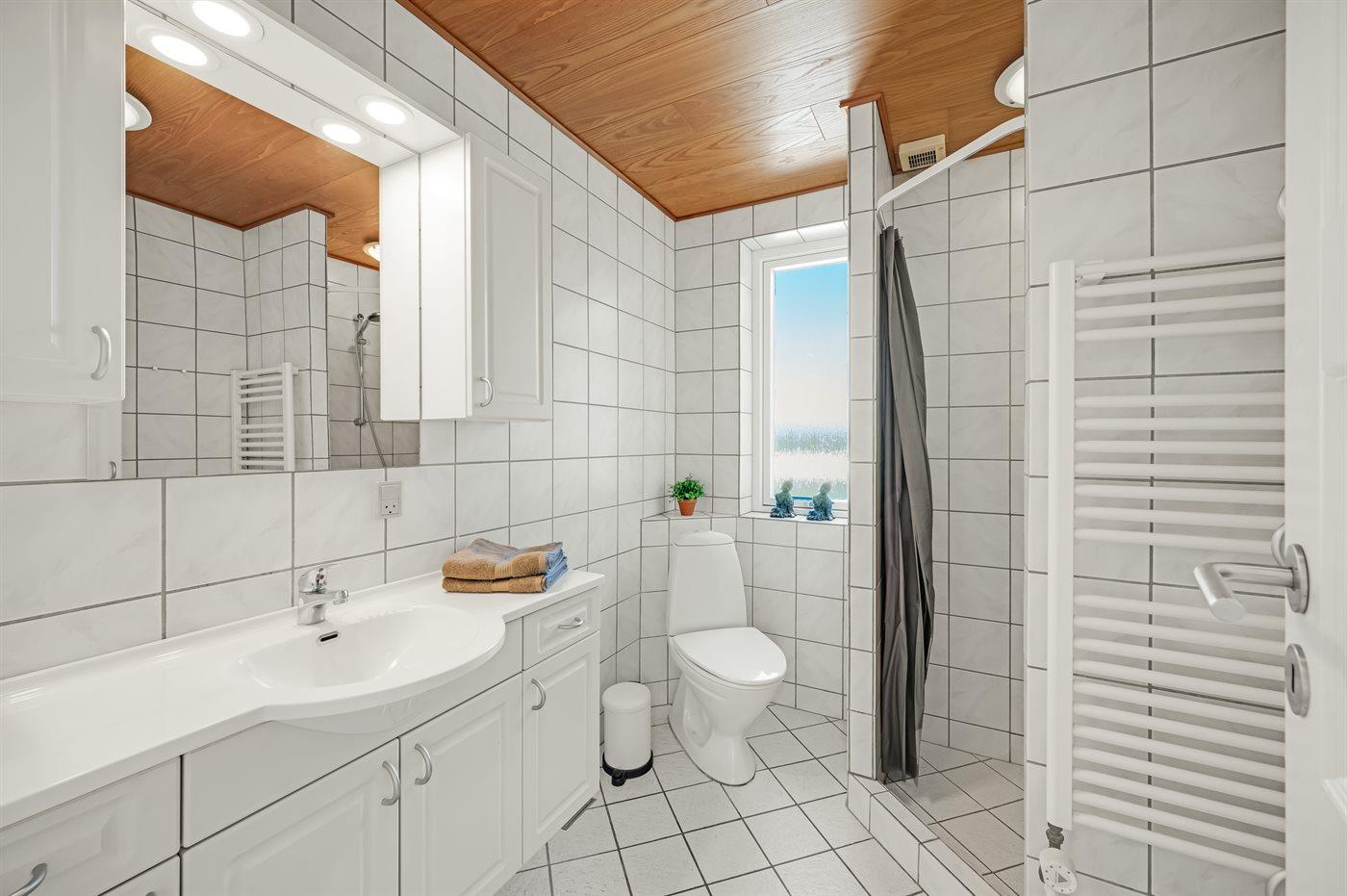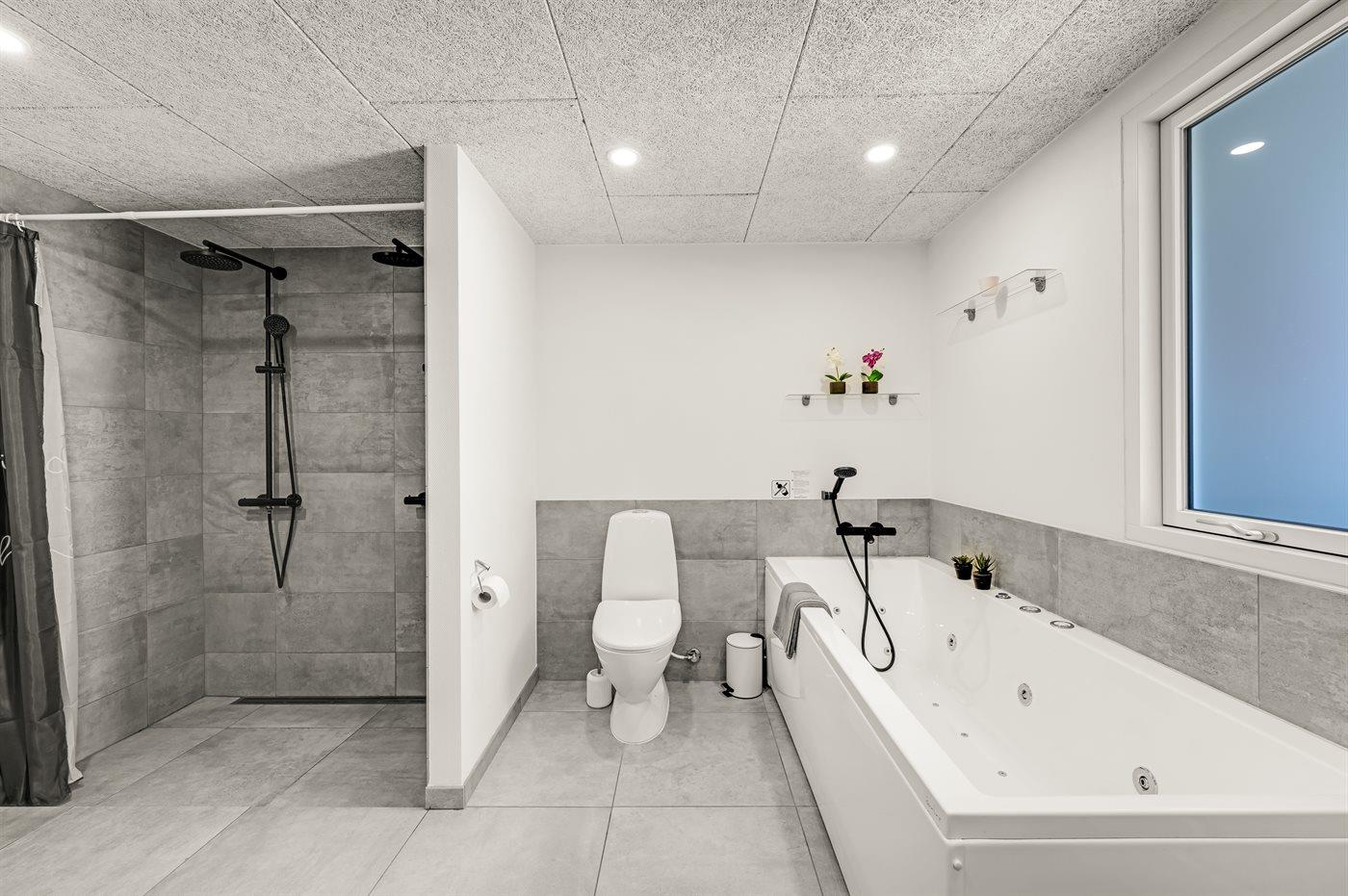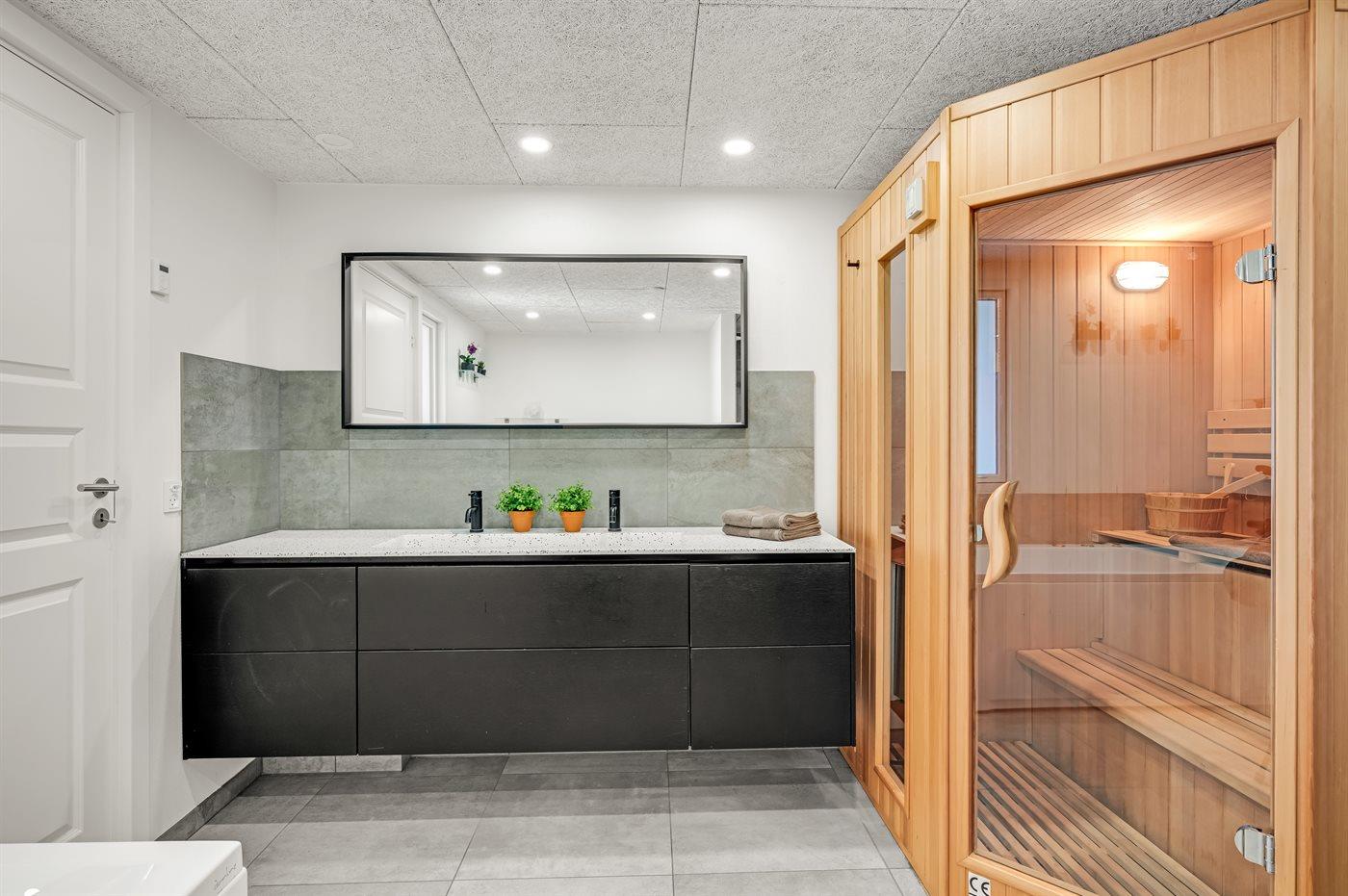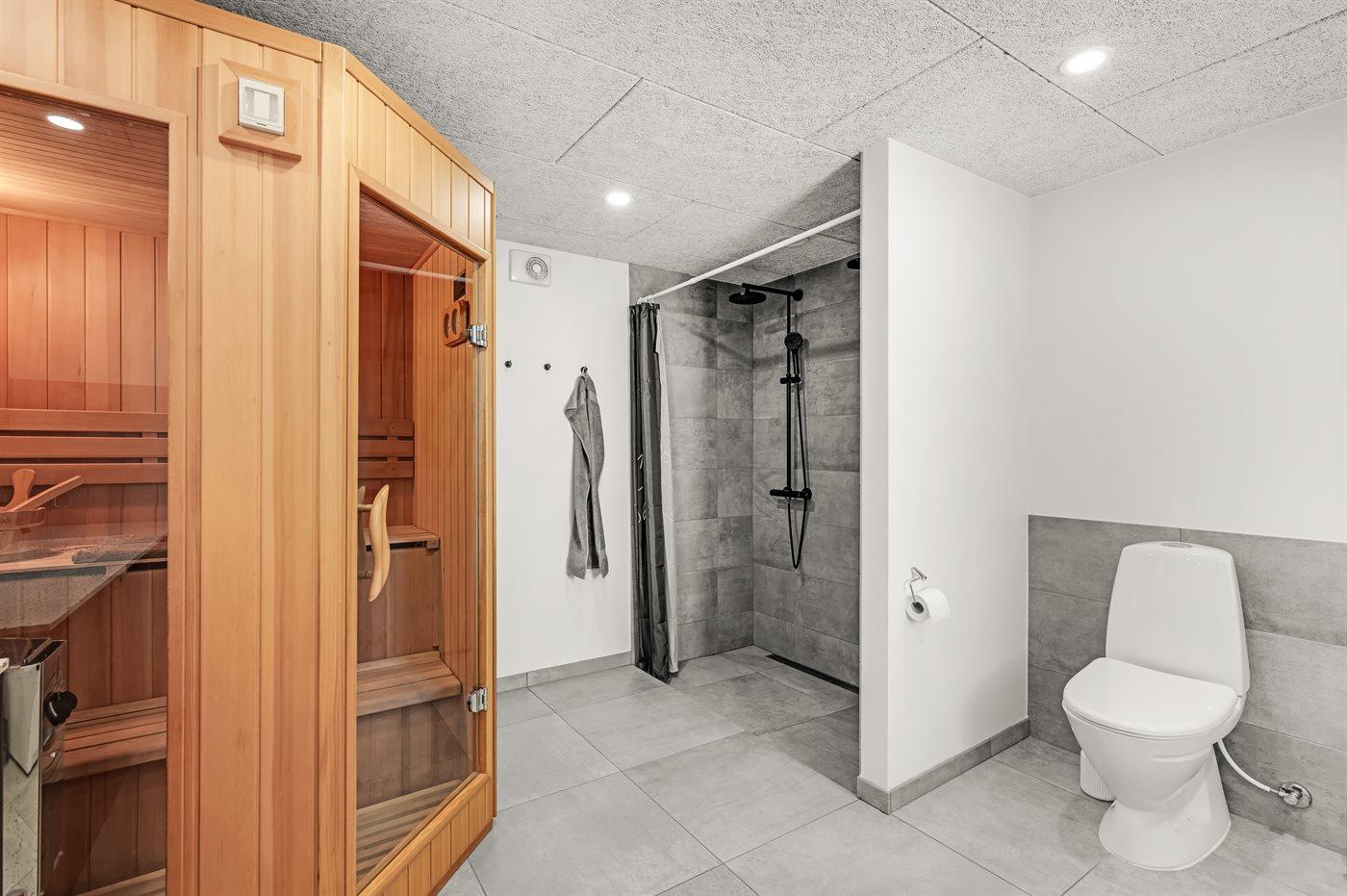 Der er 2 badeværelser med bruseniche og 2 toiletter. Der er gulvvarme på 2 badeværelser. I saunaen er der mulighed for afslapning.