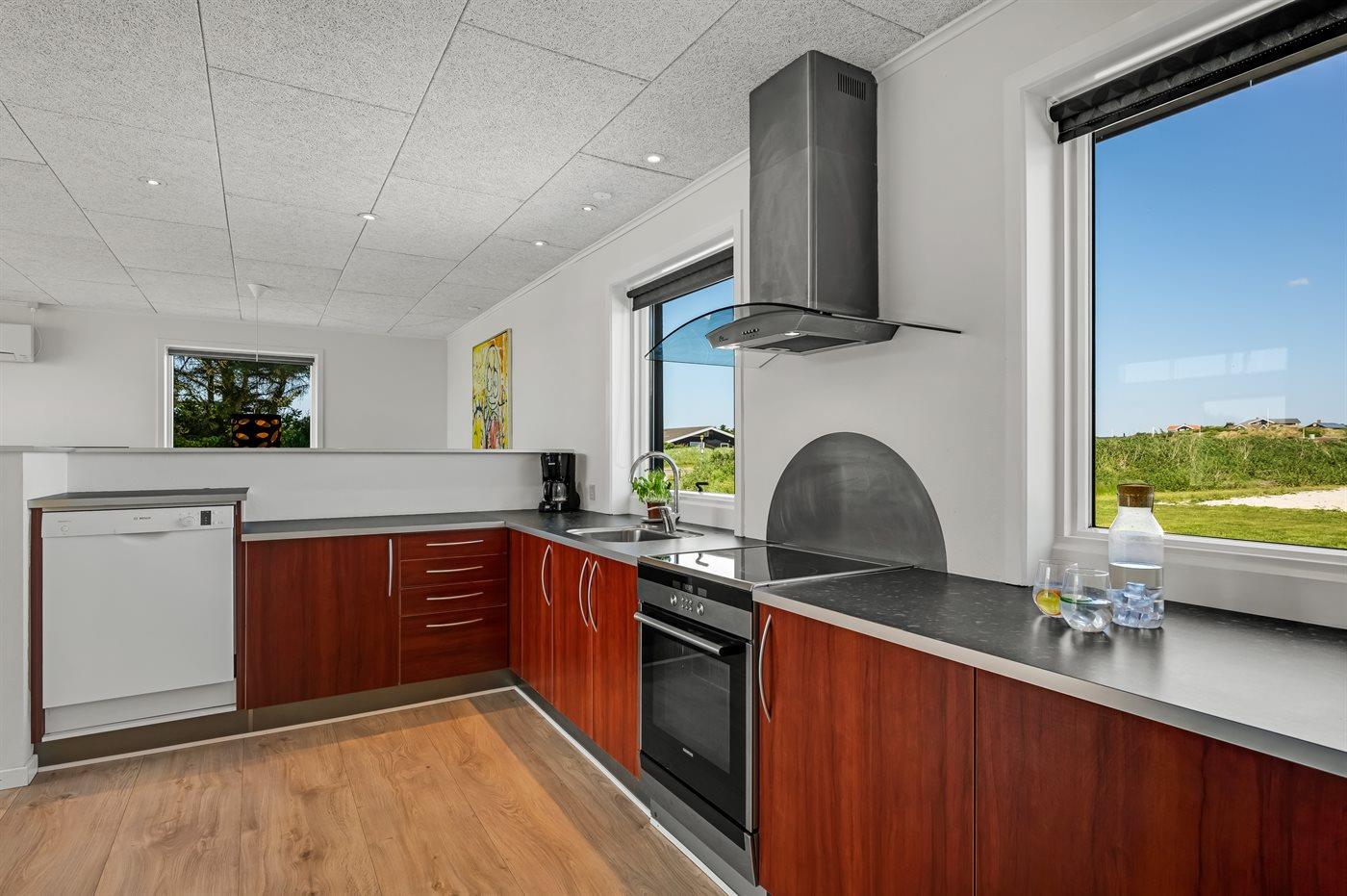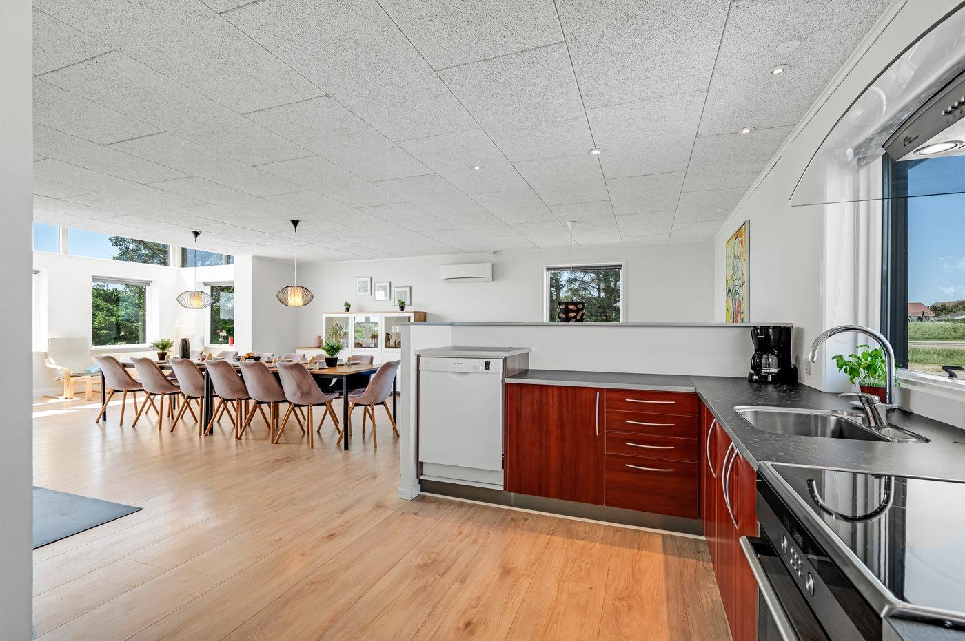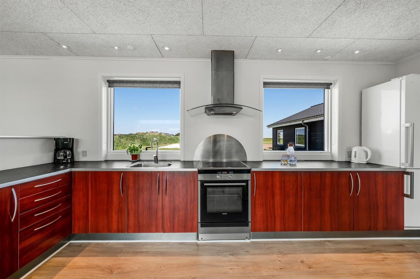 Køkkenet er udstyret med 1 køleskab. Der er 4 induktionskogeplader, varmluftovn, mikrobølgeovn samt opvaskemaskine.