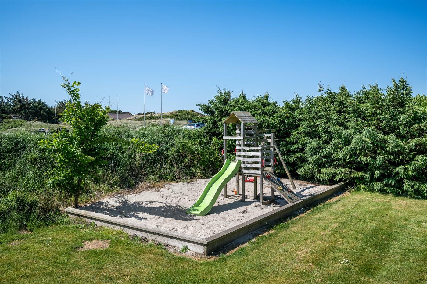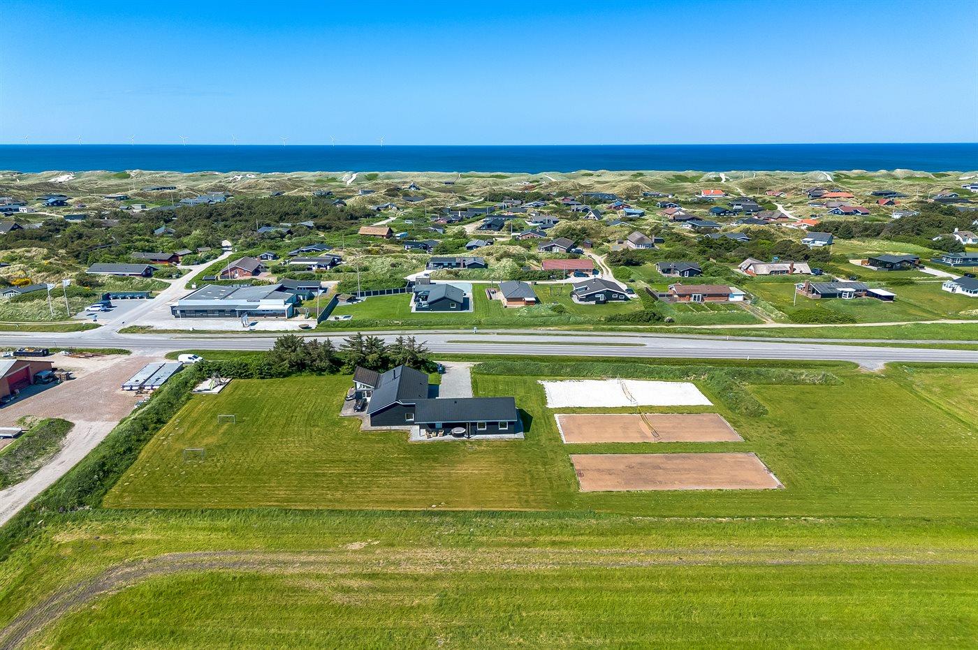 Ferieboligen er beliggende på en 6800 m² stor naturgrund. Der er 770 m til havet. Nærmeste forretning er beliggende i en afstand af 85 m. Gynge. Sandkasse. Legetårn. Rutchebane. Beachvolley. Fodboldmål. Der er installeret stik til opladning af elbil. Type 2 stik. Med 7,6 kW ladeeffekt. Parkering ved ferieboligen.