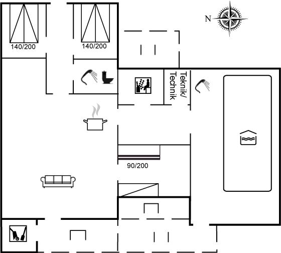 Køkkenet er udstyret med 1 køleskab. Der er 4 induktionskogeplader, varmluftovn, mikrobølgeovn samt opvaskemaskine.