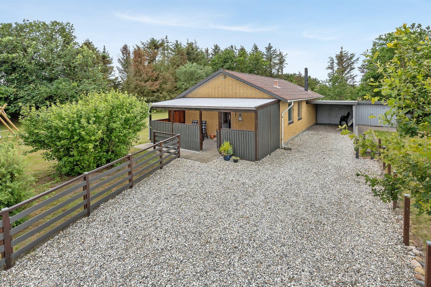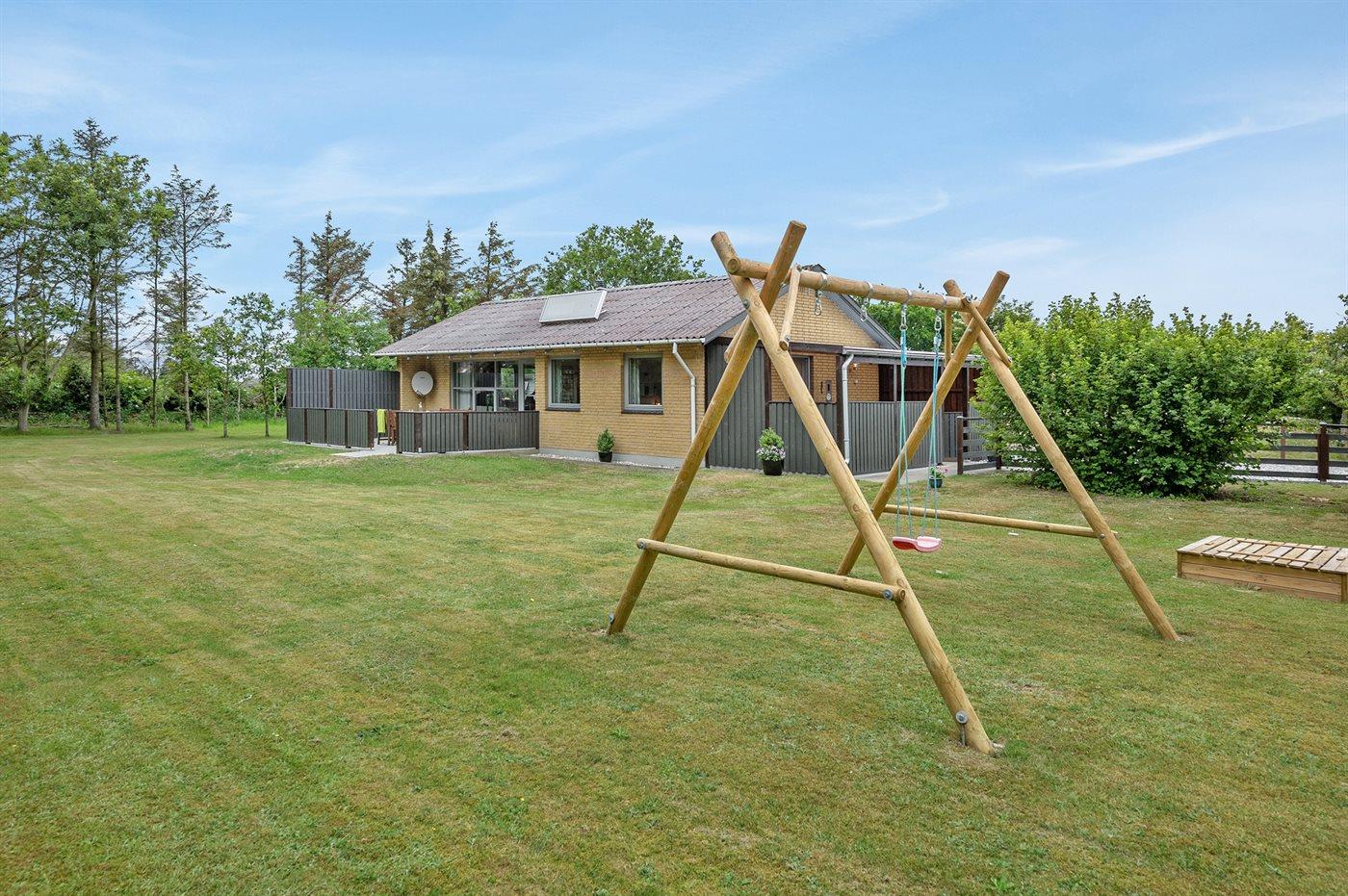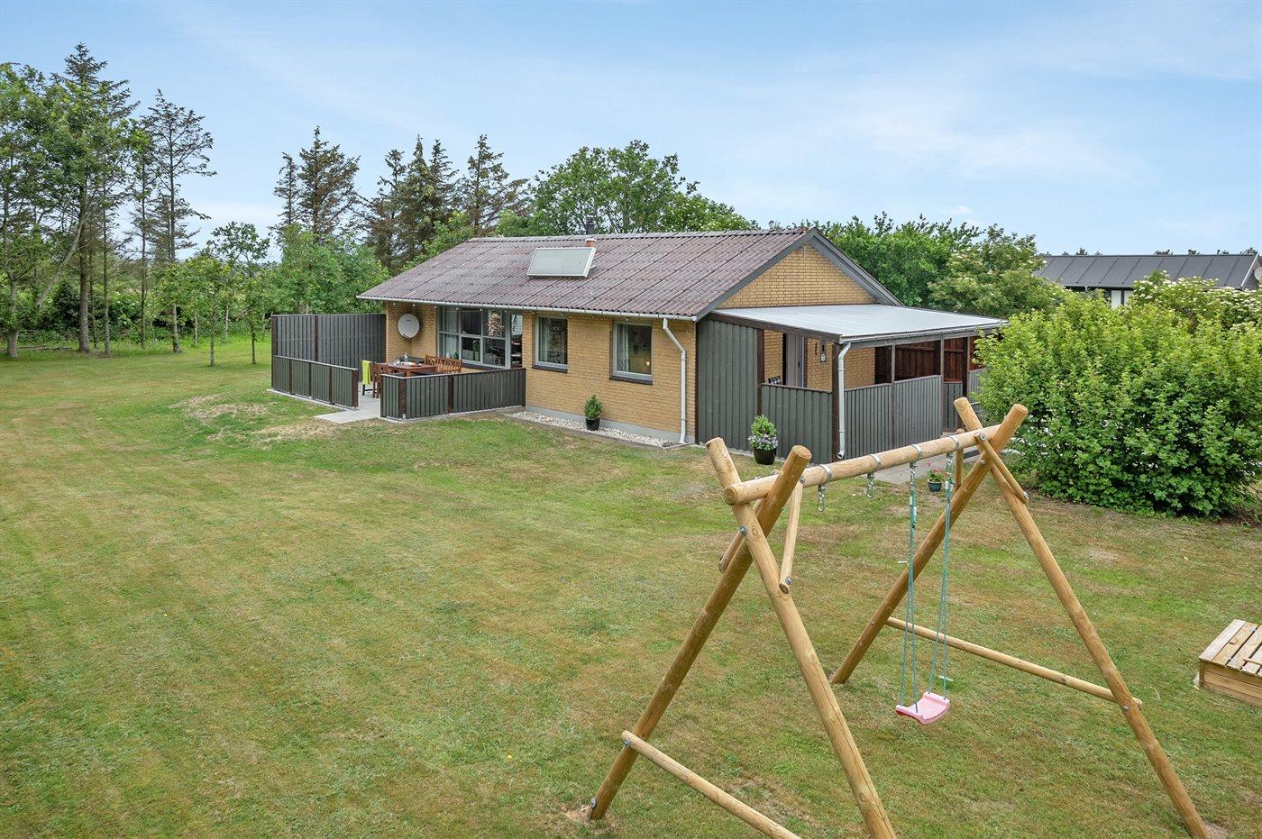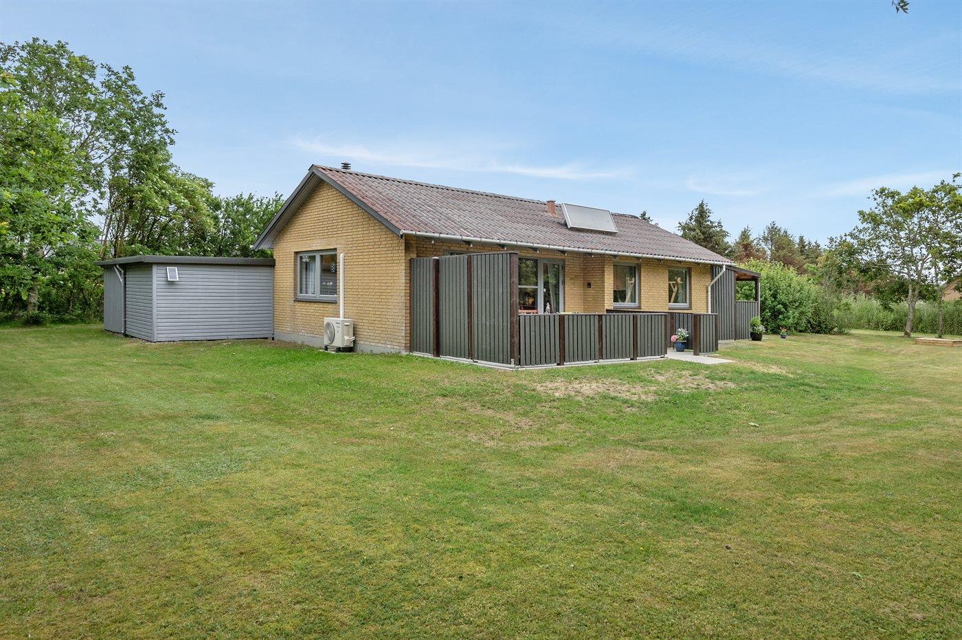 Ferieboligen er beliggende på en 2400 m² stor naturgrund. Der er 1500 m til havet. Der er 2000 m til fjorden. Nærmeste forretning er beliggende i en afstand af 2000 m. Til ferieboligen hører 44 m² terrasseareal. Desuden er der 18 m² overdækket terrasse. Heraf i alt 10 m² lukket terrasse. Der er redskabsrum. Gynge. Sandkasse. Grill til rådighed. Der er carport til rådighed.