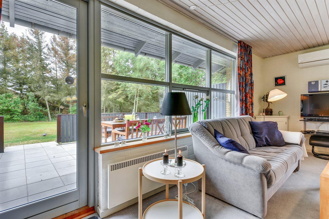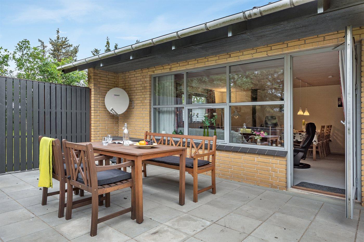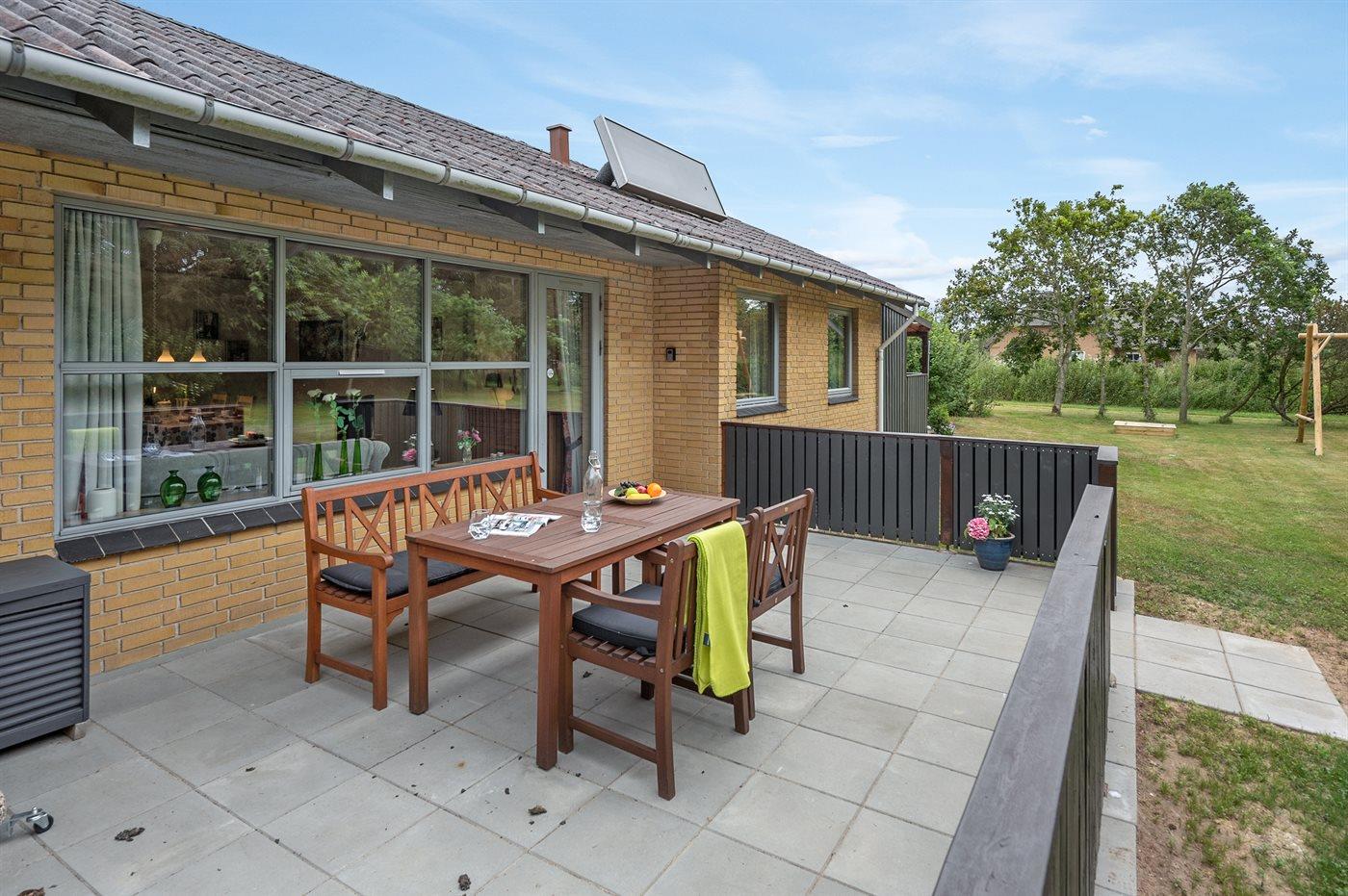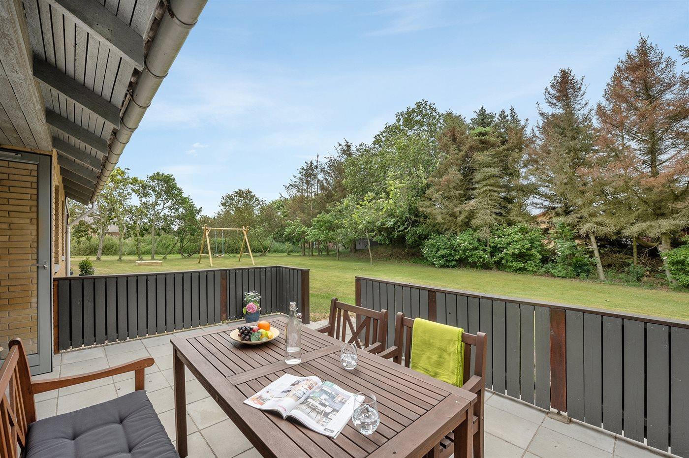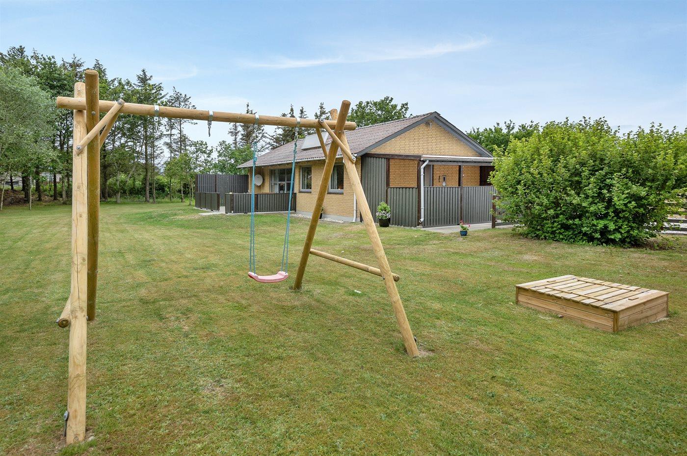Ferieboligen er beliggende på en 2400 m² stor naturgrund. Der er 1500 m til havet. Der er 2000 m til fjorden. Nærmeste forretning er beliggende i en afstand af 2000 m. Til ferieboligen hører 44 m² terrasseareal. Desuden er der 18 m² overdækket terrasse. Heraf i alt 10 m² lukket terrasse. Der er redskabsrum. Gynge. Sandkasse. Grill til rådighed. Der er carport til rådighed.