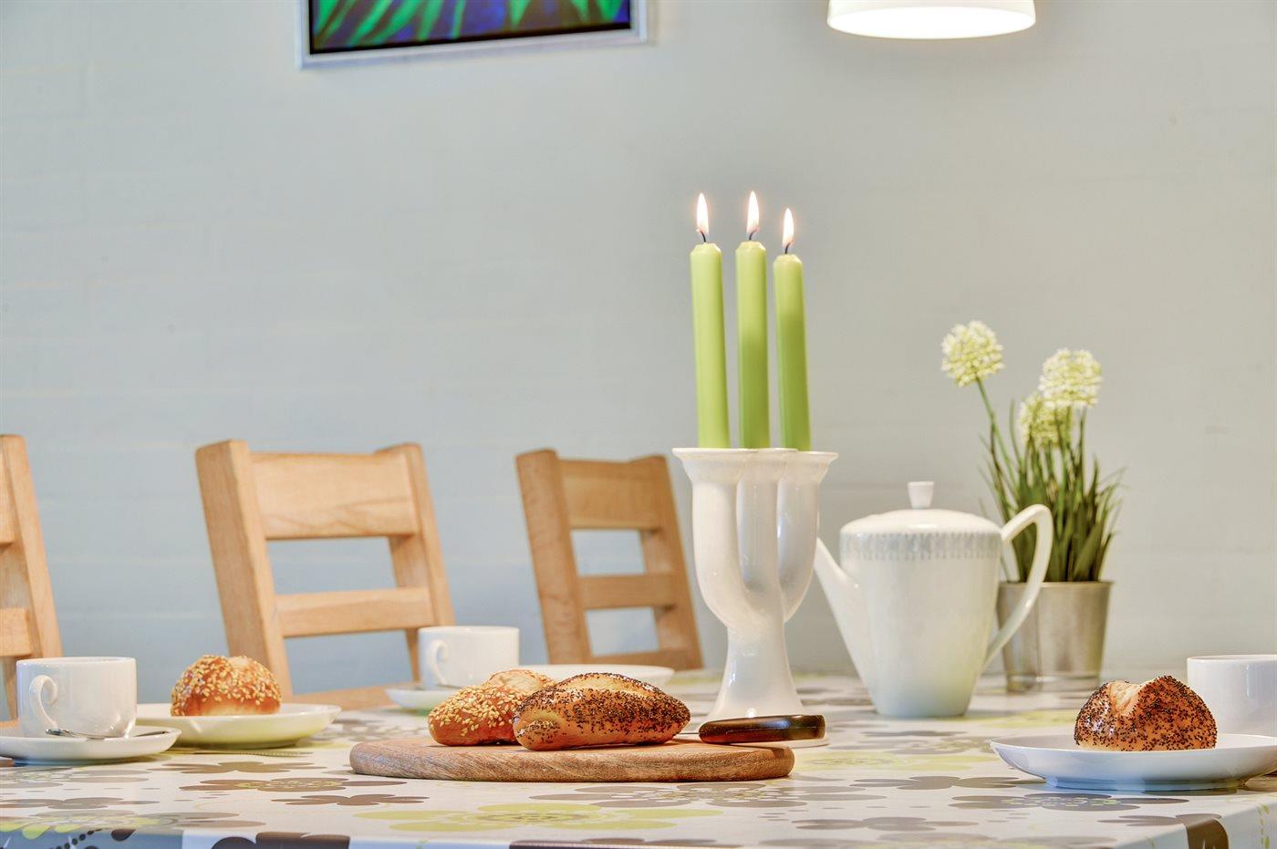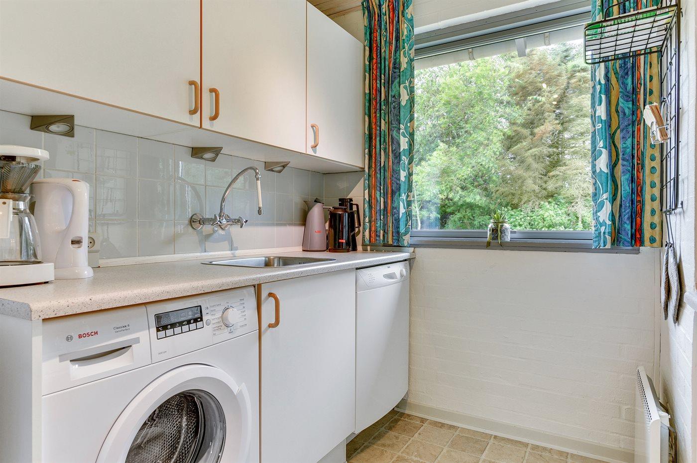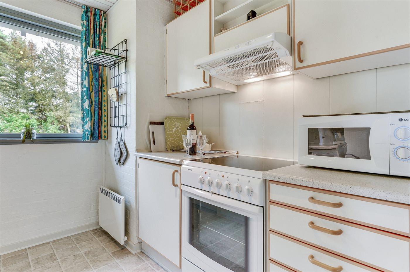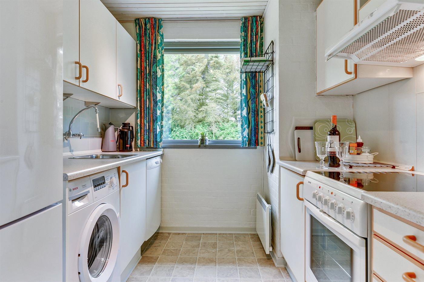 Køkkenet er udstyret med 1 køleskab. Der er 4 keramiske kogeplader, varmluftovn, mikrobølgeovn samt opvaskemaskine.