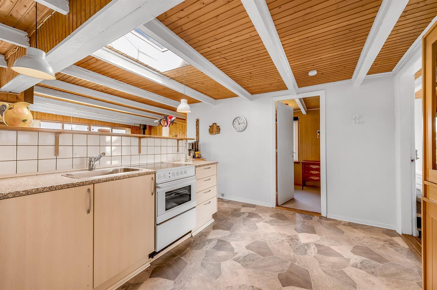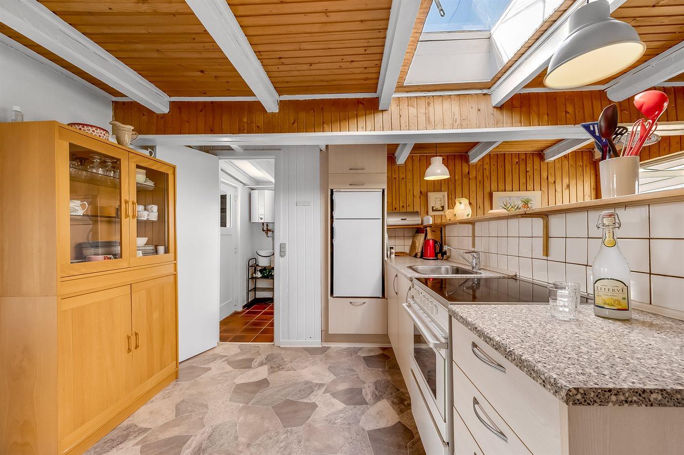 Køkkenet er udstyret med 1 køleskab. Der er 4 keramiske kogeplader, varmluftovn.