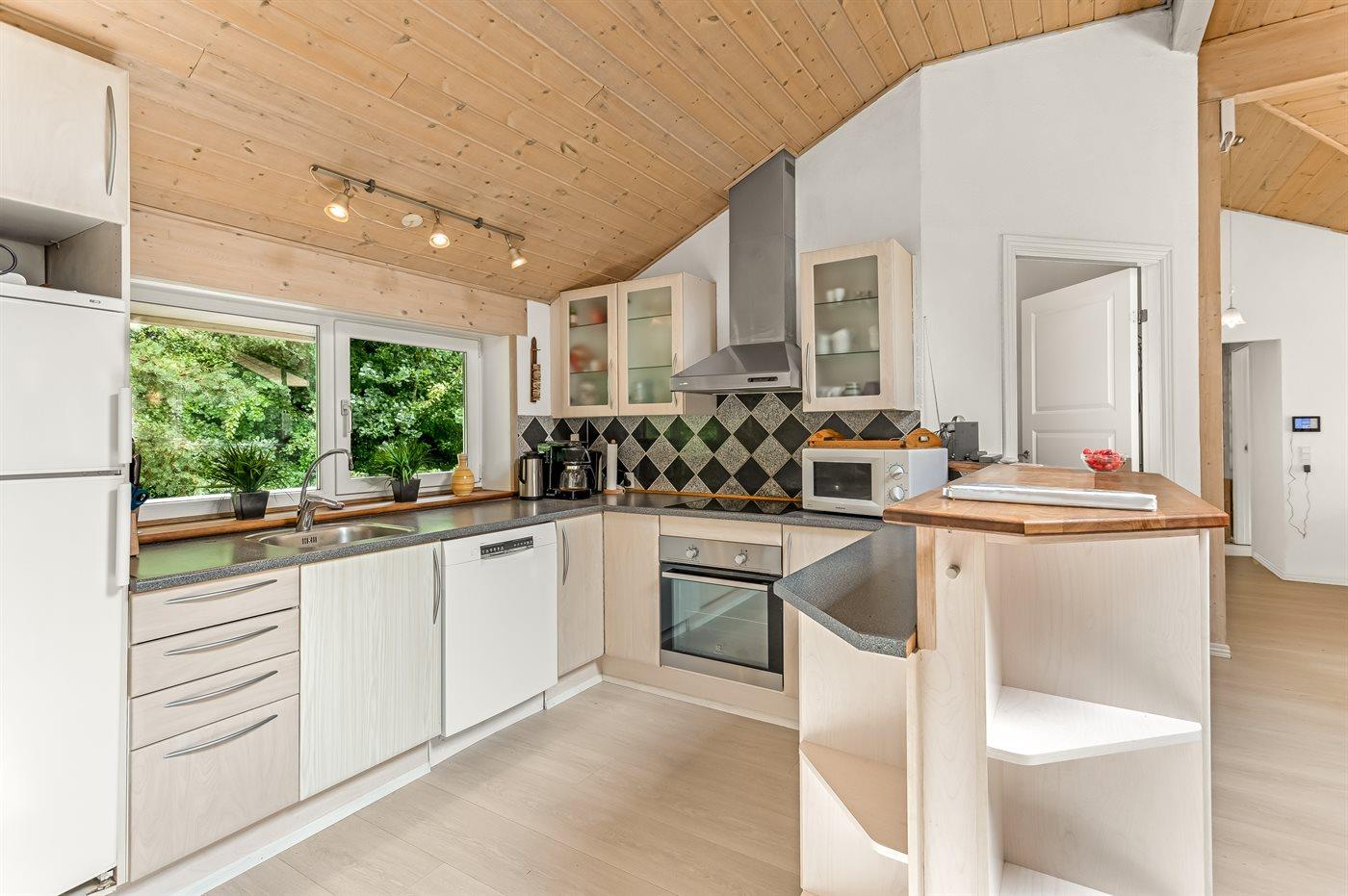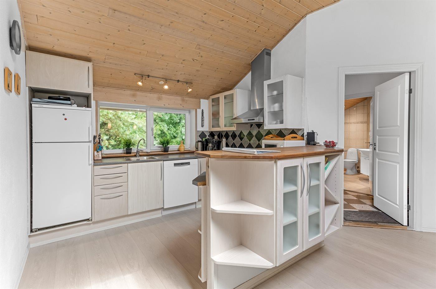 Køkkenet er udstyret med 1 køleskab. Der er 4 keramiske kogeplader, varmluftovn, mikrobølgeovn samt opvaskemaskine.