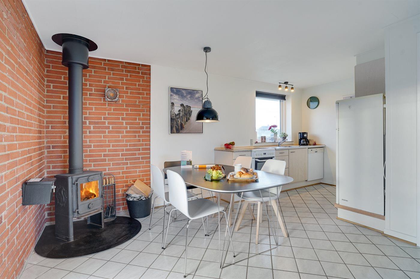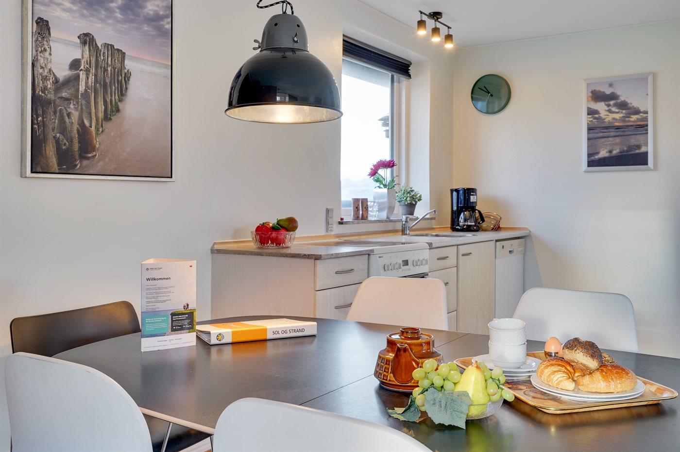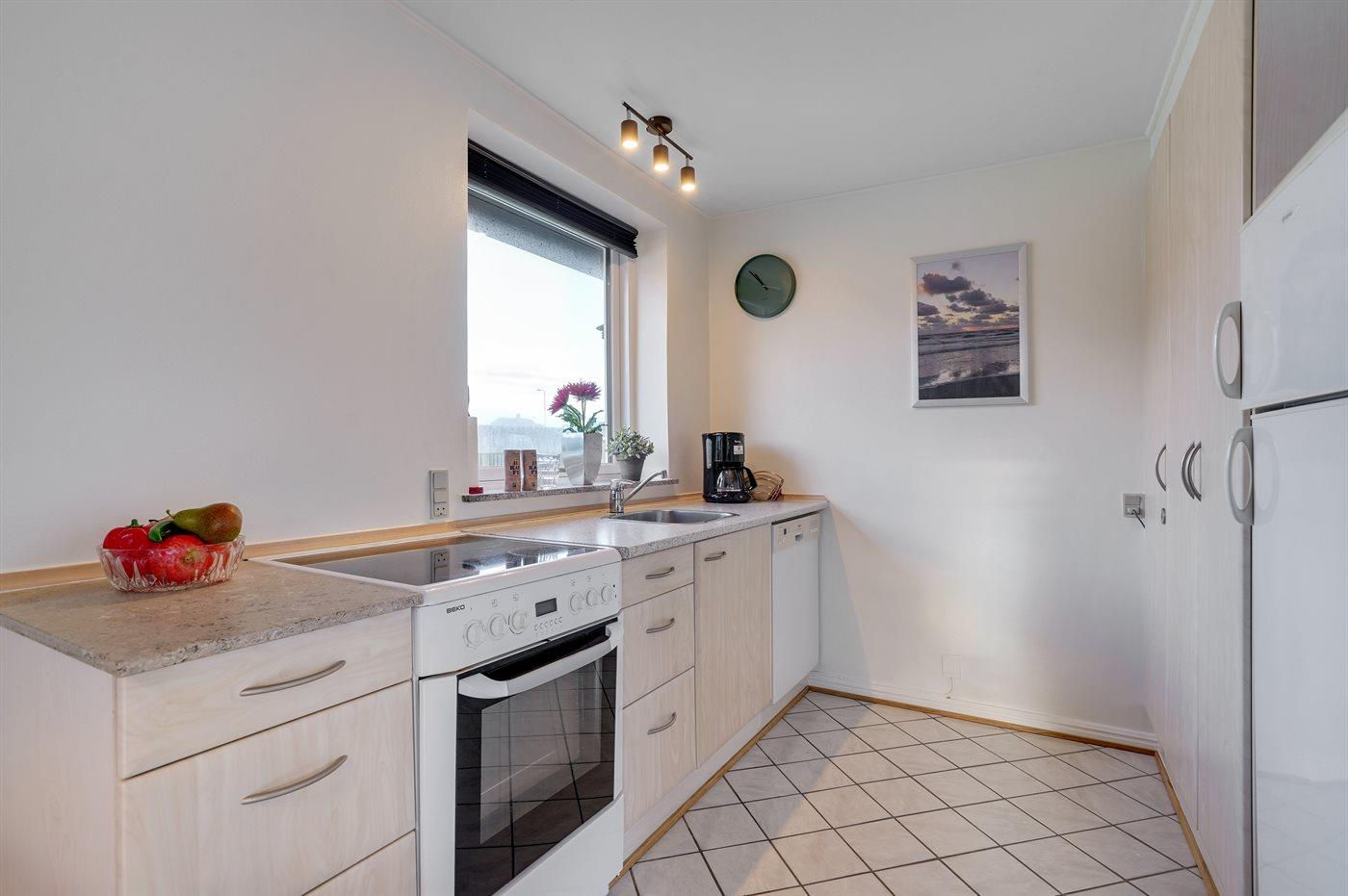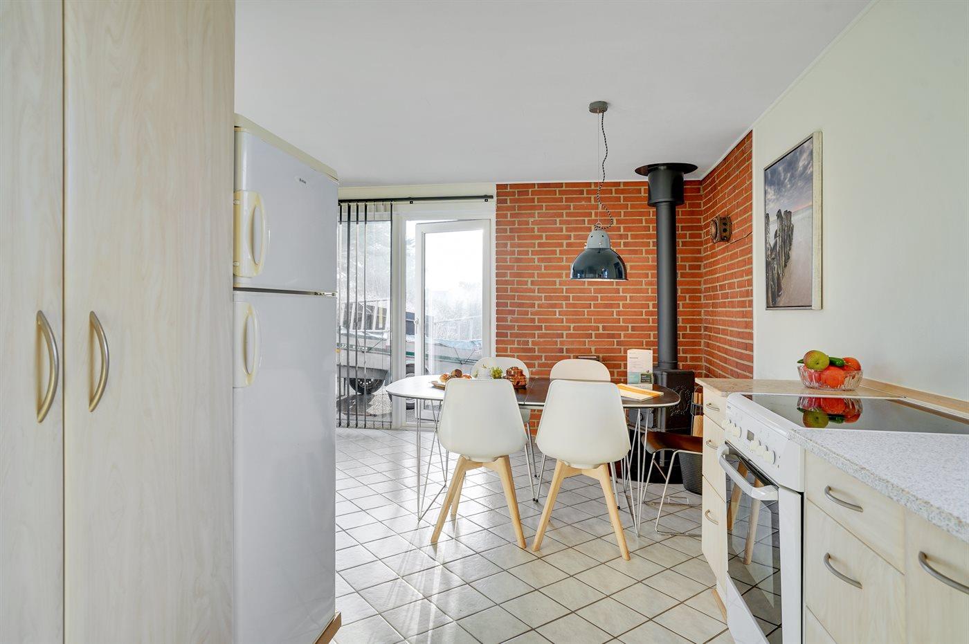 Køkkenet er udstyret med 1 køleskab. Der er 4 elkogeplader, varmluftovn samt opvaskemaskine.