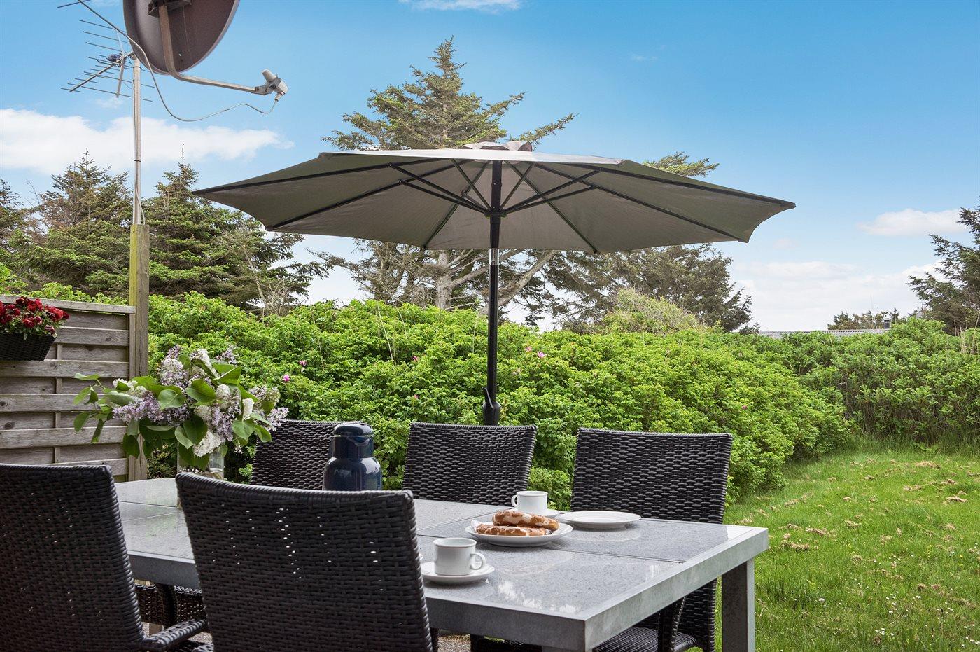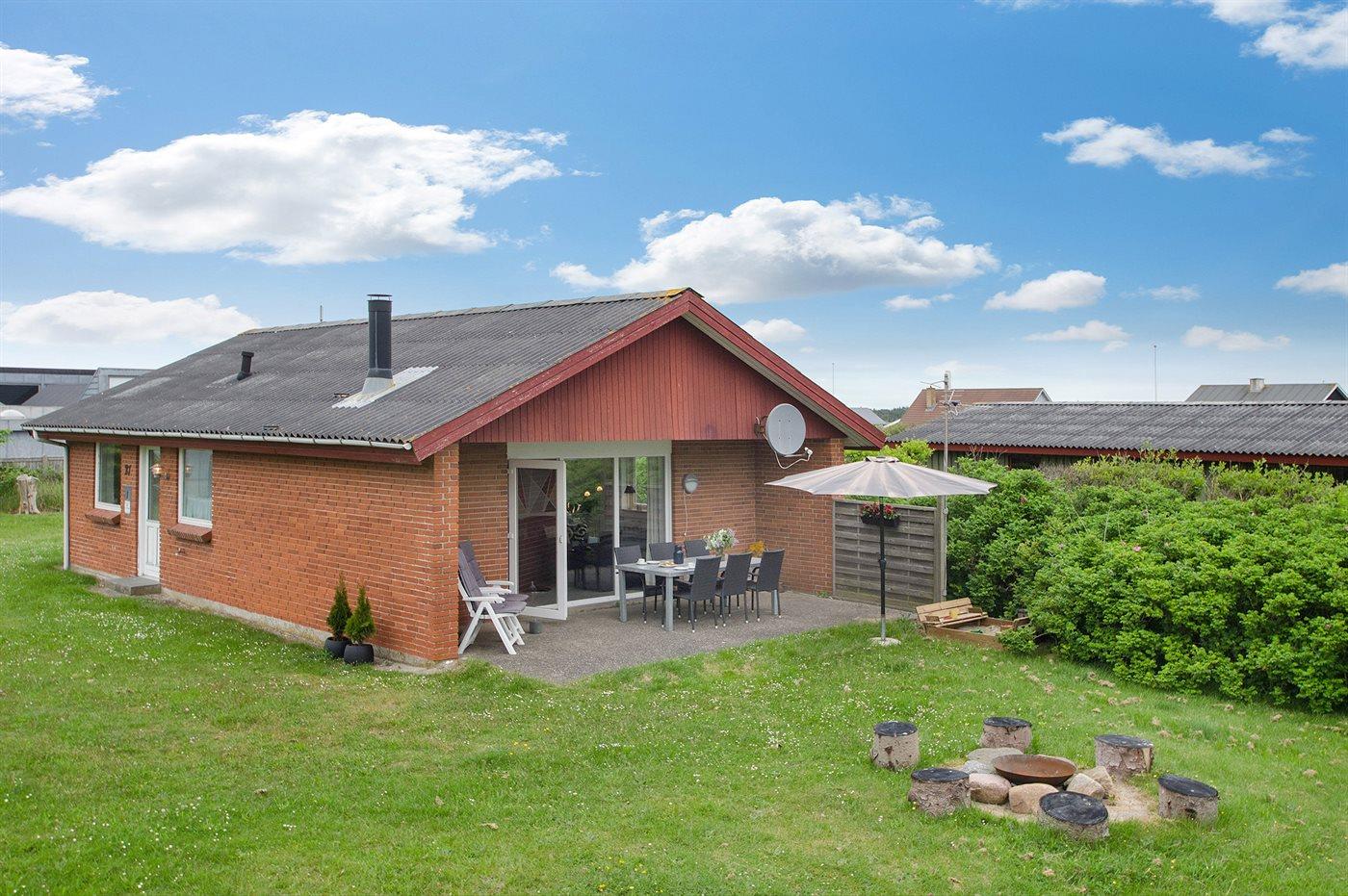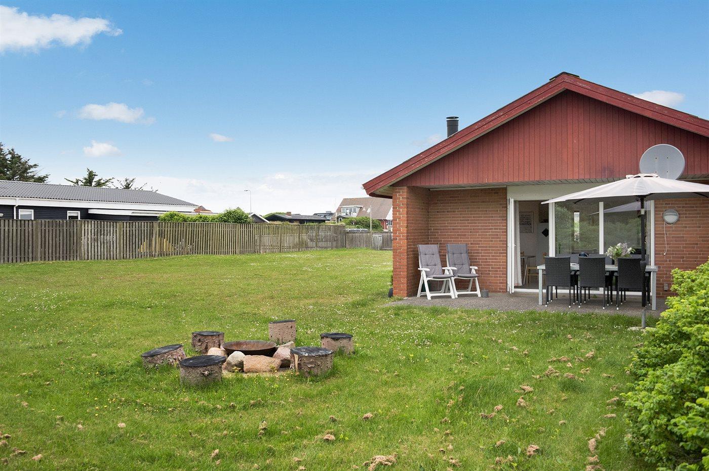 Et godt og rummeligt sommerhus i sten - beliggende på en lukket naturgrund med græs - kun 350 m fra Vesterhavet og tæt på Søndervigs centrum. Til huset hører såvel åben som overdækket terrasse med havemøbler.