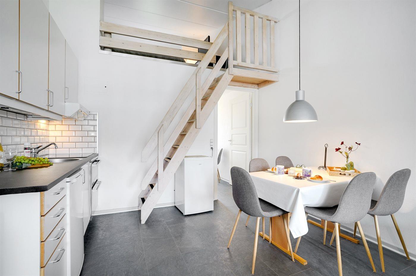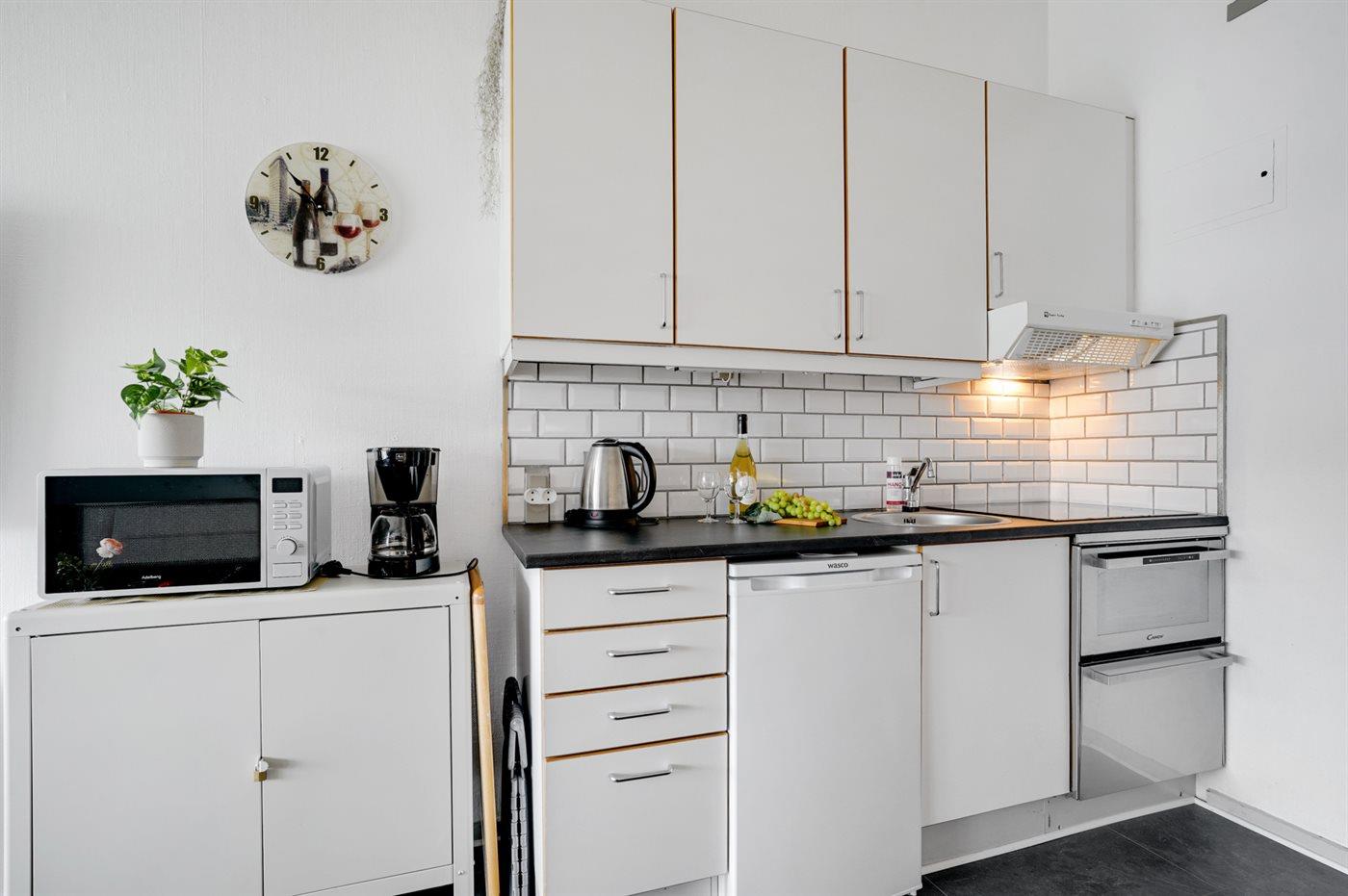 Køkkenet er udstyret med 1 køleskab. Der er 4 keramiske kogeplader, varmluftovn, mikrobølgeovn.