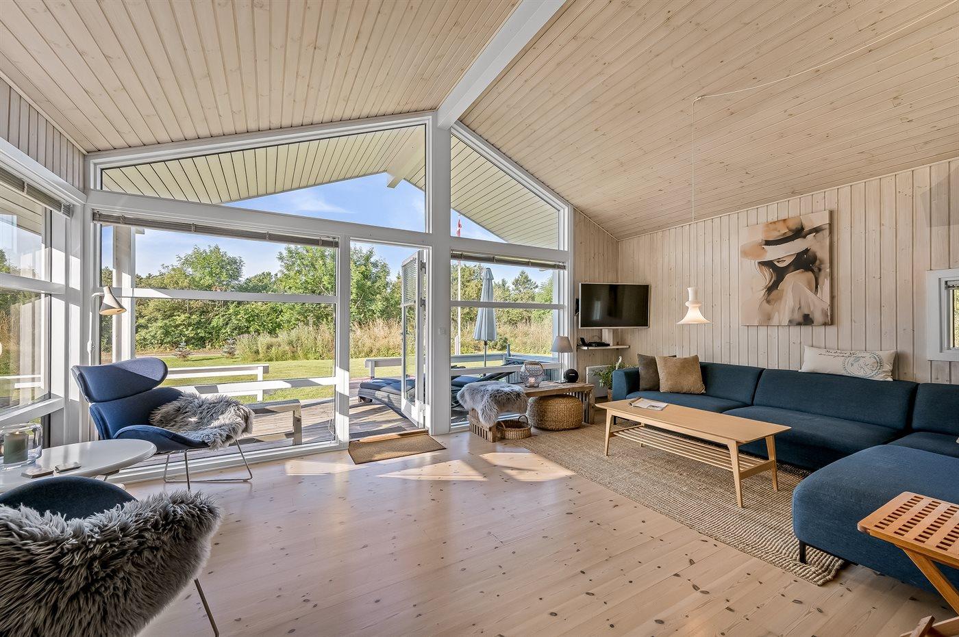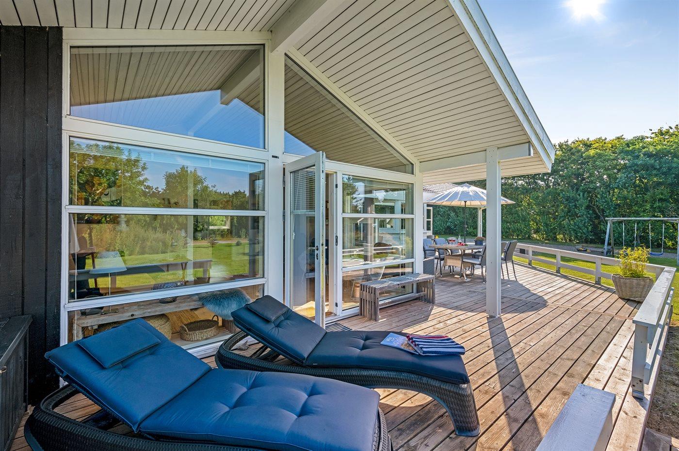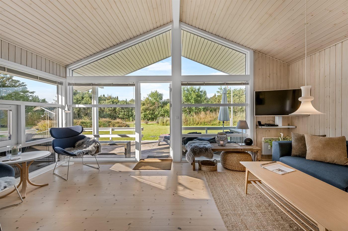 Dette charmerende sommerhus i træ byder på smukke arkitektoniske detaljer og er beliggende på en stor naturgrund i fredelige omgivelser. Huset har to overdækkede terrasser, hvor man kan nyde afslappende stunder i komfortable loungemøbler eller på solvogne. Grunden giver rig mulighed for boldspil, leg i sandkassen eller på legestativ med gynger. Området byder desuden på mange gode aktivitetsmuligheder for hele familien.