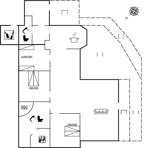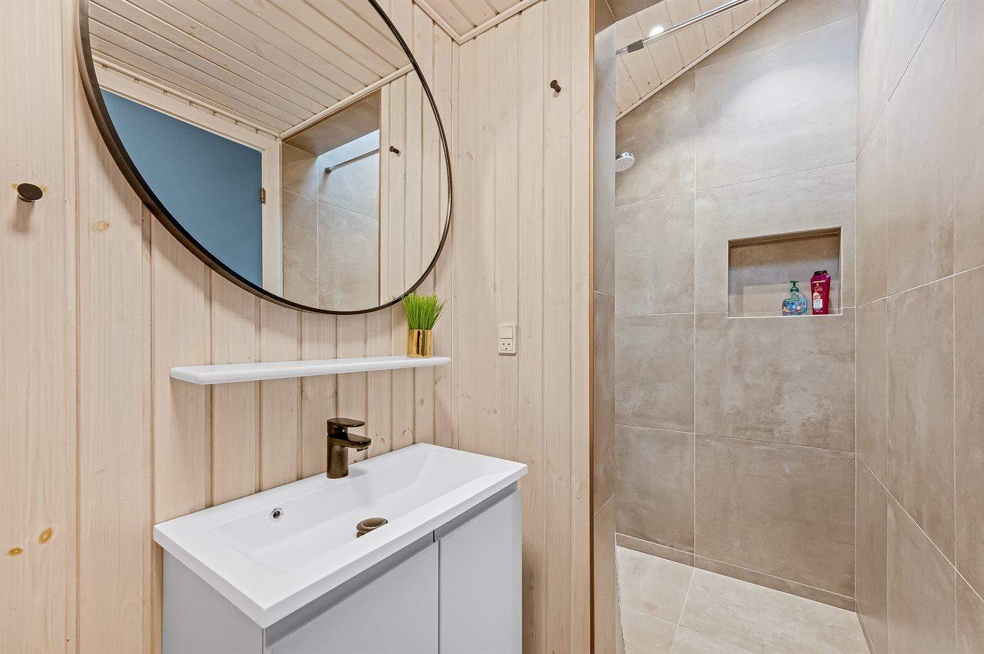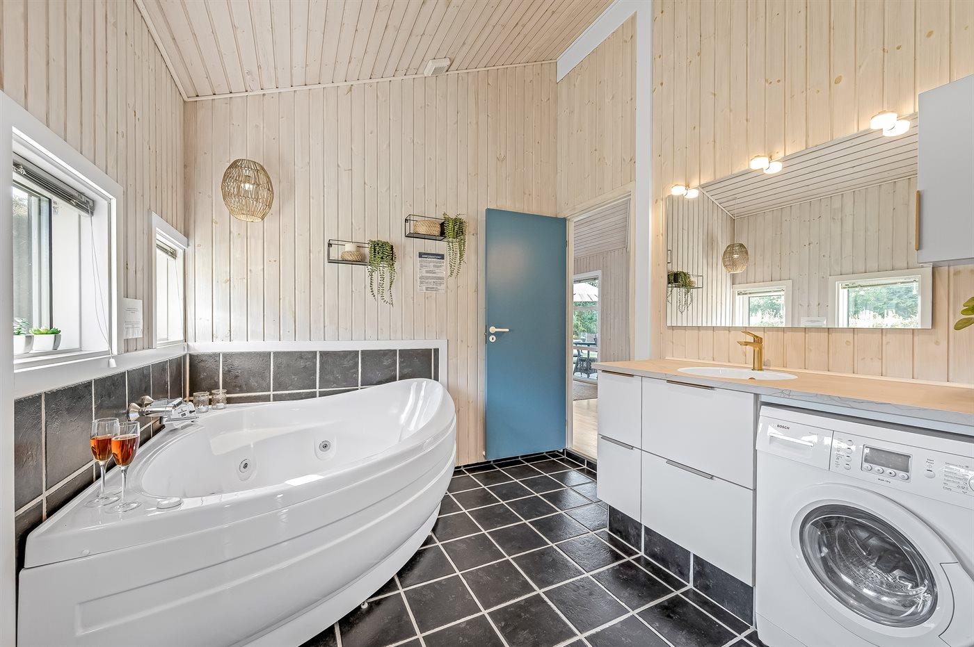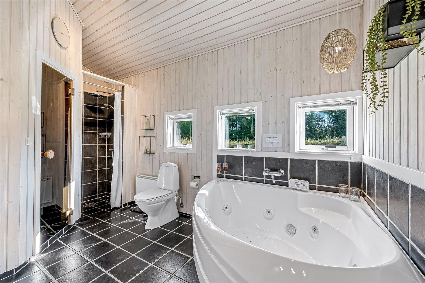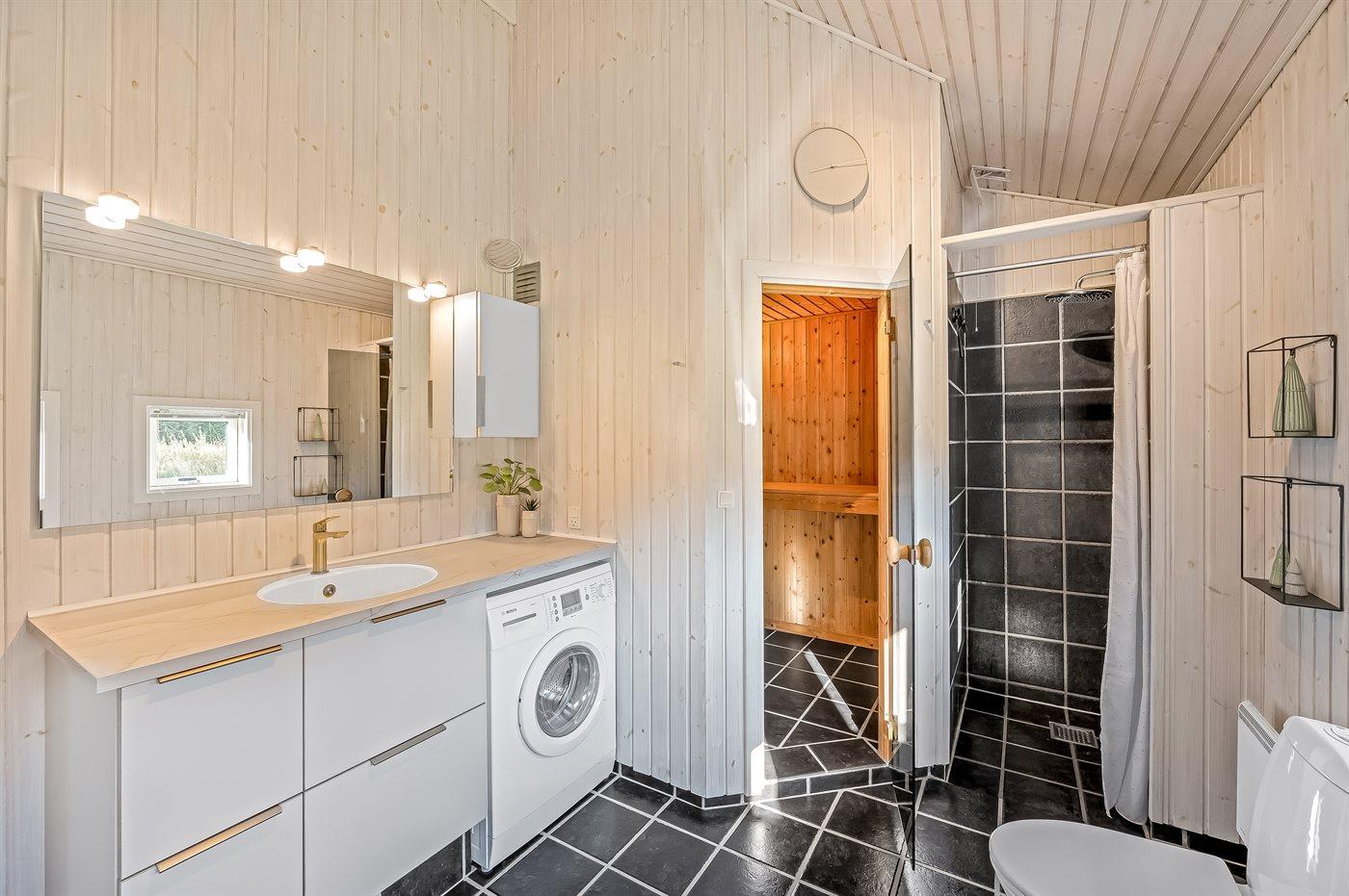 Der er 2 badeværelser med bruseniche og 2 toiletter. Der er gulvvarme på 2 badeværelser. I saunaen er der mulighed for afslapning.