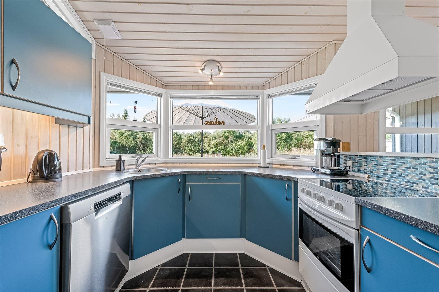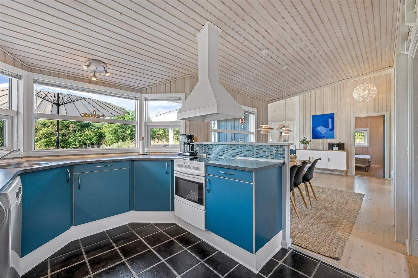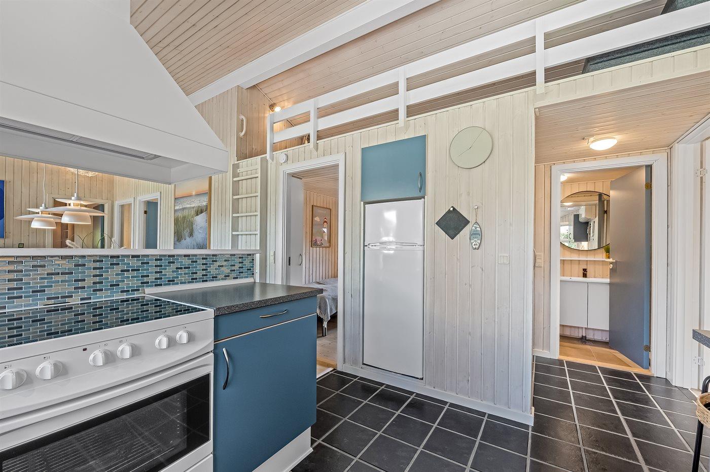 Køkkenet er udstyret med 1 køleskab og frysekapacitet på 45 liter. Der er 4 keramiske kogeplader, varmluftovn, mikrobølgeovn samt opvaskemaskine Der findes desuden ekstra fryser med en frysekapacitet på 100 liter i skuret.