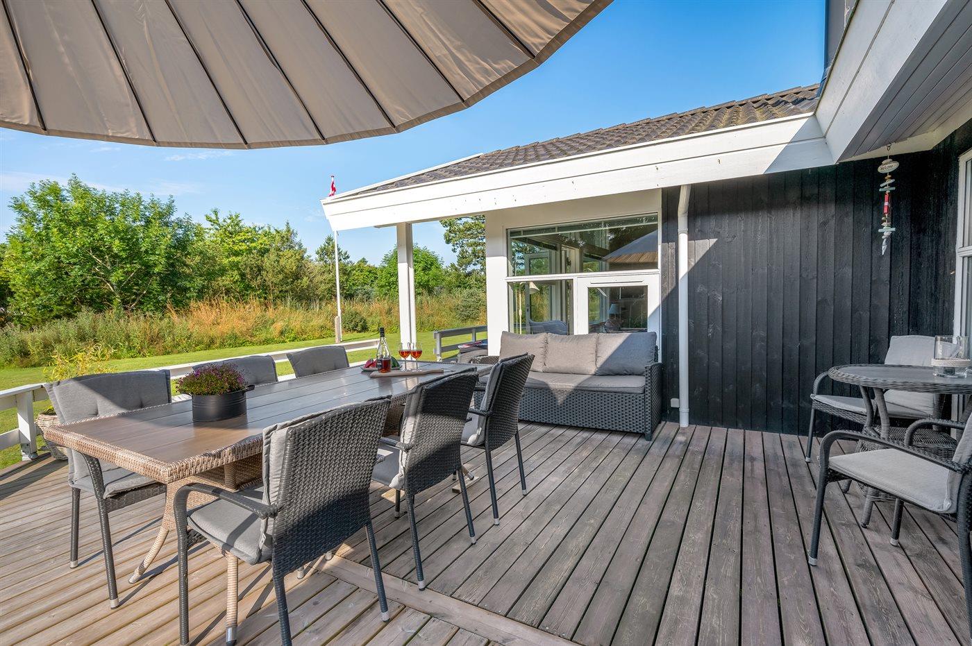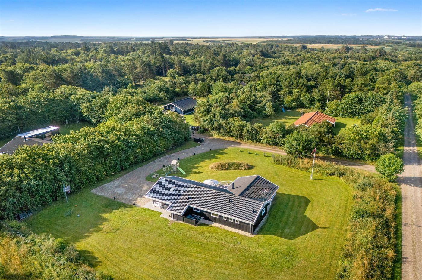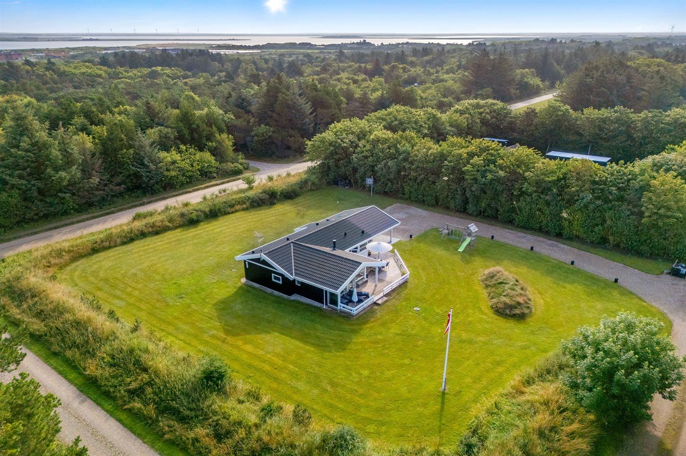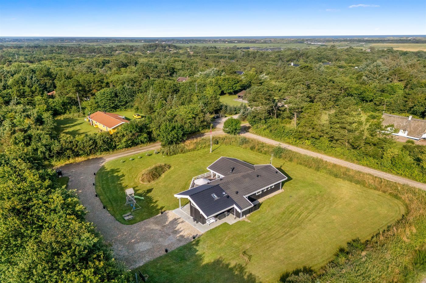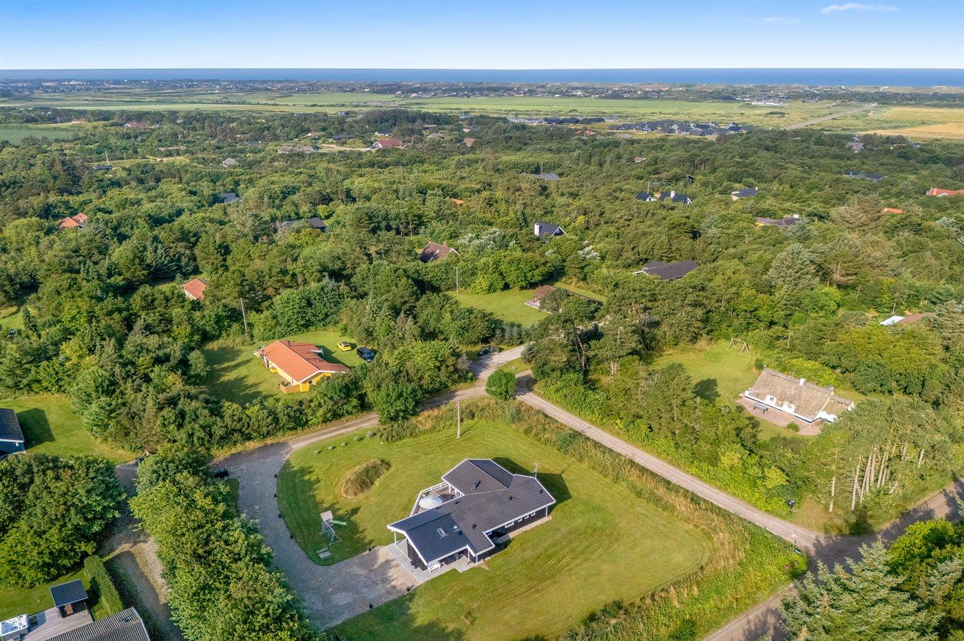 Ferieboligen er beliggende på en 2400 m² stor naturgrund. Der er 1500 m til havet. Nærmeste forretning er beliggende i en afstand af 2500 m. Til ferieboligen hører 50 m² terrasseareal. Desuden er der 20 m² overdækket terrasse. Der er redskabsrum. Gynge. Sandkasse. Rutchebane. Fodboldmål. Basketballkurv. Der er installeret stik til opladning af elbil. Type 2 stik. Med 11 kW ladeeffekt. Parkering ved ferieboligen.