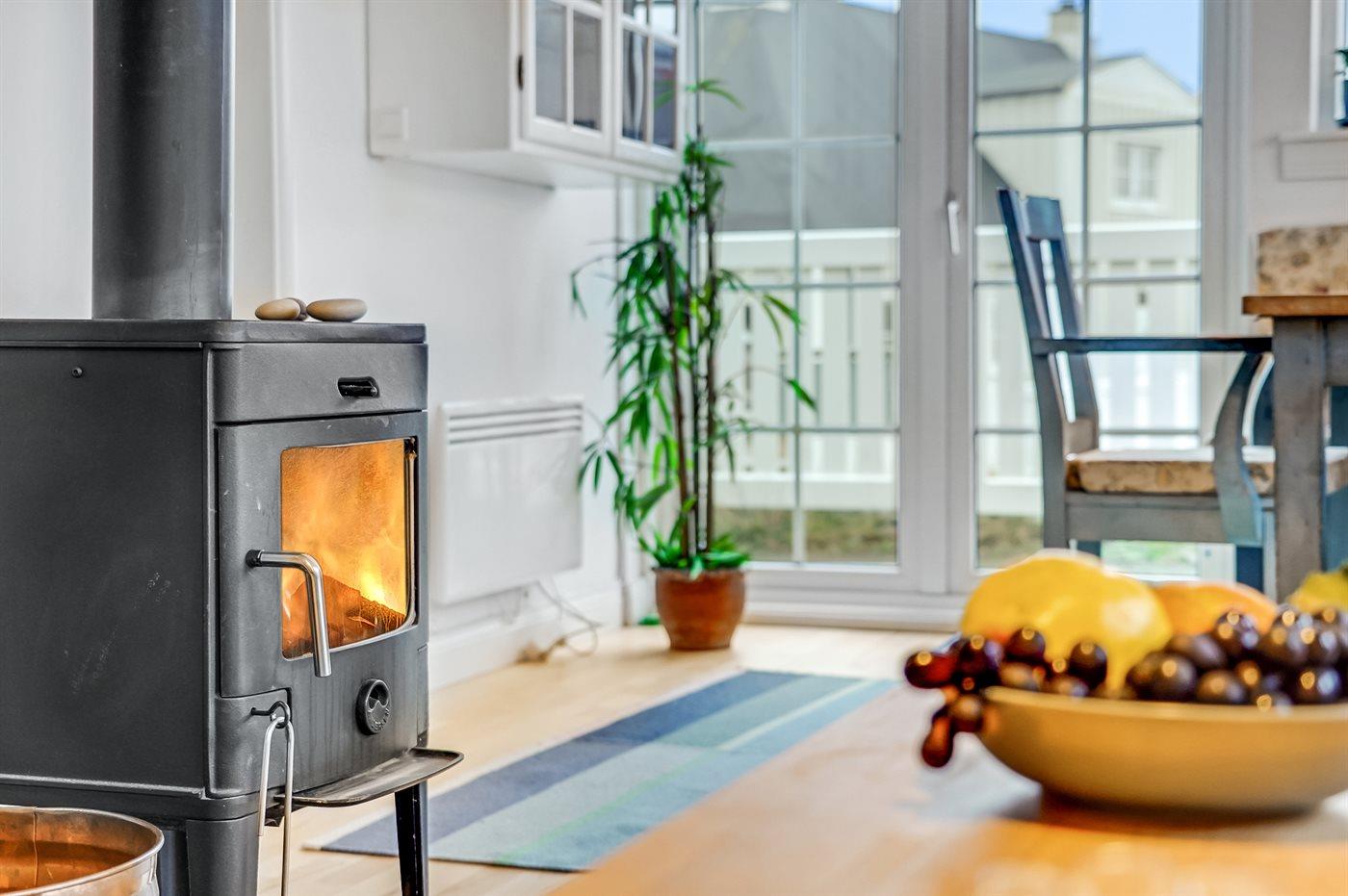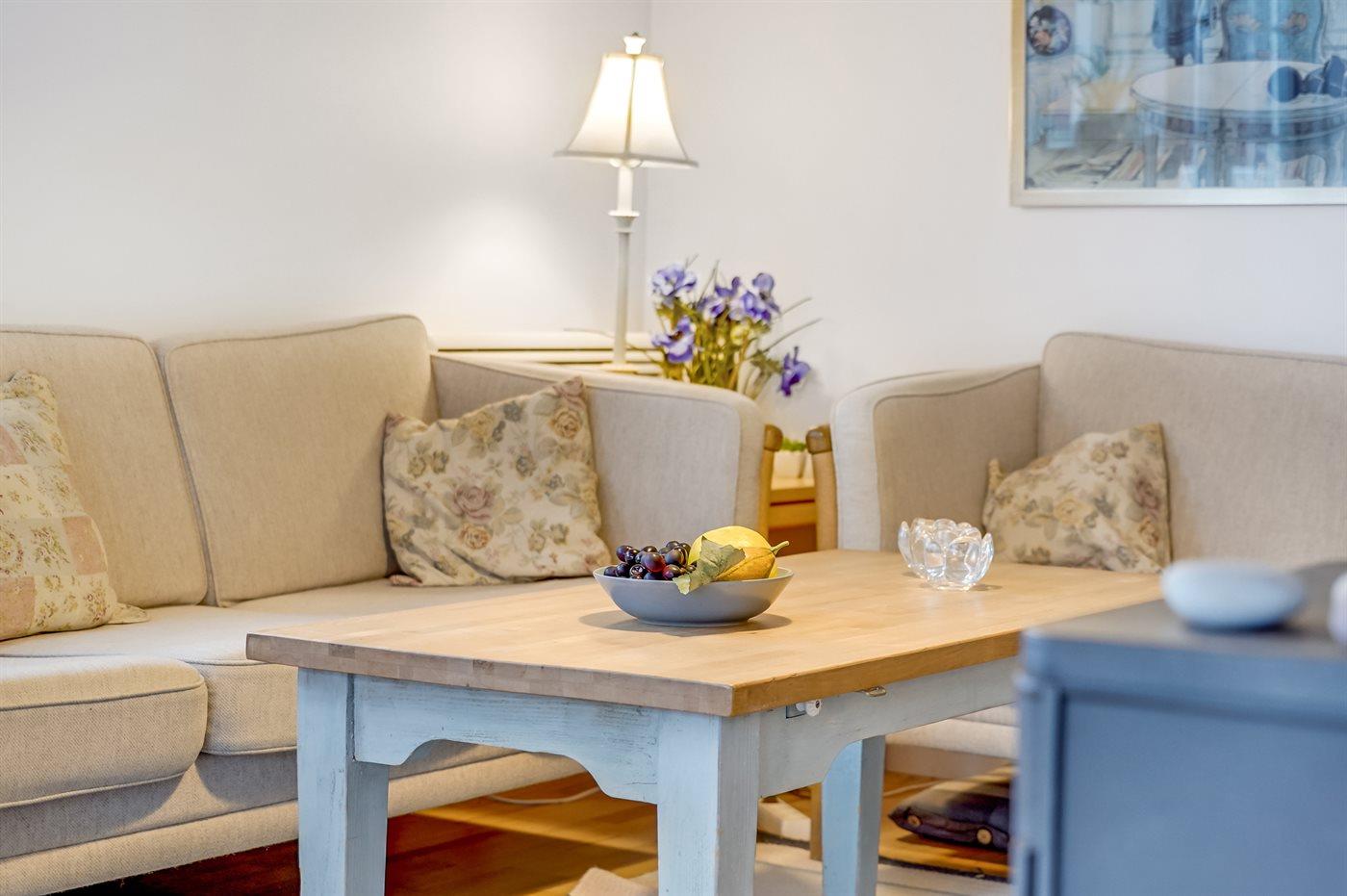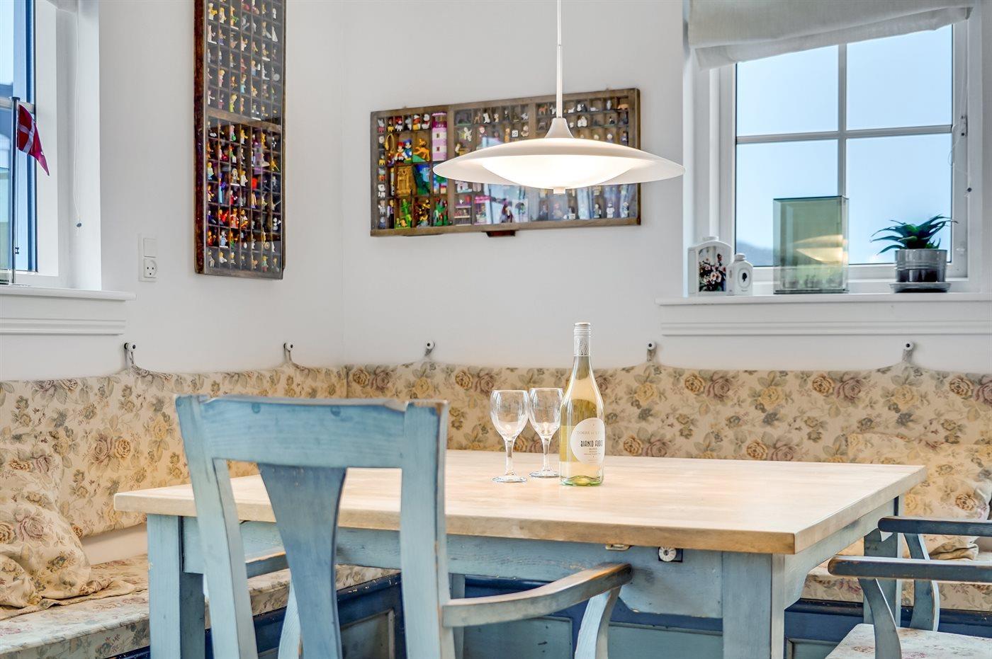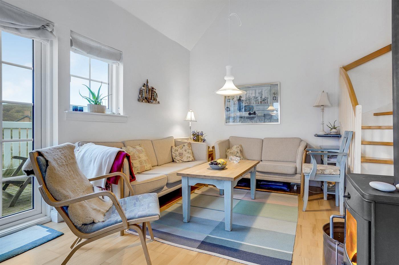I stuen er der en spisekrog med slagbænke. (I den ene slagbænk ligger hynder til terrassestolene.) Desuden er der et sofahjørne, brændeovn og TV med både danske, tyske, norske, svenske og engelske kanaler. Der er trådløst internet til rådighed.