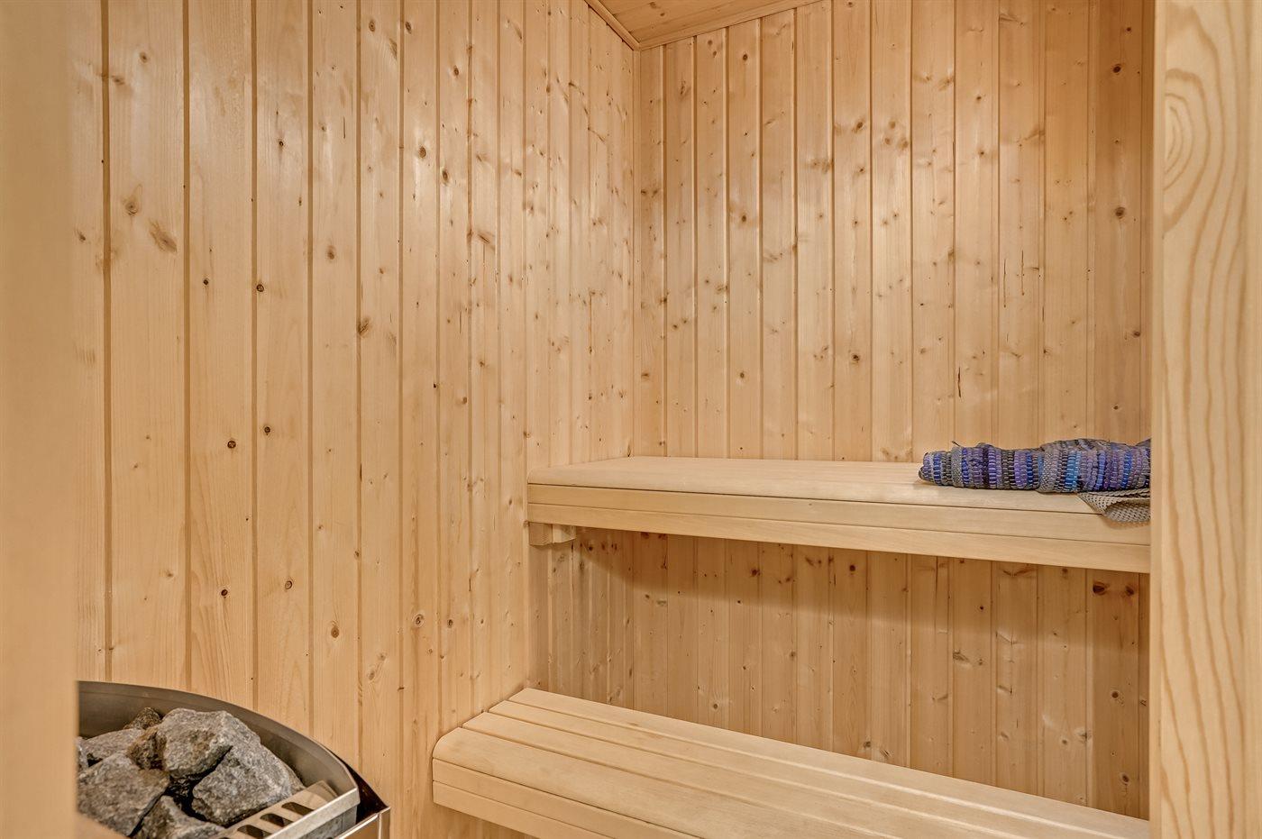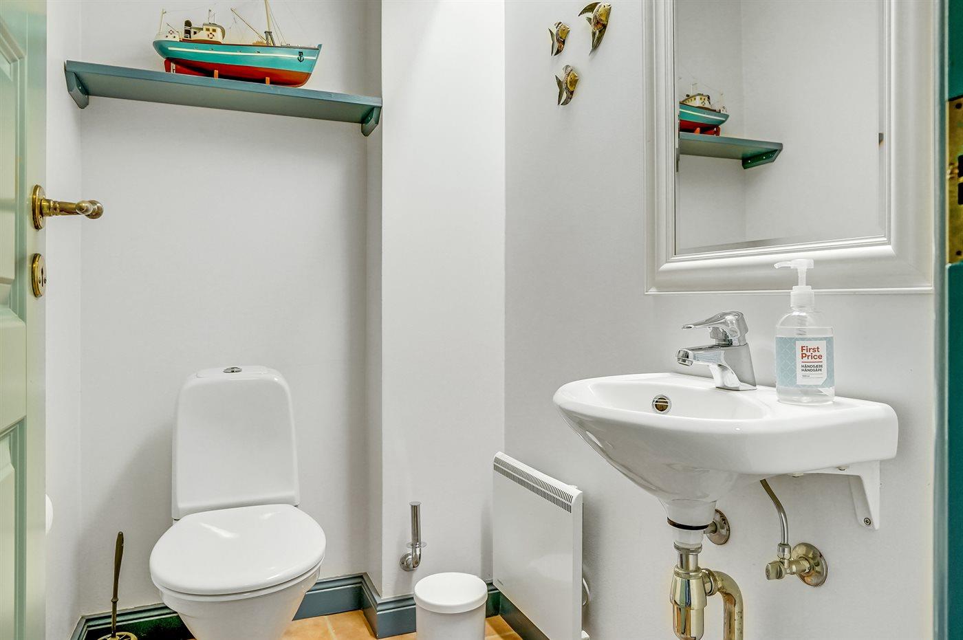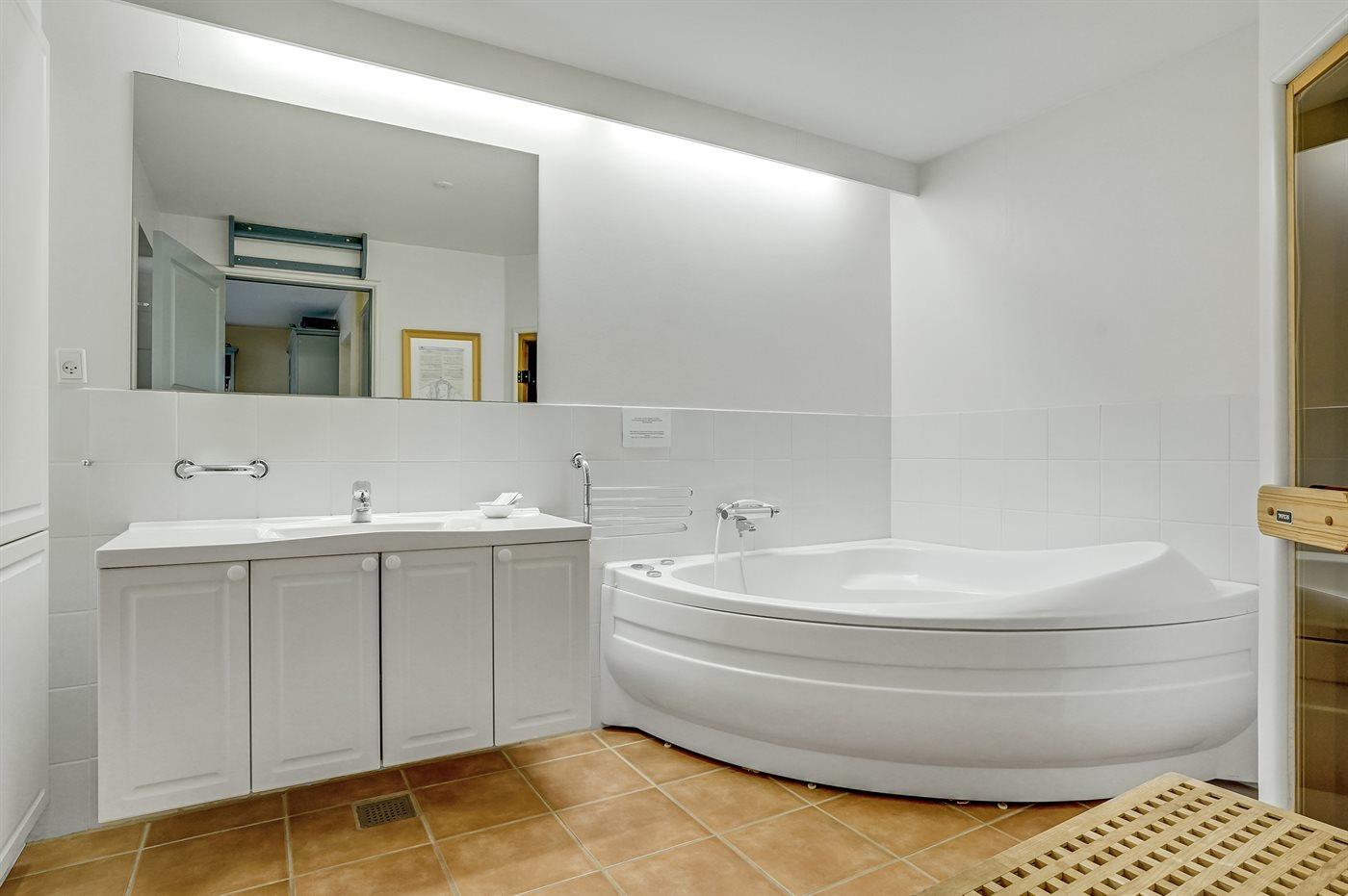 Huset har et separat toilet med håndvask, så der er god mulighed for at nyde wellness i det store badeværelse ved siden af. Badeværelset har spabad, en lille sauna, bruseniche samt gulvvarme. Desuden er der både vaskemaskine og tørretumbler placeret i skabe i badeværelset.