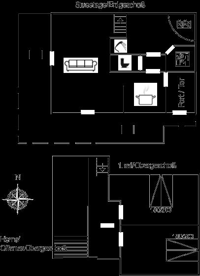 Ferieboligen er på 96 m² fordelt på to plan. Ovenpå er der to soveværelser med dobbeltsenge og en hyggelig hems med to enkeltsenge, hvor børn elsker at opholde sig.