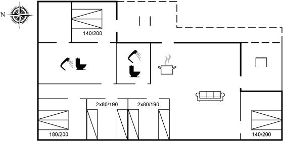 Der er i alt 5 soveværelser. Sovepladserne fordeler sig på: 6 sovepladser i dobbeltsenge. 4 sovepladser i enkeltsenge. Derudover er der 1 stk. barneseng.