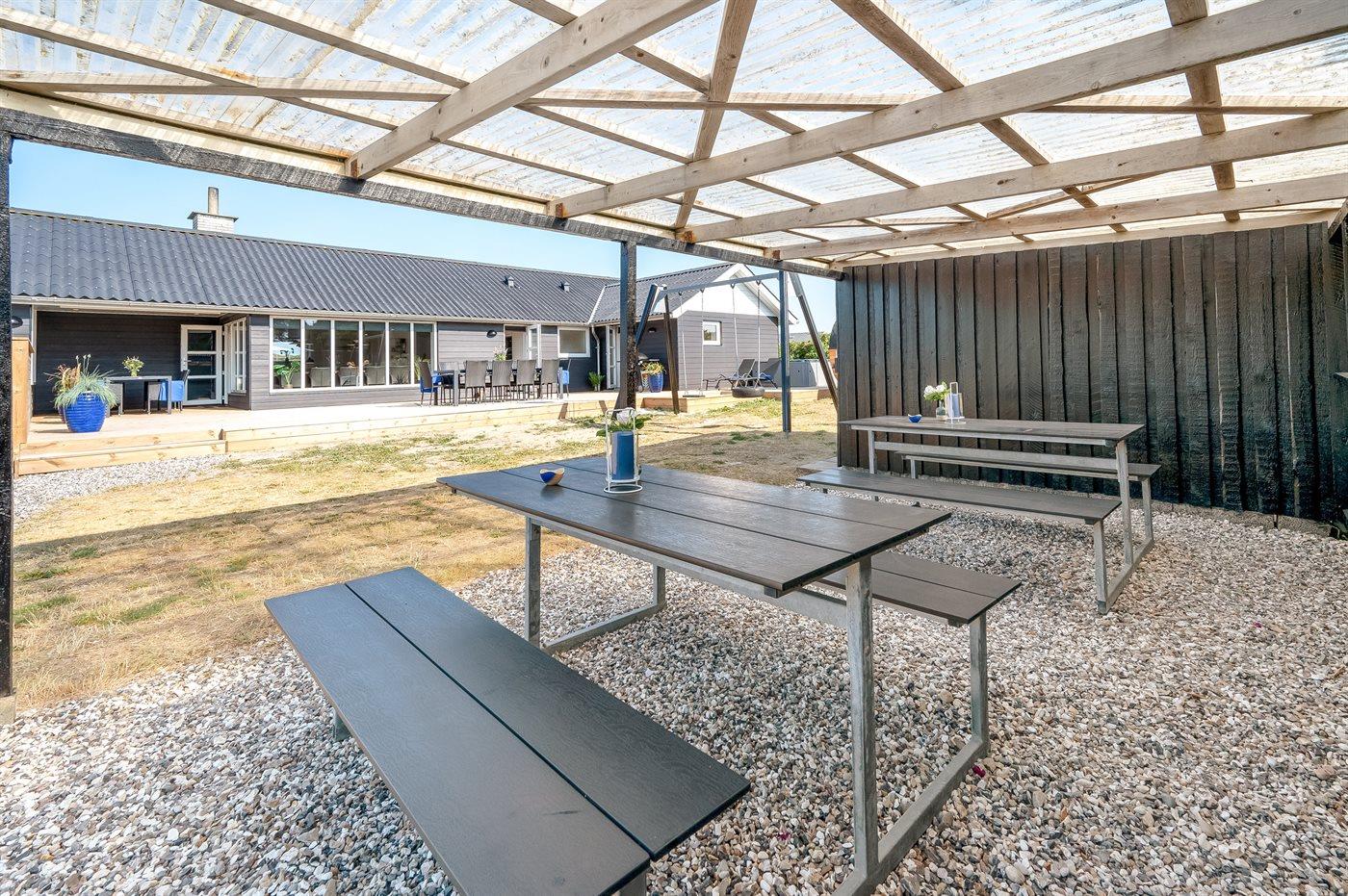 Ferieboligen er beliggende på en 1200 m² stor naturgrund. Der er 200 m til havet. Nærmeste forretning er beliggende i en afstand af 900 m. Til ferieboligen hører åbent terrasseareal. Desuden er der overdækket terrasse. Gynge. Sandkasse. Udendørs sauna. Parkering ved ferieboligen.