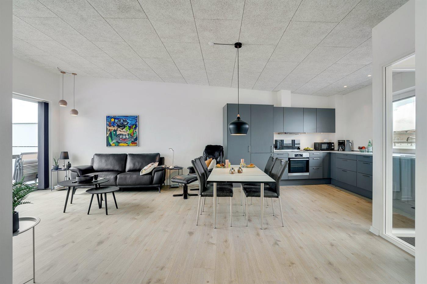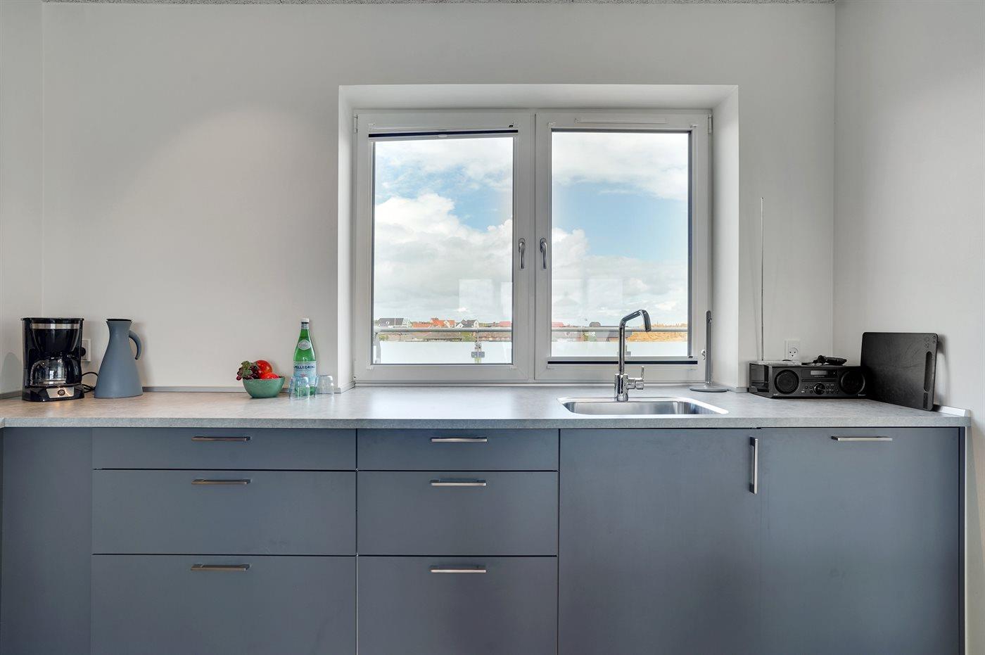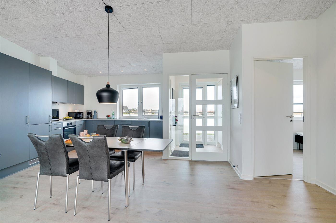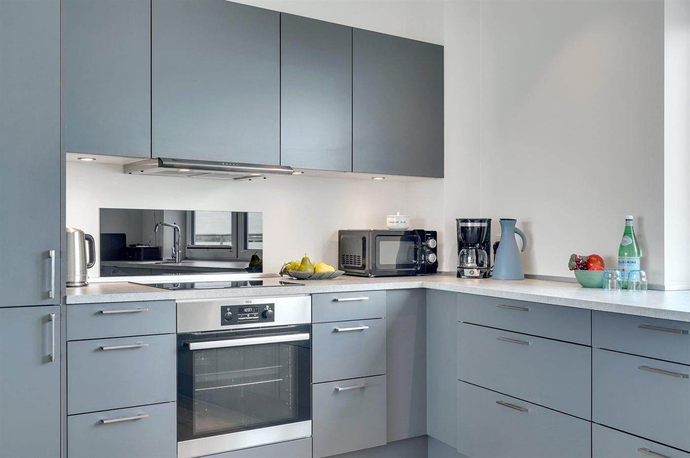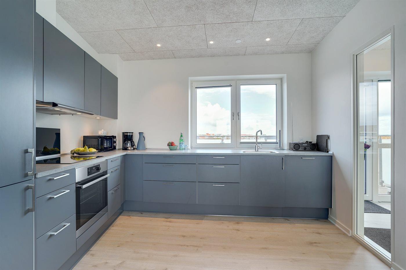 Køkkenet er udstyret med 1 køleskab. Der er 4 induktionskogeplader, varmluftovn, mikrobølgeovn samt opvaskemaskine.
