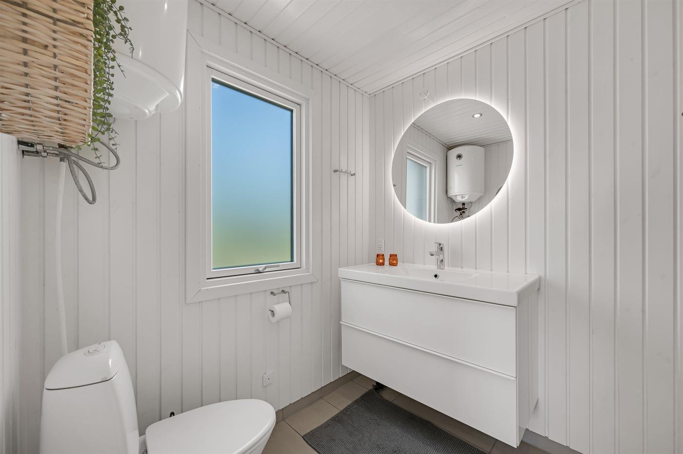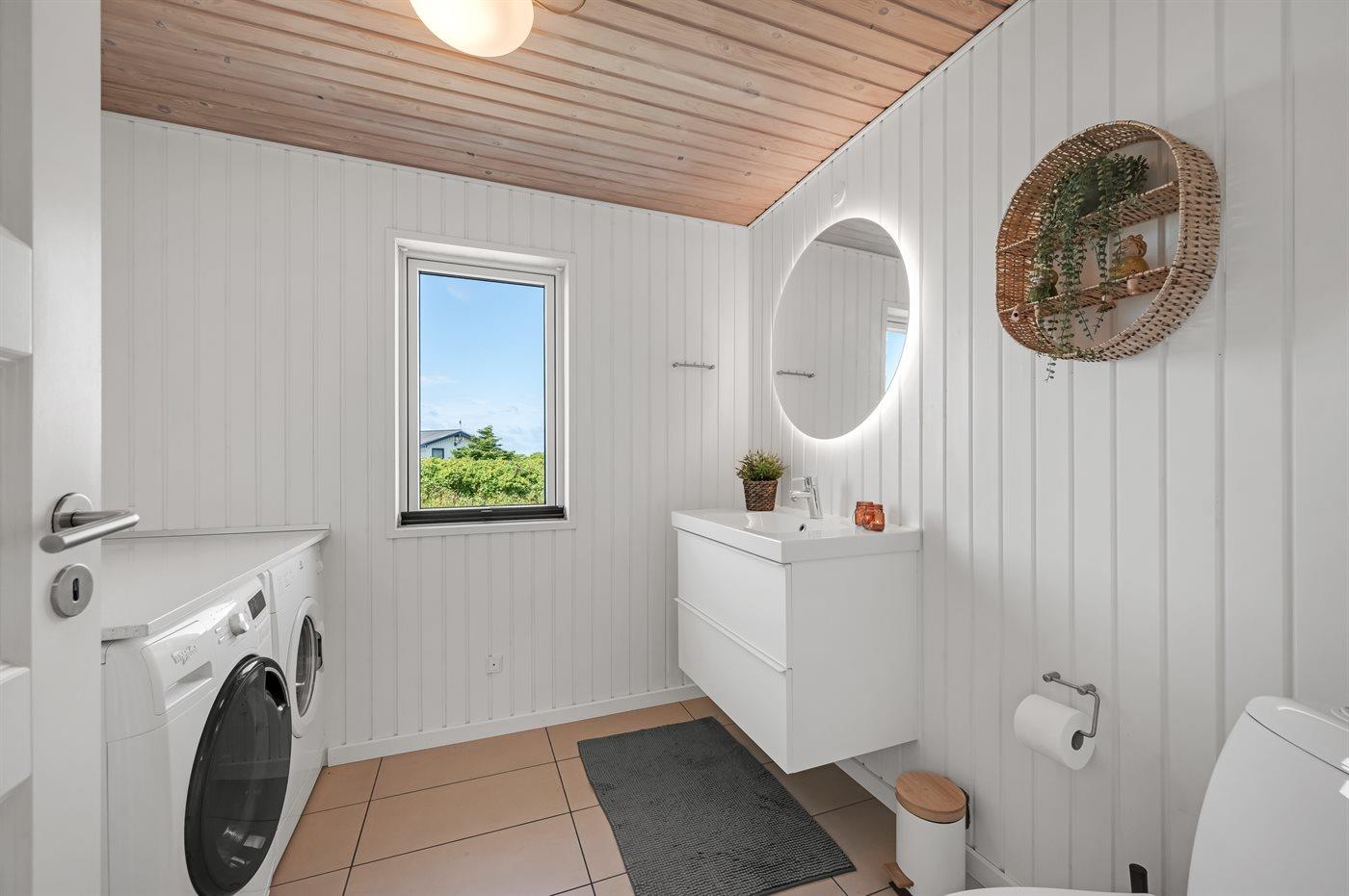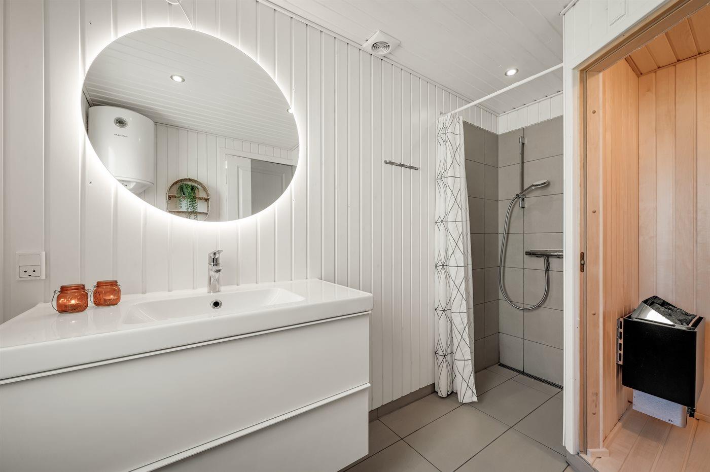 Der er 1 badeværelse med bruser og 2 toiletter, heraf 1 gæstetoilet. Der er gulvvarme på 2 badeværelser. I saunaen er der mulighed for afslapning.