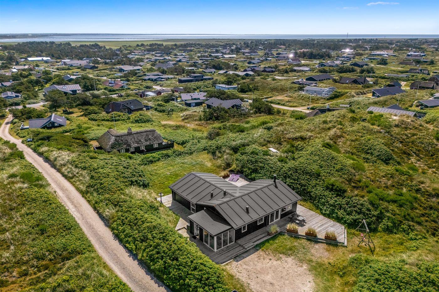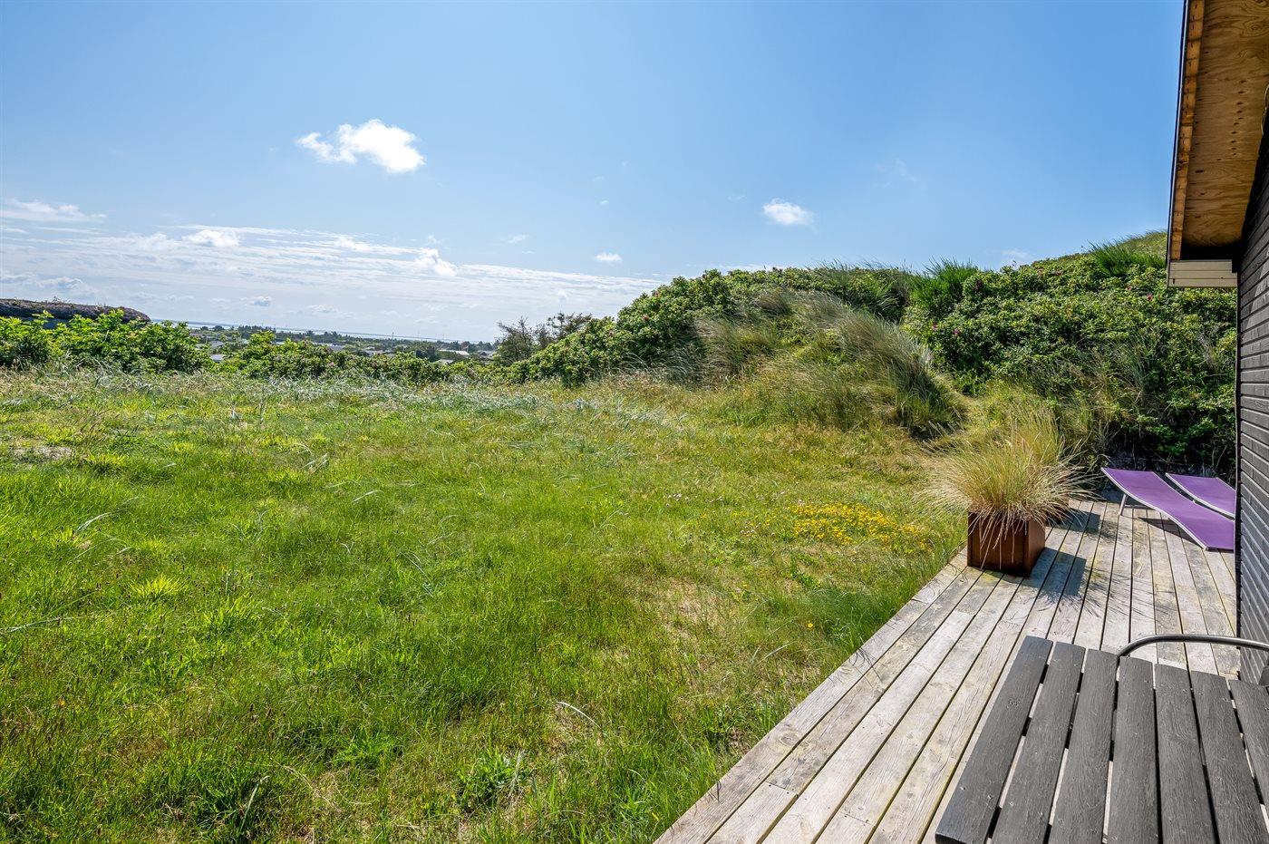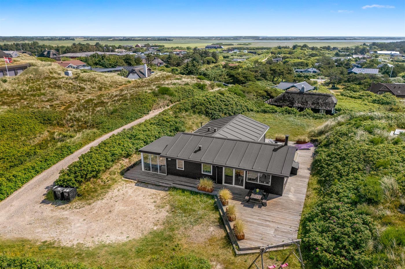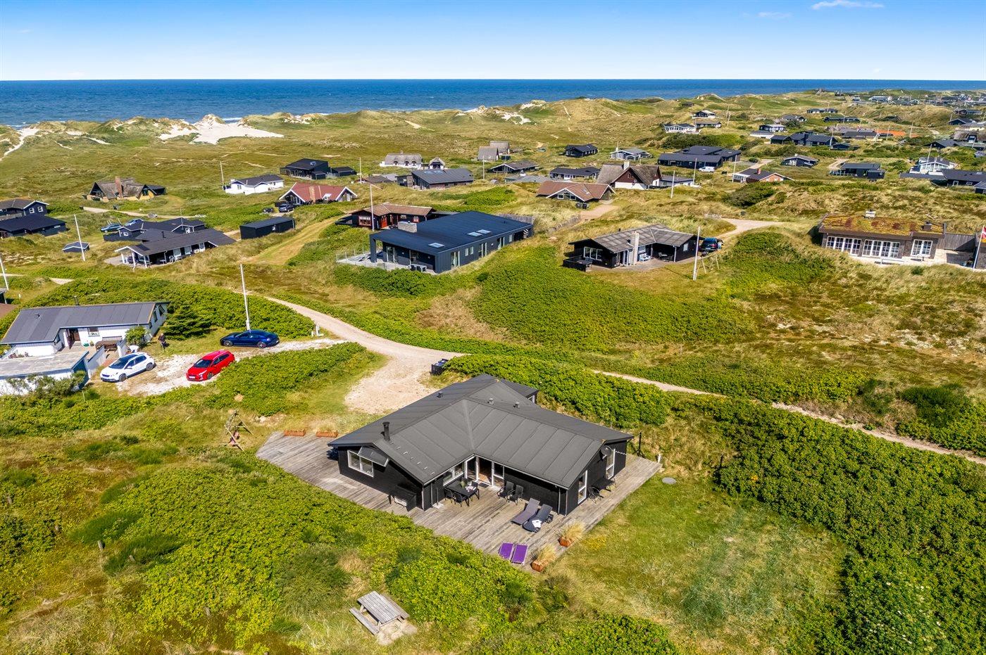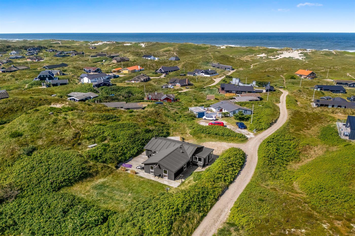 Sommerhus, løbende renoveret, med en virkelig attraktiv beliggenhed. Huset ligger højt på en kuperet grund mellem hav og fjord, hvor der fra stuen og køkkenet er en fantastisk udsigt over Vesterhavet, og fra østsiden af huset udsigt over Ringkøbing Fjord. Huset har en sydvendt terrasse, som ligger i læ af klitterne. Huset har i 2014 moderniseret badeværelse med adgang til infrarød sauna.