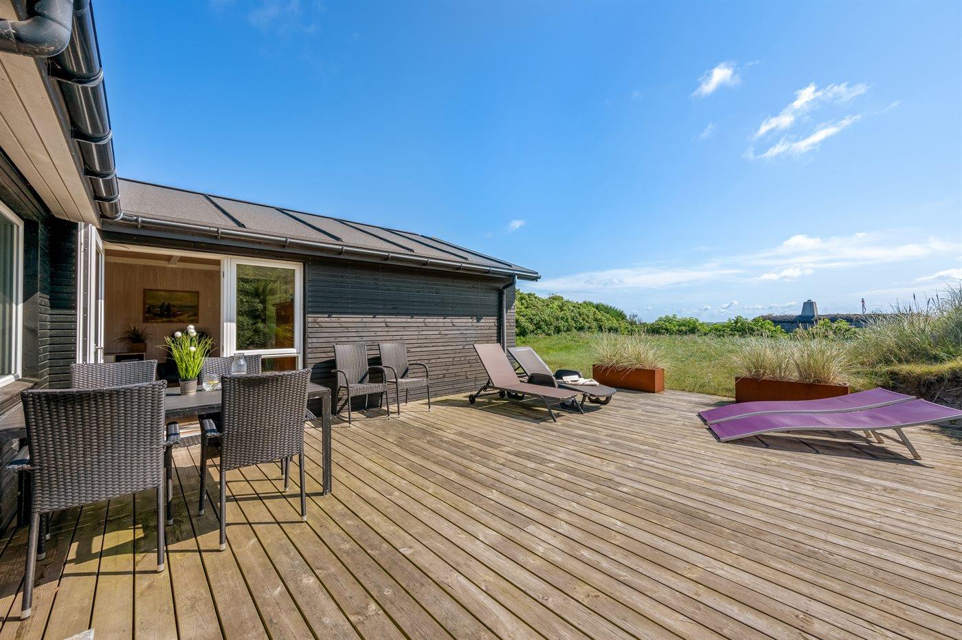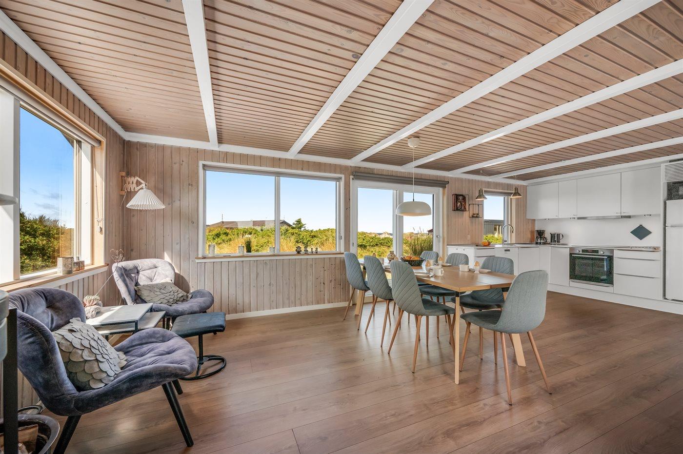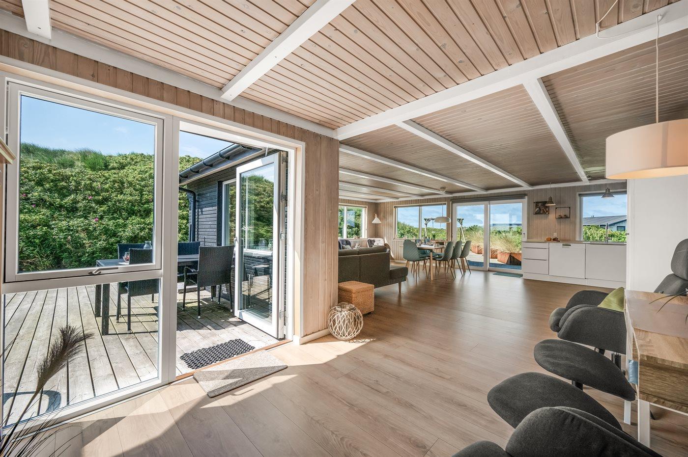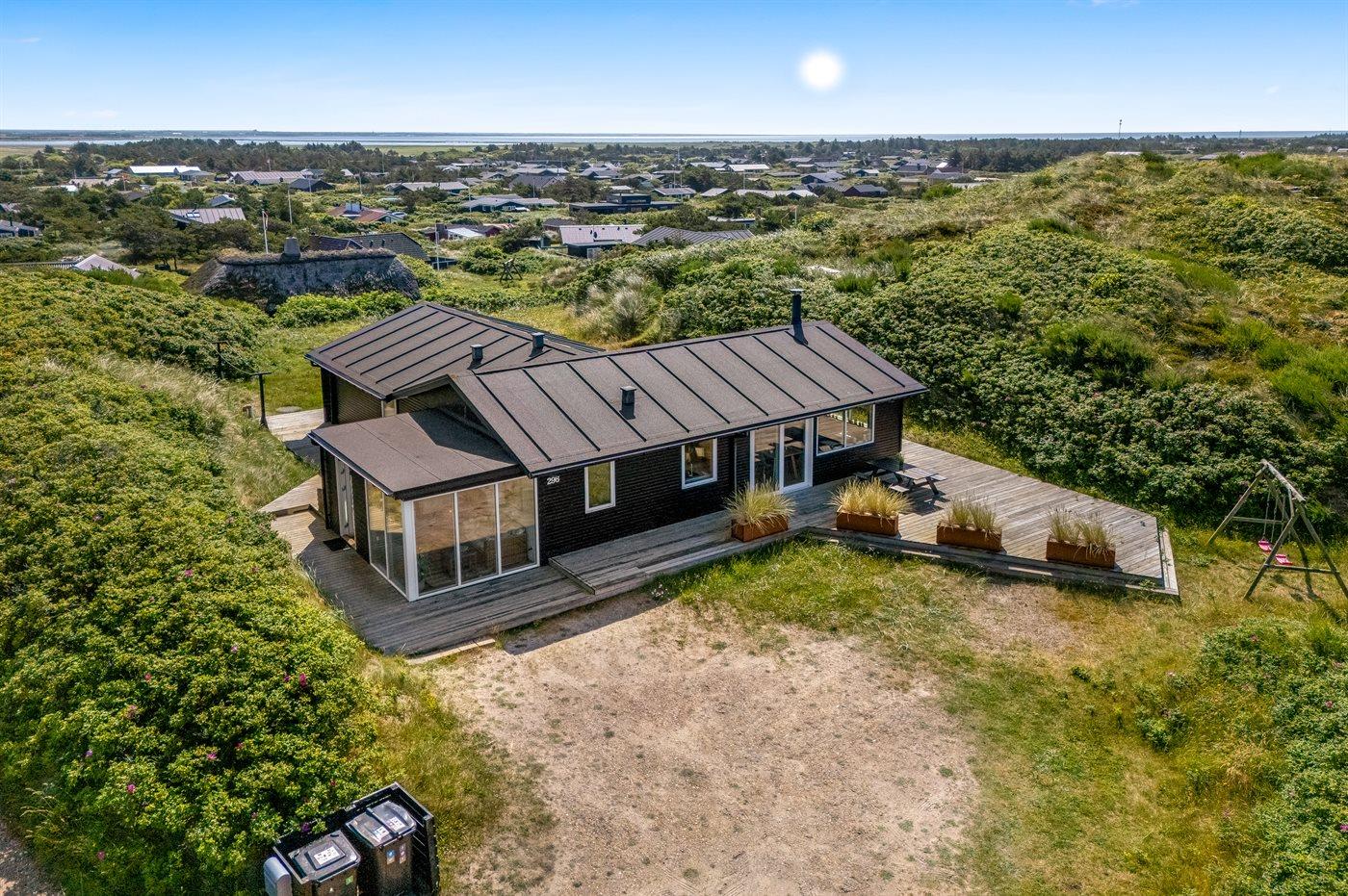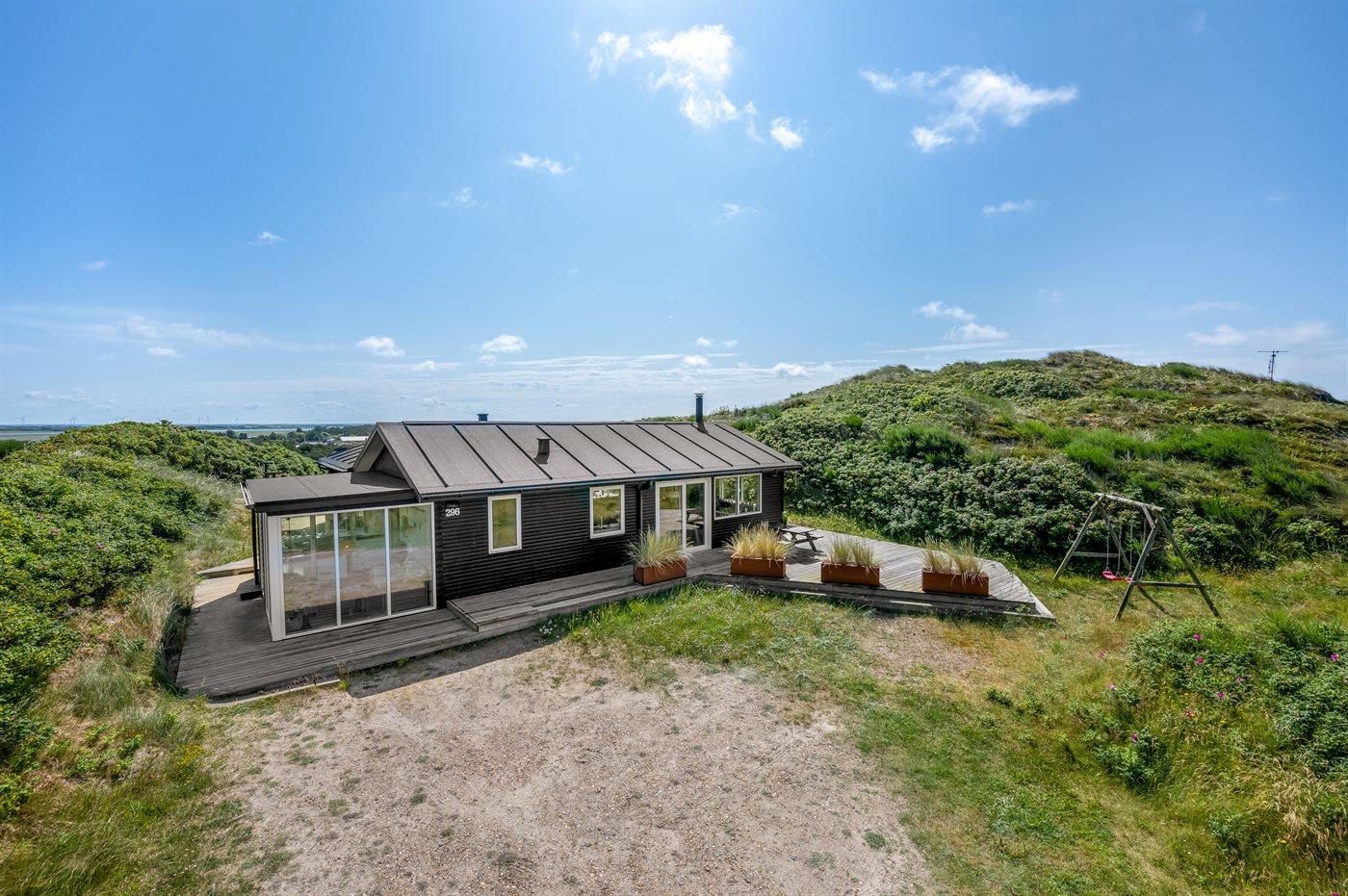 Sommerhus, løbende renoveret, med en virkelig attraktiv beliggenhed. Huset ligger højt på en kuperet grund mellem hav og fjord, hvor der fra stuen og køkkenet er en fantastisk udsigt over Vesterhavet, og fra østsiden af huset udsigt over Ringkøbing Fjord. Huset har en sydvendt terrasse, som ligger i læ af klitterne. Huset har i 2014 moderniseret badeværelse med adgang til infrarød sauna.