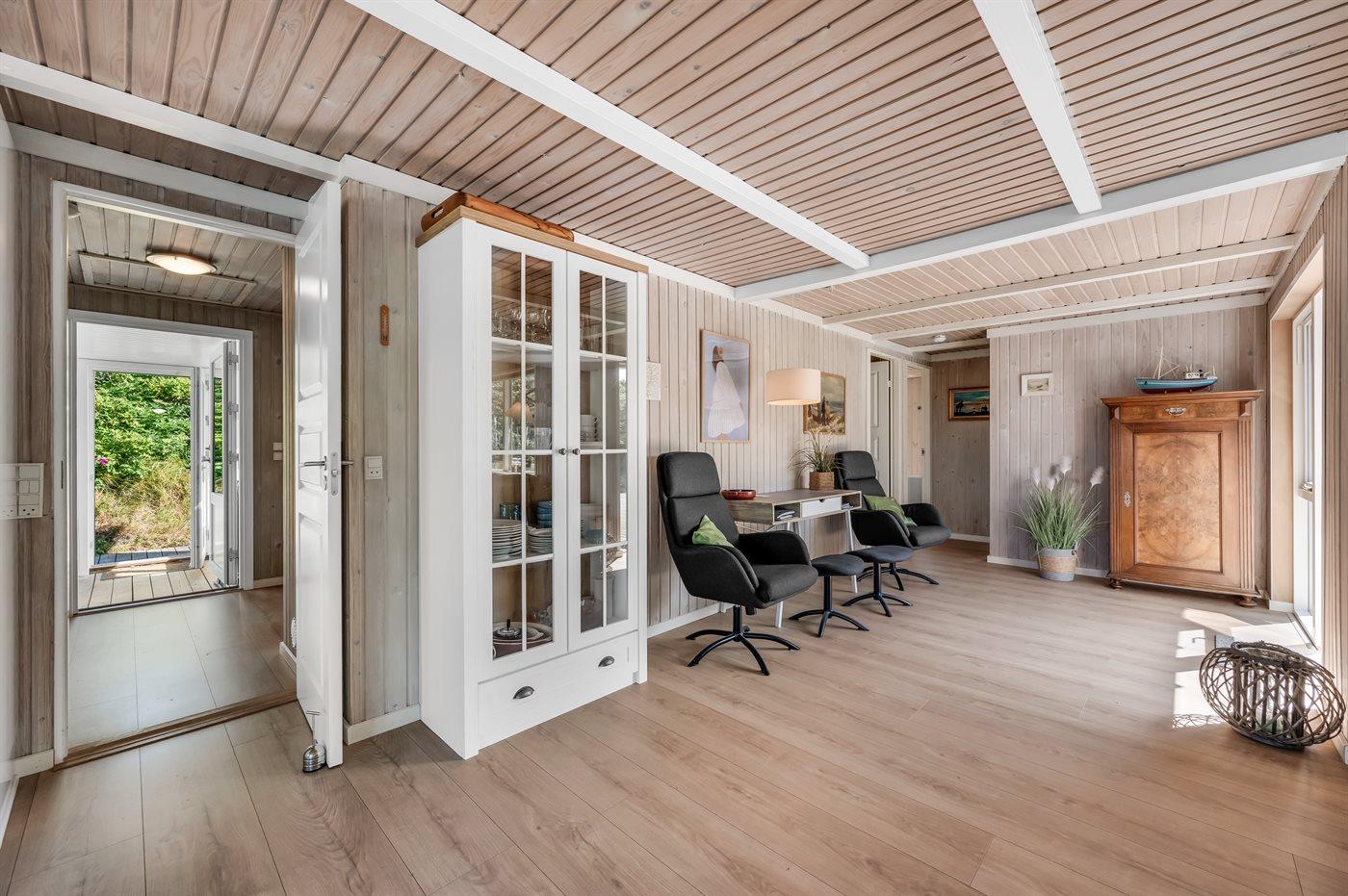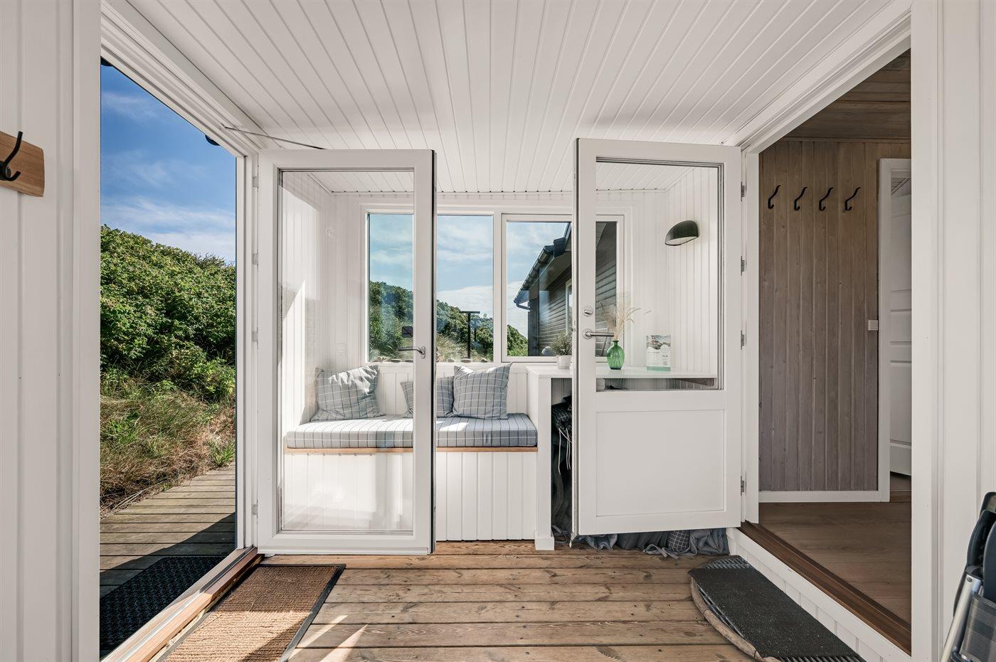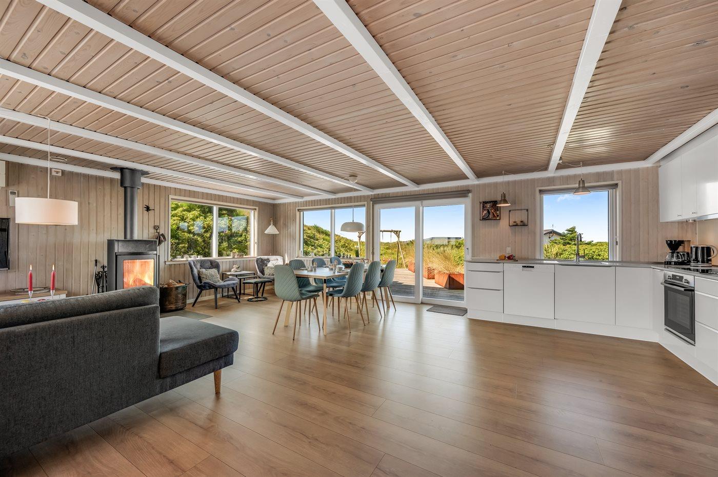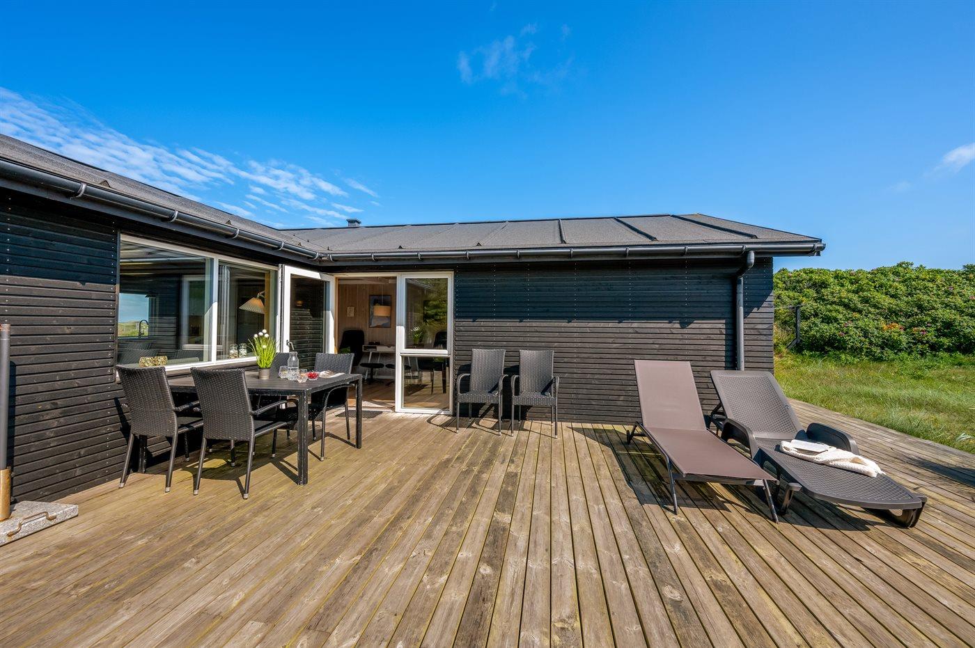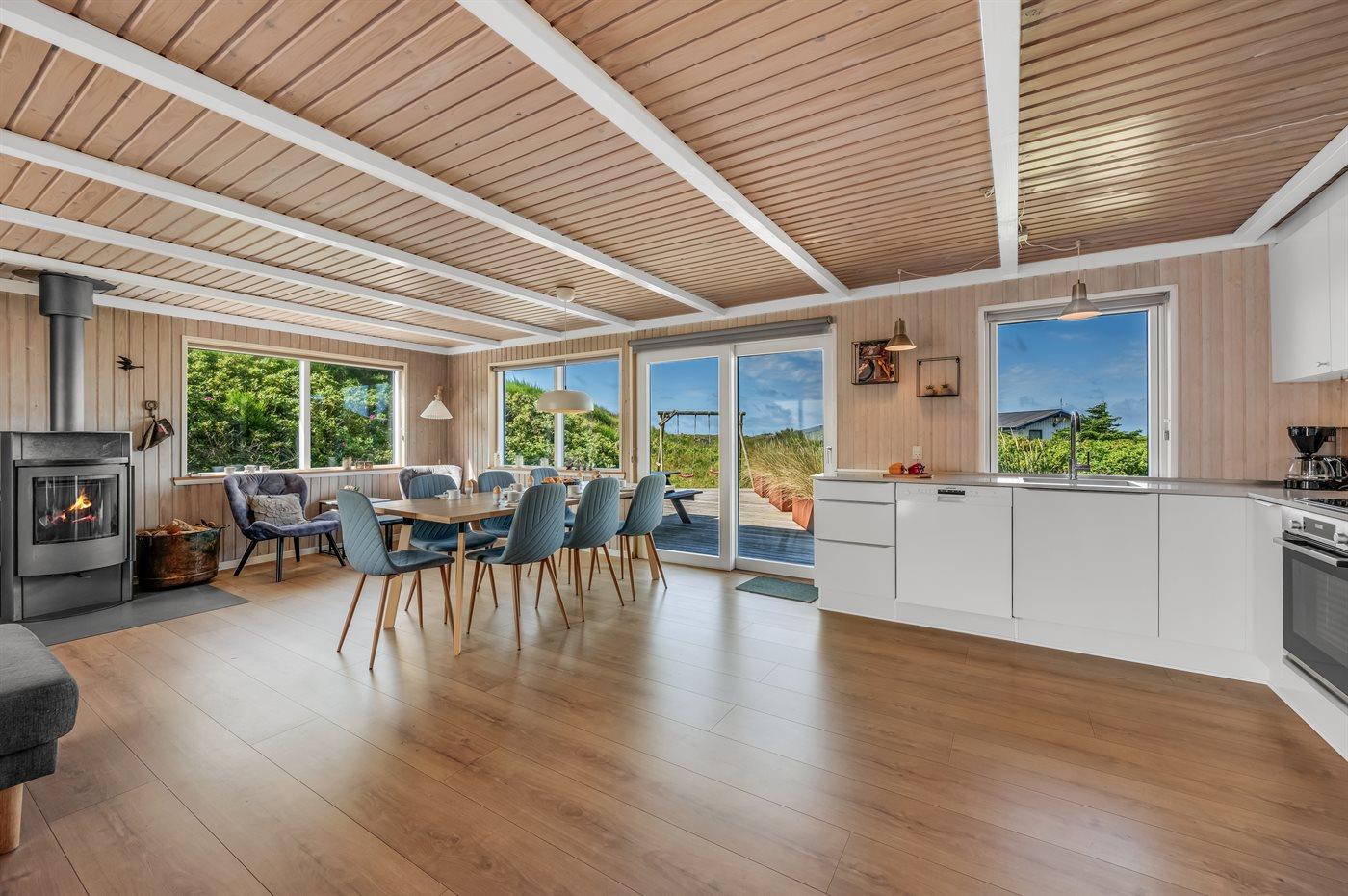 Sommerhus, løbende renoveret, med en virkelig attraktiv beliggenhed. Huset ligger højt på en kuperet grund mellem hav og fjord, hvor der fra stuen og køkkenet er en fantastisk udsigt over Vesterhavet, og fra østsiden af huset udsigt over Ringkøbing Fjord. Huset har en sydvendt terrasse, som ligger i læ af klitterne. Huset har i 2014 moderniseret badeværelse med adgang til infrarød sauna.