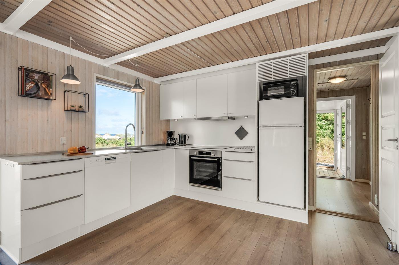 Køkkenet er udstyret med 1 køleskab. Der er 4 induktionskogeplader, bageovn, mikrobølgeovn samt opvaskemaskine.
