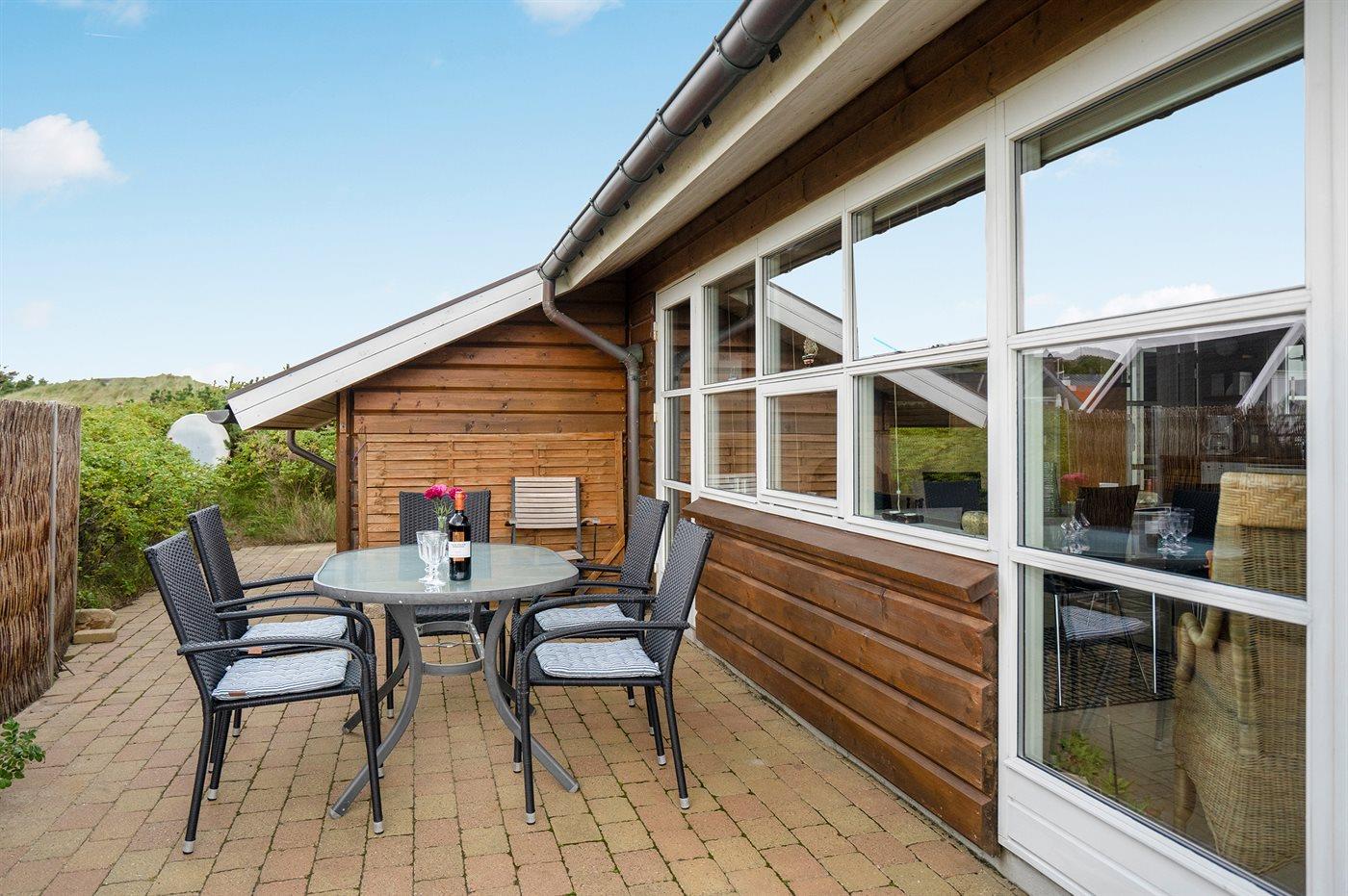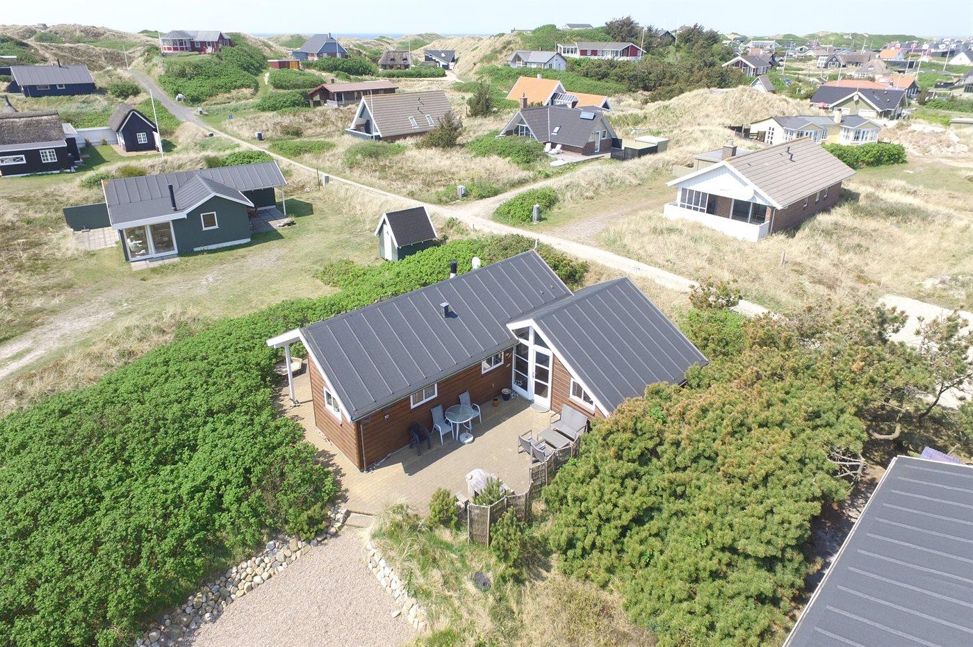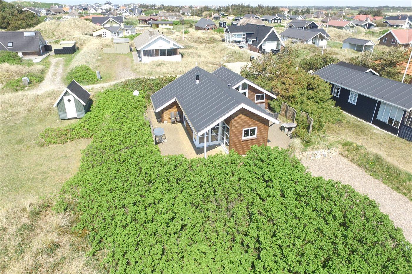 Dejligt familiesommerhus i træ, bygget i 2005, beliggende på en klitgrund kun 400 m fra Vesterhavet og i gåafstand til Søndervigs centrum og golfbane. Stort åbent og overdækket terrasseareal med diverse havemøbler. Opvarmet klinkegulv overalt, dog trægulv på værelserne. Der er installeret 2 energibesparende varmepumper. Lækkert badeværelse med bruseniche og gulvvarme. Køkken med komfur med keramiske kogeplader, varmluftovn, opvaskemaskine og mikrobølgeovn. Hyggeligt indrettet og møbleret stue med brændeovn, 32" fladskærms-TV med parabol (digital), DVD-afspiller og stereoanlæg med CD-afspiller. Gratis, trådløs internetforbindelse (egen computer skal medbringes). 2 gode soveværelser med dobbeltseng og hems med gode legemuligheder for børn. Grovkøkken med vaskemaskine, tørretumbler og fryser. Tilbygning med sauna, badeværelse med bruseniche samt værelse med dobbeltseng. Barneseng og sandkasse til børnene. Et dejligt og veludført sommerhus, centralt beliggende og tæt på bl.a. aktiviteter, supermarked og restauranter.