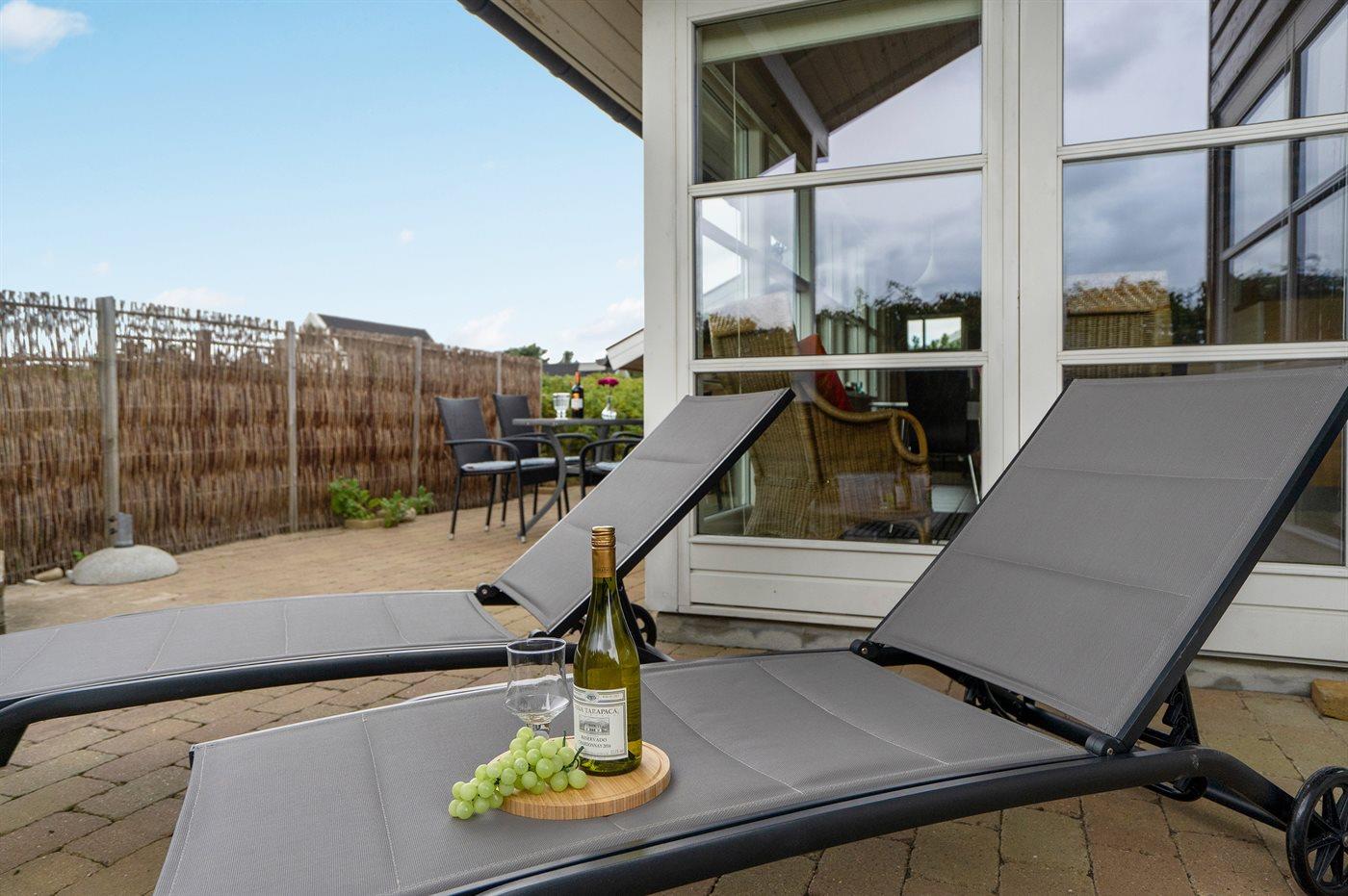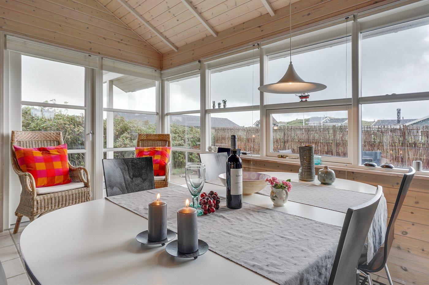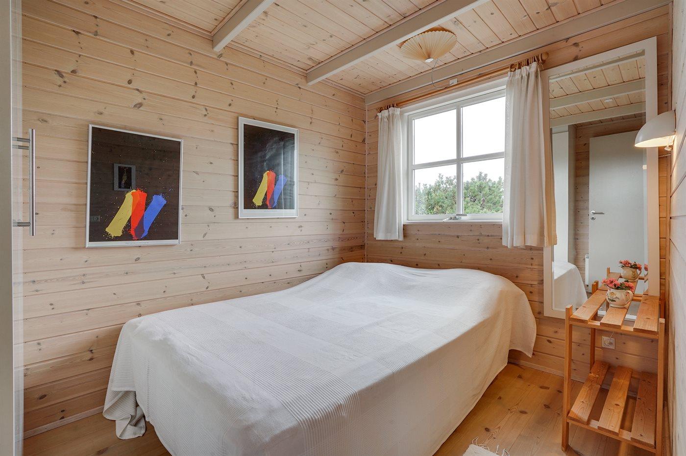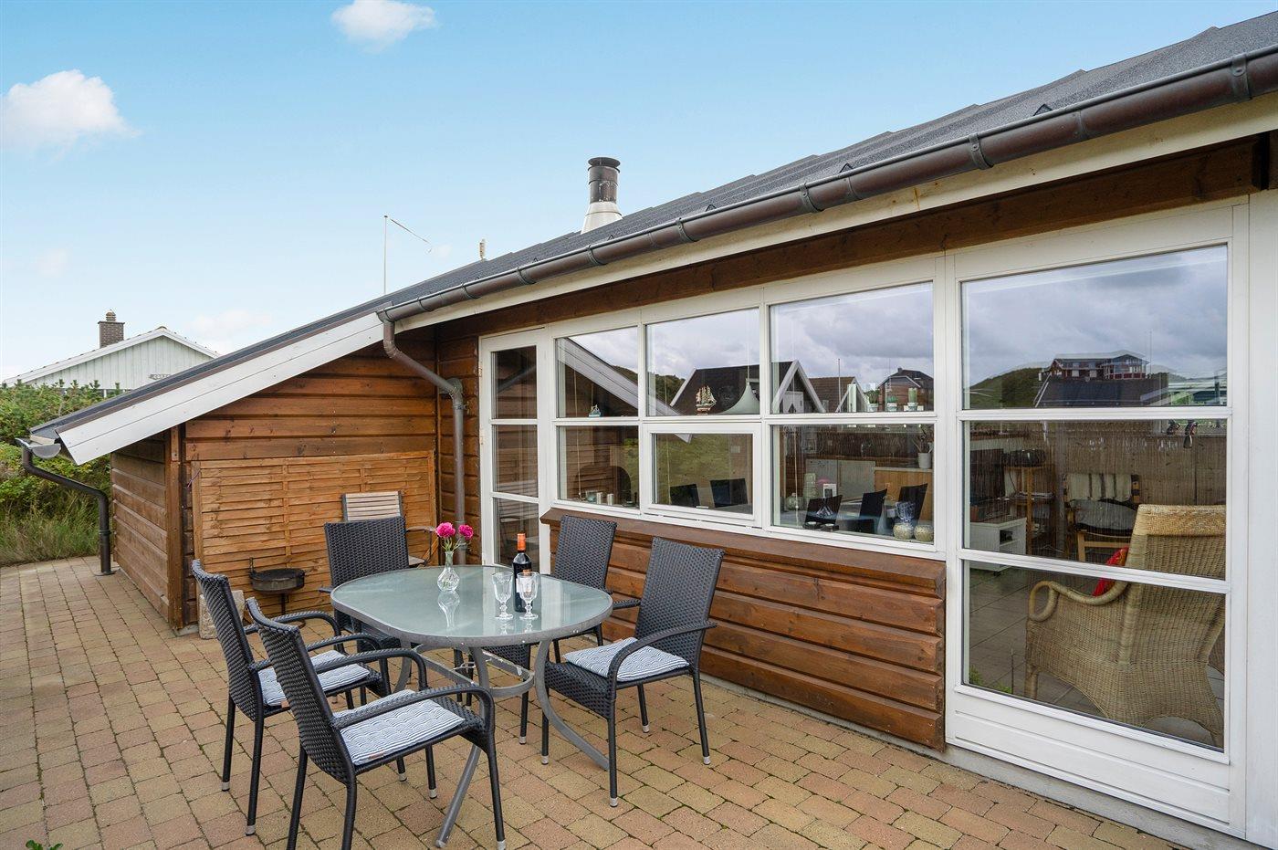 Dejligt familiesommerhus i træ, bygget i 2005, beliggende på en klitgrund kun 400 m fra Vesterhavet og i gåafstand til Søndervigs centrum og golfbane. Stort åbent og overdækket terrasseareal med diverse havemøbler. Opvarmet klinkegulv overalt, dog trægulv på værelserne. Der er installeret 2 energibesparende varmepumper. Lækkert badeværelse med bruseniche og gulvvarme. Køkken med komfur med keramiske kogeplader, varmluftovn, opvaskemaskine og mikrobølgeovn. Hyggeligt indrettet og møbleret stue med brændeovn, 32" fladskærms-TV med parabol (digital), DVD-afspiller og stereoanlæg med CD-afspiller. Gratis, trådløs internetforbindelse (egen computer skal medbringes). 2 gode soveværelser med dobbeltseng og hems med gode legemuligheder for børn. Grovkøkken med vaskemaskine, tørretumbler og fryser. Tilbygning med sauna, badeværelse med bruseniche samt værelse med dobbeltseng. Barneseng og sandkasse til børnene. Et dejligt og veludført sommerhus, centralt beliggende og tæt på bl.a. aktiviteter, supermarked og restauranter.
