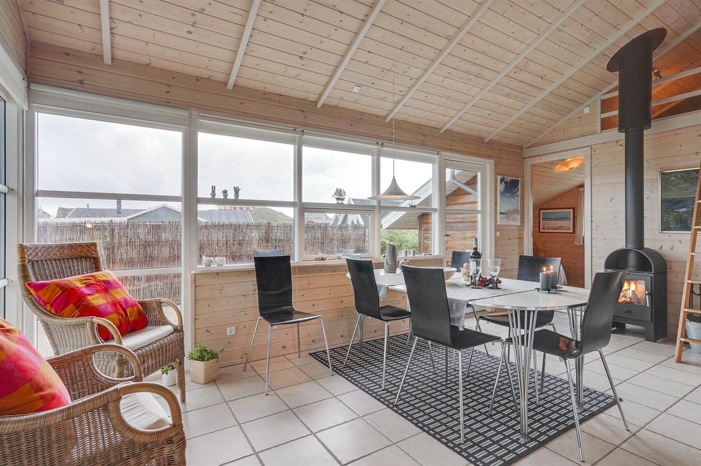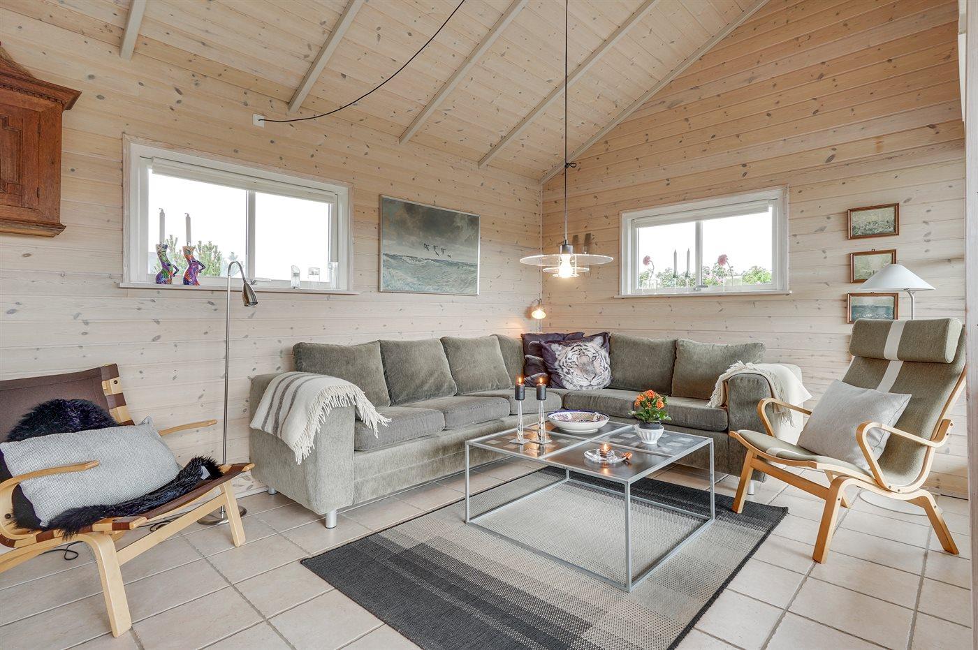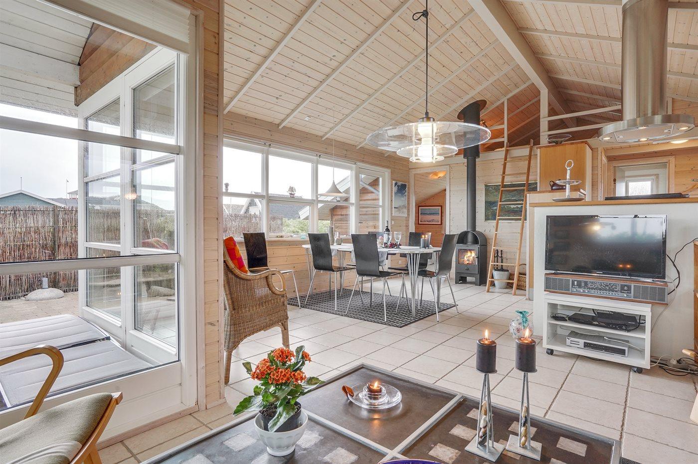 Hyggeligt træsommerhus fra 2005 nær Vesterhavet med sauna, brændeovn og stor terrasse i Søndervig.