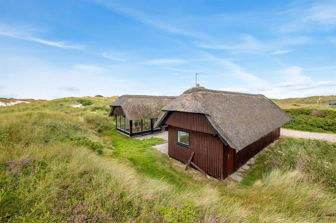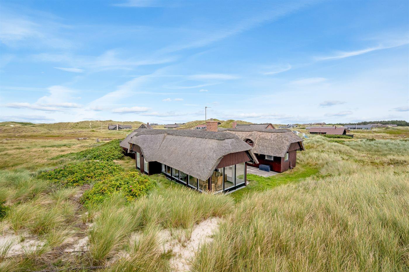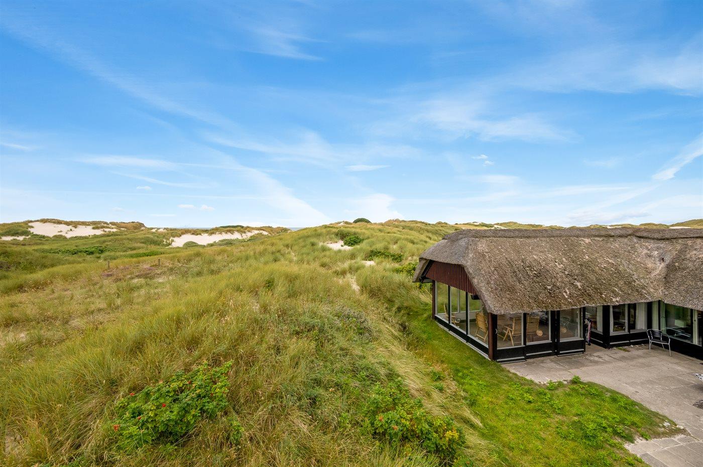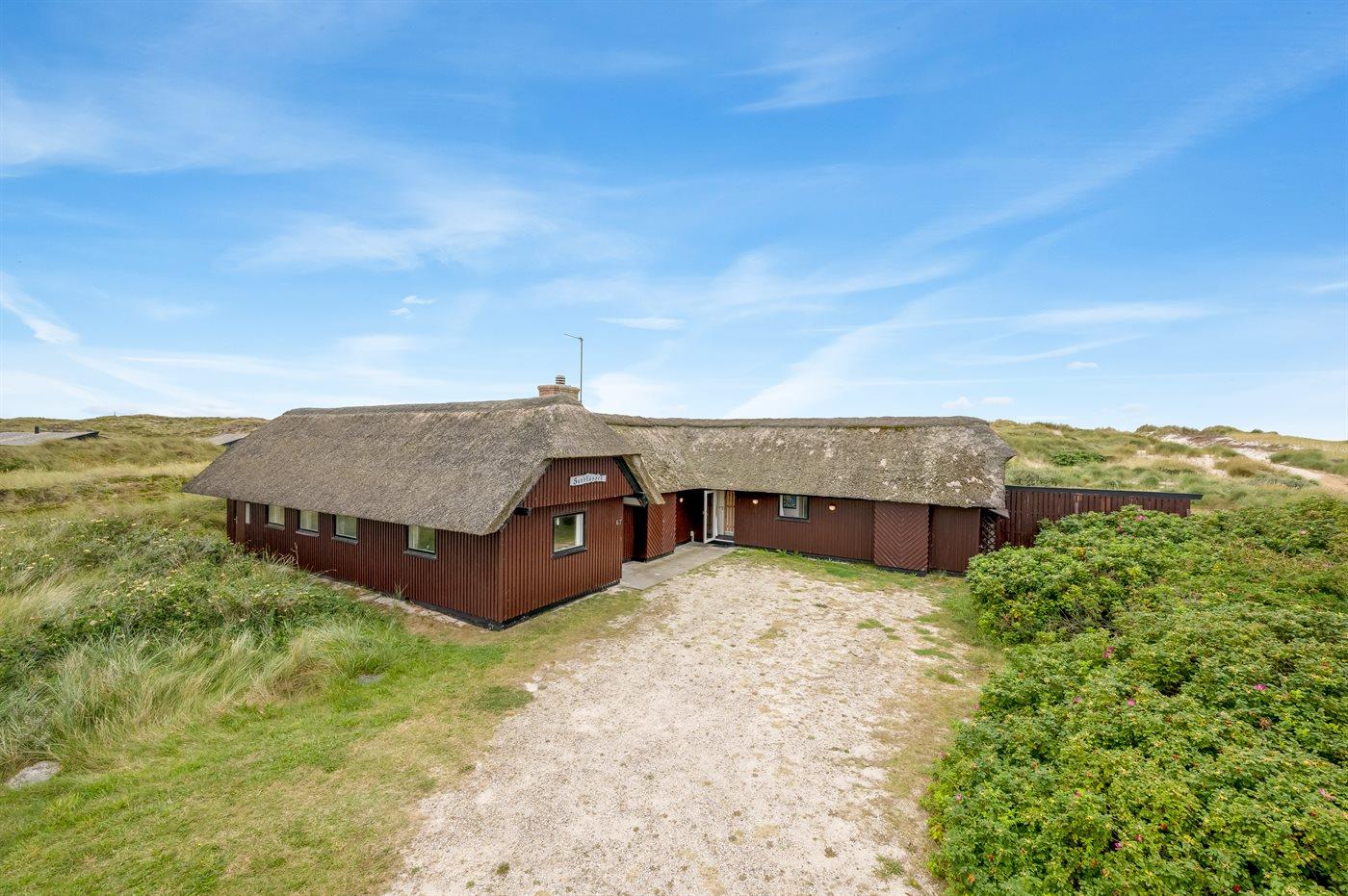 Unikt, rummeligt sommerhus beliggende på en meget stor klitgrund i første række op til fredningslinien direkte til Vesterhavet med udsigt til både hav og fjord fra grunden. På grunden er anlagt en stor gårdsplads med rigelig plads til parkering i god afstand fra vejen. Vest for huset ned mod stranden ligger et stort område velegnet til boldspil m.m. Huset er opført i gammel bondehusstil med stråtag og senere udvidet i samme stil med integreret overdækket og lukket terrasse. Huset er løbende moderniseret, og består af to sidefløje forbundet med hovedfløjen. Mellem fløjene er anlagt en sydvendt solgård. Terrassen kan åbnes til/fra solgården med skydedøre. Huset er velegnet til 2 familier i hver sin fløj og med fællesareal i hovedfløjen. Nærmeste indkøbsområde er Søndervig, som befinder sig få minutters kørsel (ca. 2 km) fra huset. Her findes et bredt udvalg af spændende butikker, restauranter samt golfbane.