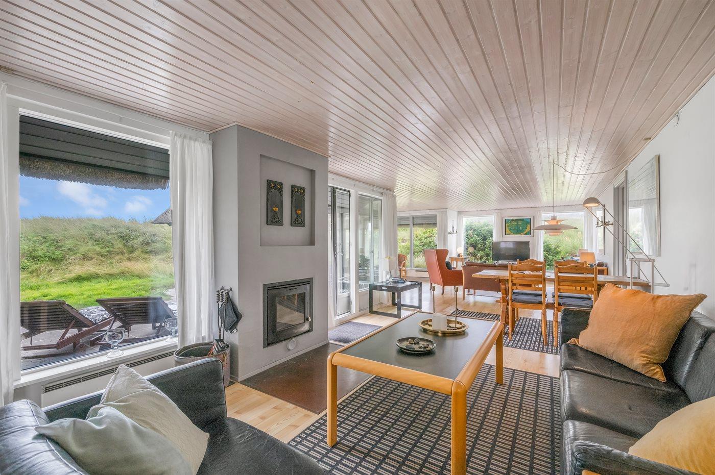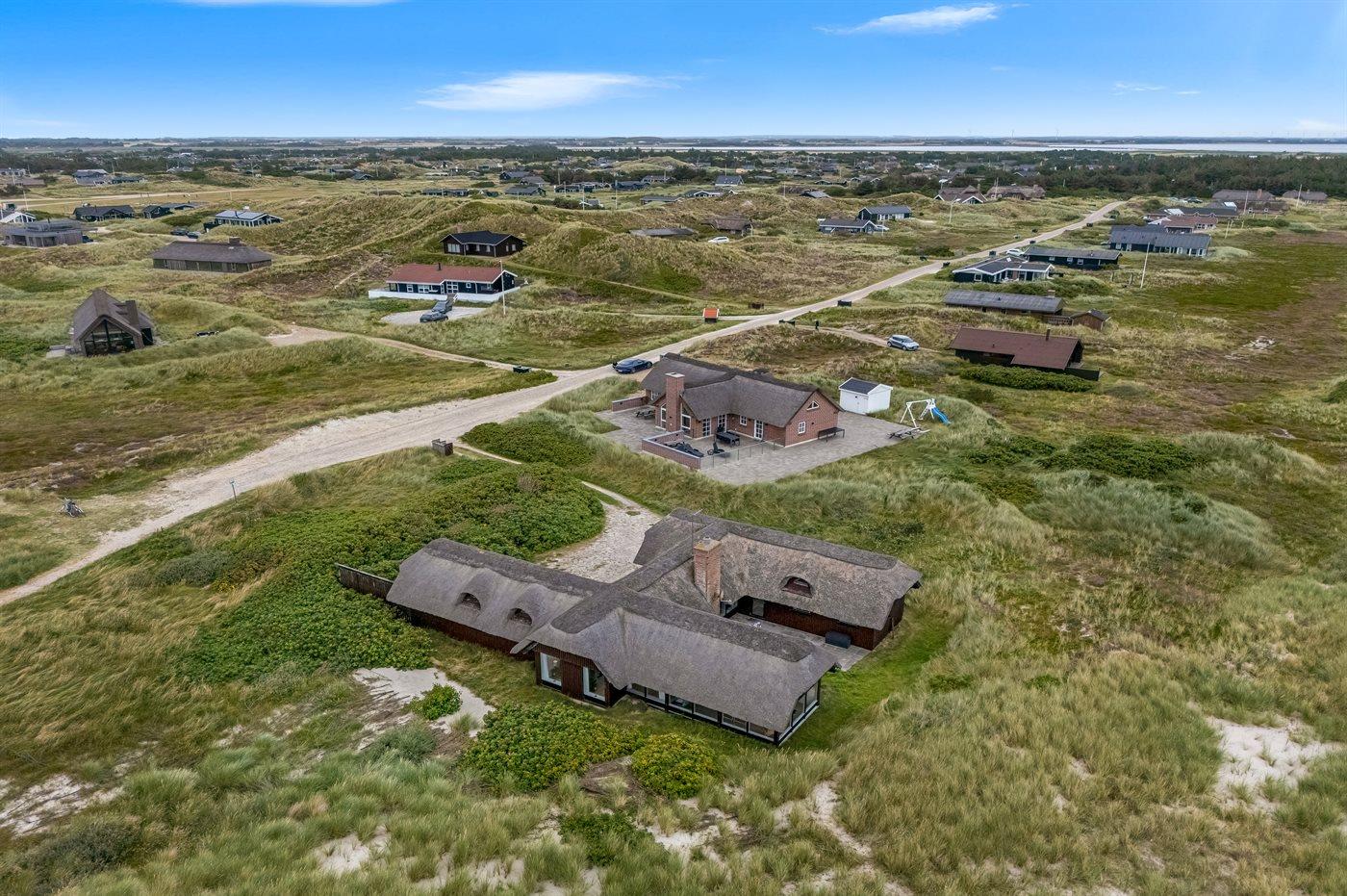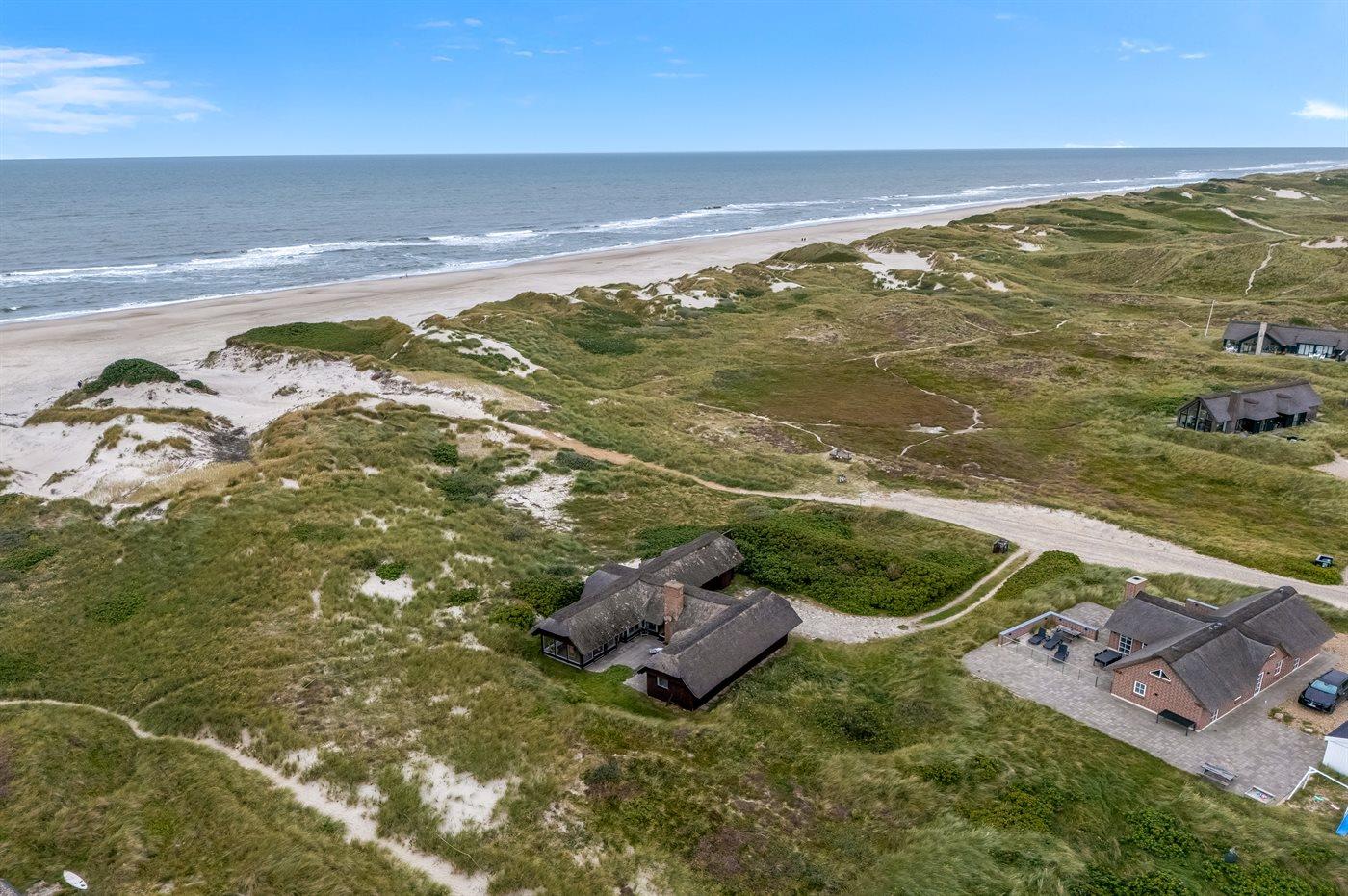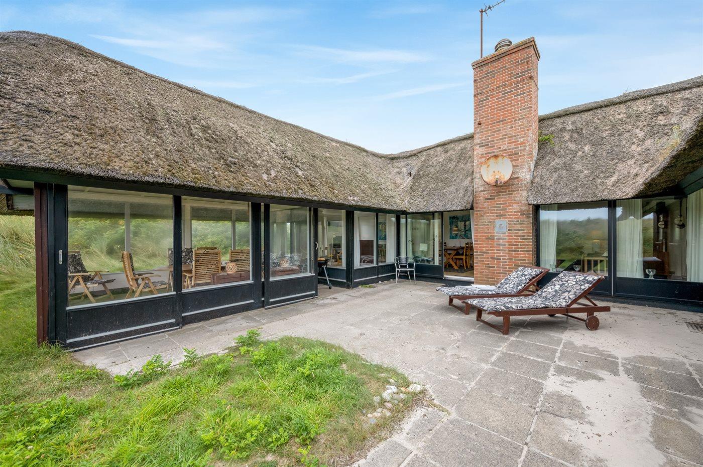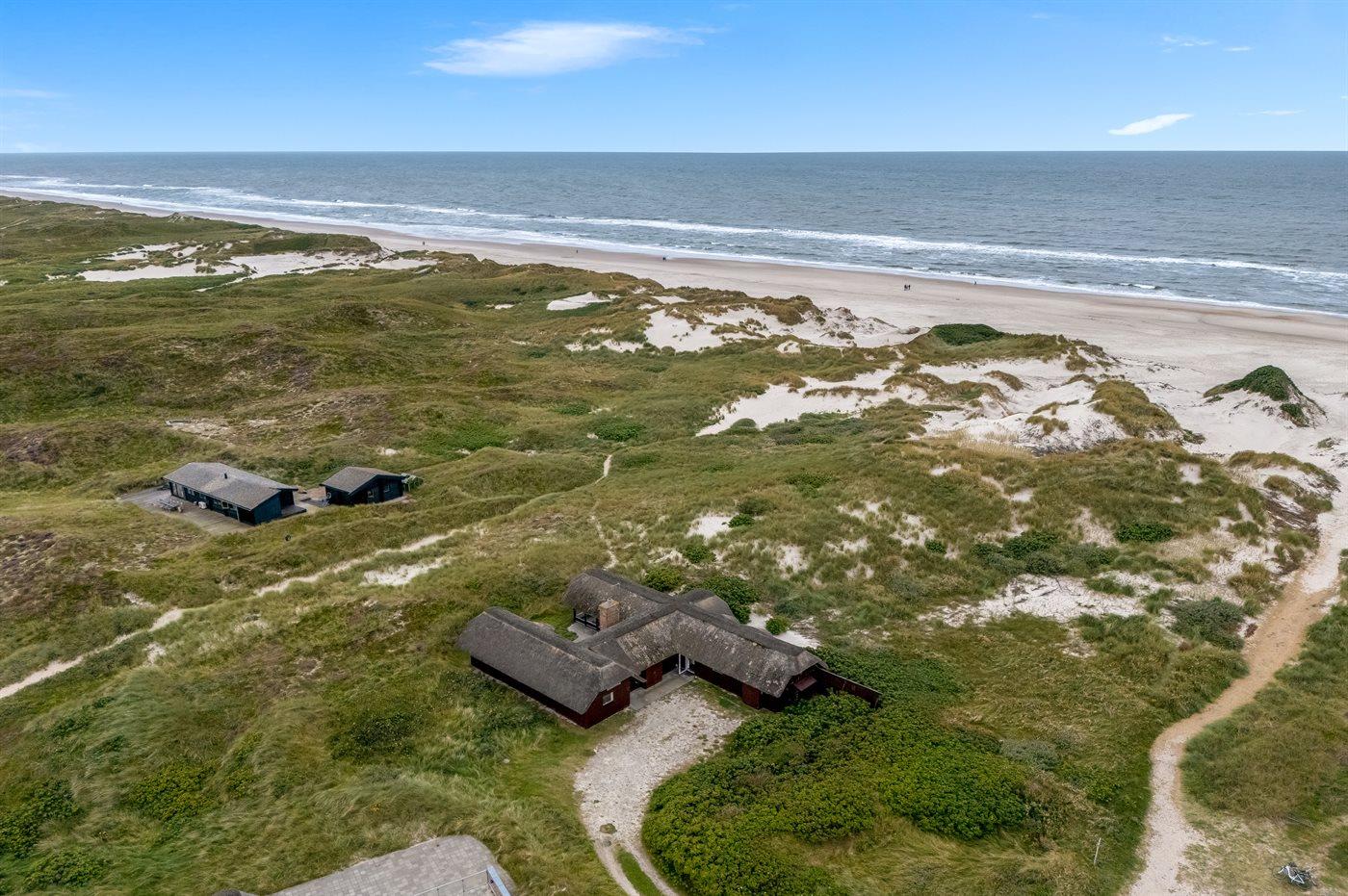 Unikt, rummeligt sommerhus beliggende på en meget stor klitgrund i første række op til fredningslinien direkte til Vesterhavet med udsigt til både hav og fjord fra grunden. På grunden er anlagt en stor gårdsplads med rigelig plads til parkering i god afstand fra vejen. Vest for huset ned mod stranden ligger et stort område velegnet til boldspil m.m. Huset er opført i gammel bondehusstil med stråtag og senere udvidet i samme stil med integreret overdækket og lukket terrasse. Huset er løbende moderniseret, og består af to sidefløje forbundet med hovedfløjen. Mellem fløjene er anlagt en sydvendt solgård. Terrassen kan åbnes til/fra solgården med skydedøre. Huset er velegnet til 2 familier i hver sin fløj og med fællesareal i hovedfløjen. Nærmeste indkøbsområde er Søndervig, som befinder sig få minutters kørsel (ca. 2 km) fra huset. Her findes et bredt udvalg af spændende butikker, restauranter samt golfbane.