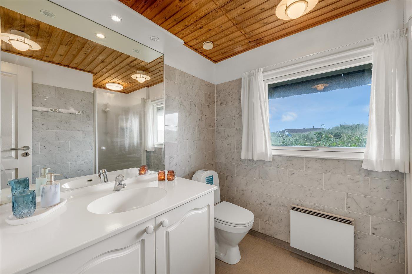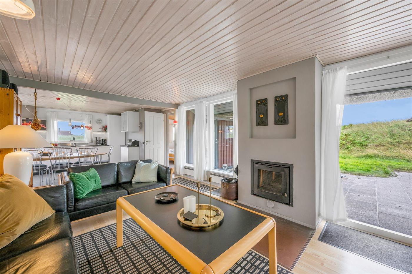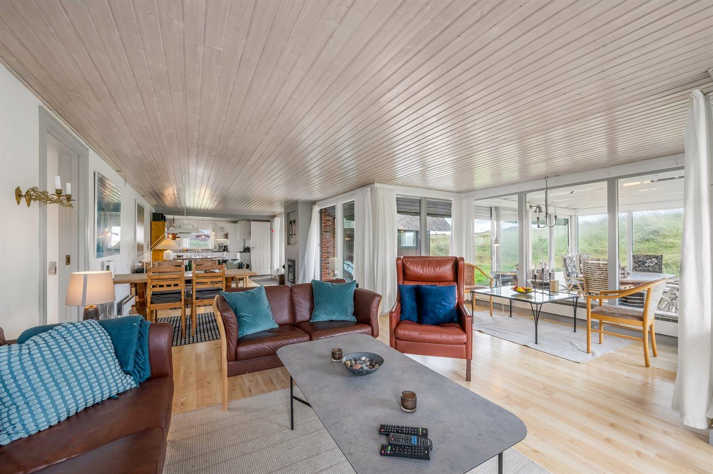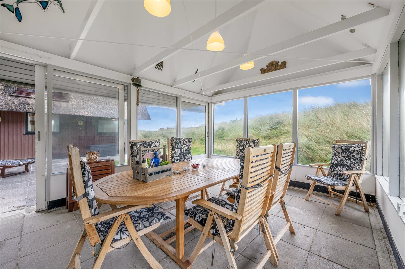 Unikt, rummeligt sommerhus beliggende på en meget stor klitgrund i første række op til fredningslinien direkte til Vesterhavet med udsigt til både hav og fjord fra grunden. På grunden er anlagt en stor gårdsplads med rigelig plads til parkering i god afstand fra vejen. Vest for huset ned mod stranden ligger et stort område velegnet til boldspil m.m. Huset er opført i gammel bondehusstil med stråtag og senere udvidet i samme stil med integreret overdækket og lukket terrasse. Huset er løbende moderniseret, og består af to sidefløje forbundet med hovedfløjen. Mellem fløjene er anlagt en sydvendt solgård. Terrassen kan åbnes til/fra solgården med skydedøre. Huset er velegnet til 2 familier i hver sin fløj og med fællesareal i hovedfløjen. Nærmeste indkøbsområde er Søndervig, som befinder sig få minutters kørsel (ca. 2 km) fra huset. Her findes et bredt udvalg af spændende butikker, restauranter samt golfbane.