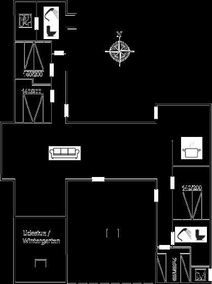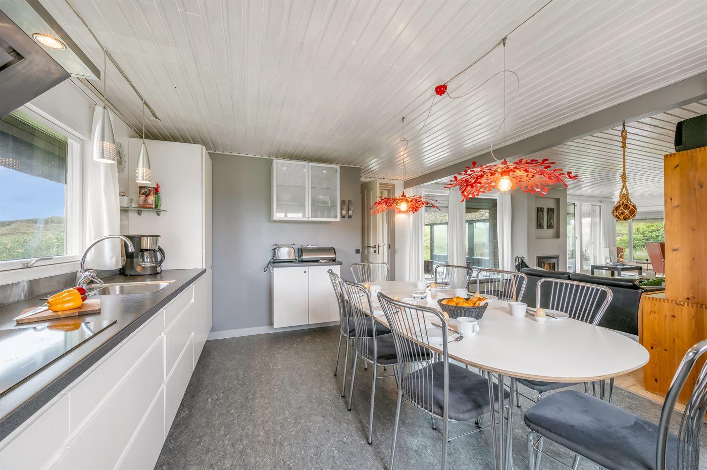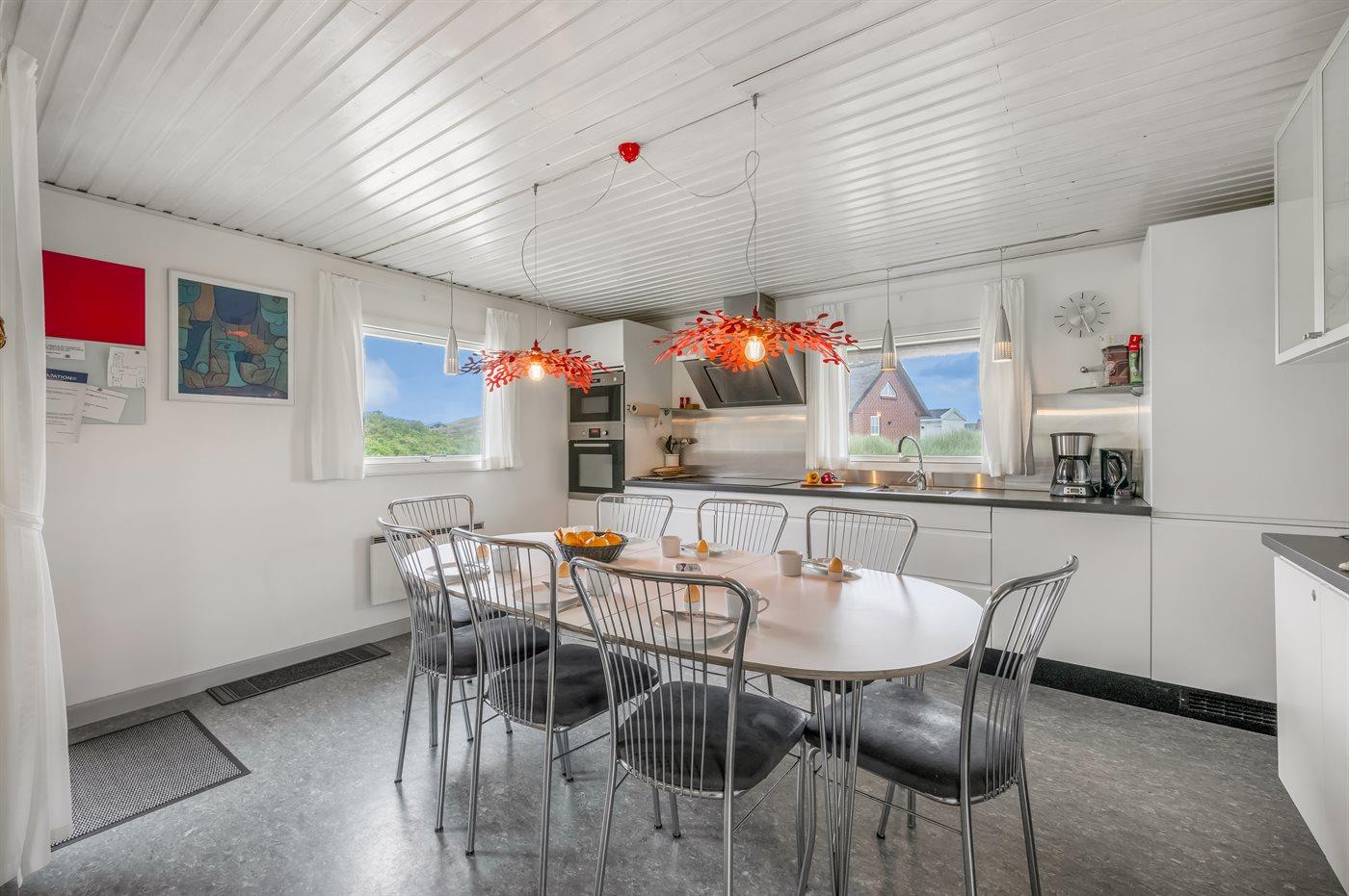 Køkkenet er udstyret med 1 køleskab. Der er 4 induktionskogeplader, varmluftovn, mikrobølgeovn samt opvaskemaskine.